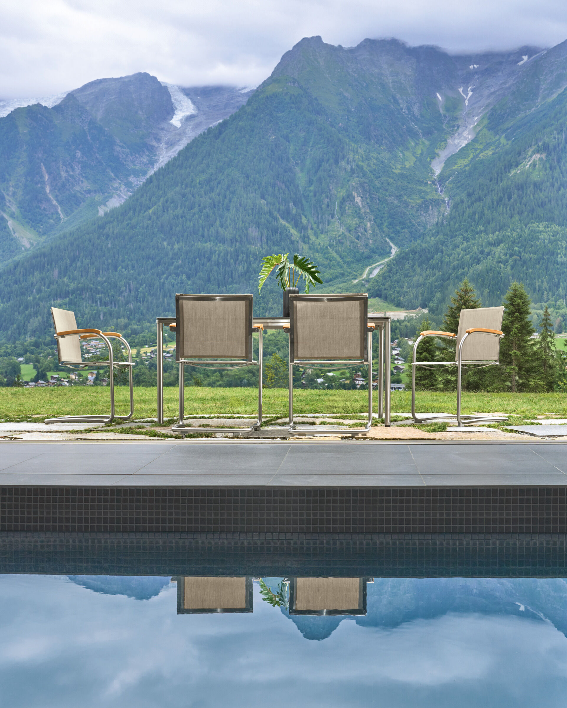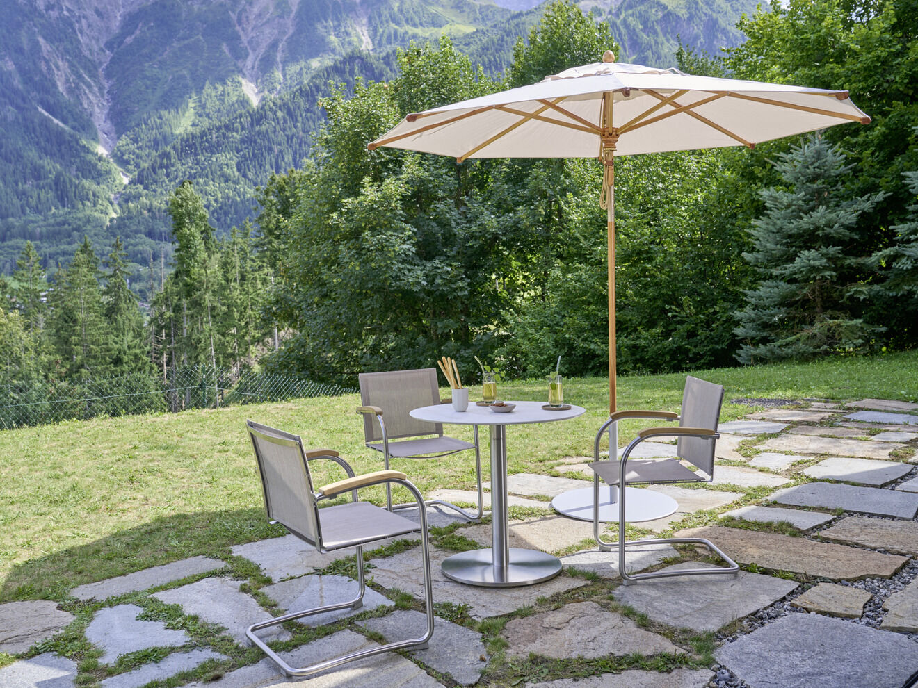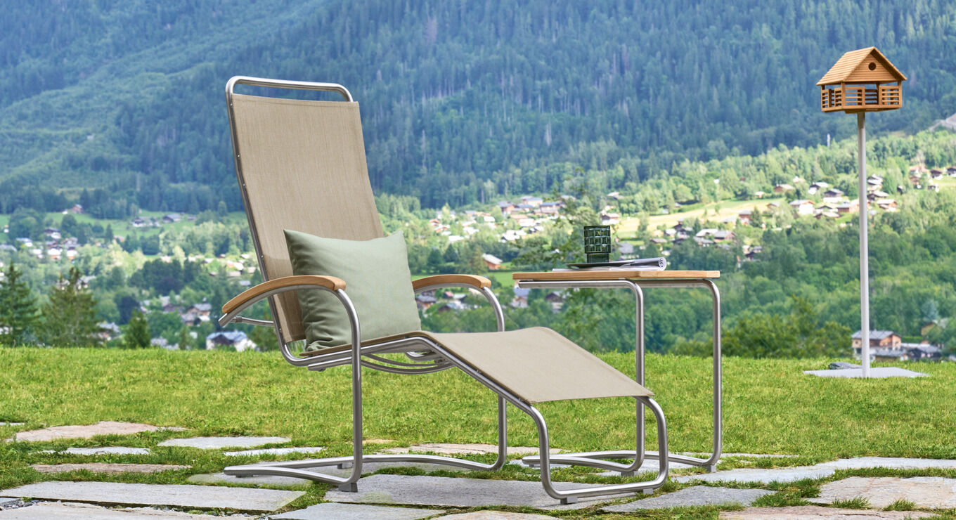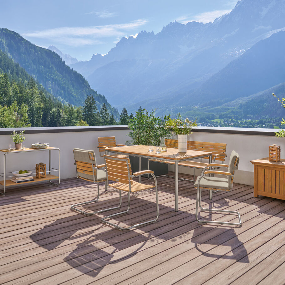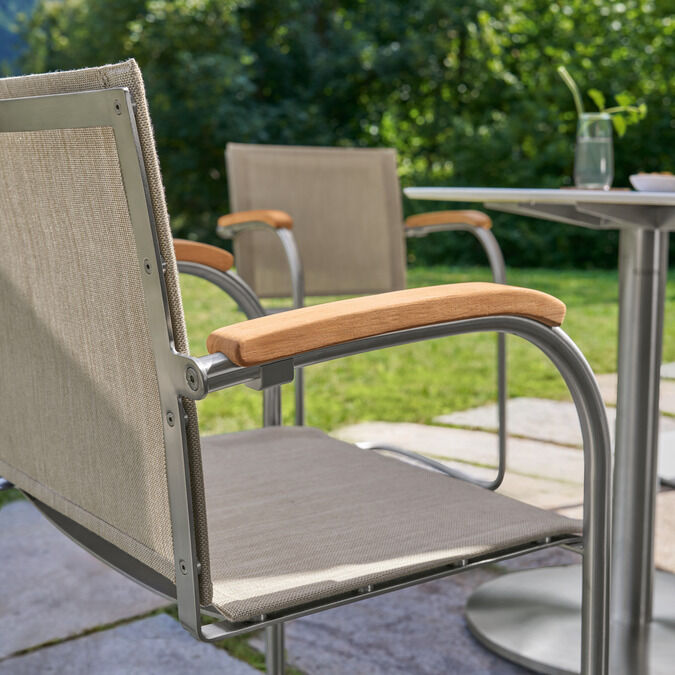 Die federnde Verbindung aus hochwertigem Polymergewebe und satiniertem Edelstahl ermöglicht ein einzigartiges Sitzerlebnis. Die straffe, überraschend anschmiegsame Gewebebespannung verspricht spürbaren Komfort, der mit Auflagen noch potenziert werden kann. Armlehnen aus handschmeichelnd gewölbtem Teakholz sind eine bewusste Reminiszenz an das Vorbild des modernen Gartenstuhls – an den zeitlosen Bolero Freischwinger Teak.