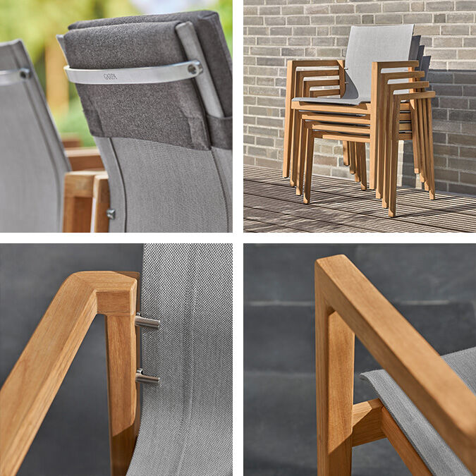 Geradlinige Armlehnstühle bringen bequeme Gelassenheit in urbane Kulissen, mediterrane Gärten oder auf englischen Rasen. Wer Platz nimmt, wird berührt von der Wärme des Teakholzes und bekommt willkommene Rückendeckung durch ein fühlbar sanftes Gewebe. Kanten und Übergänge sind aufwendig geschliffen. Die Sitzschalen scheinen über dem Gestell zu schweben, von einem Edelstahlrahmen nahezu unsichtbar gehalten.