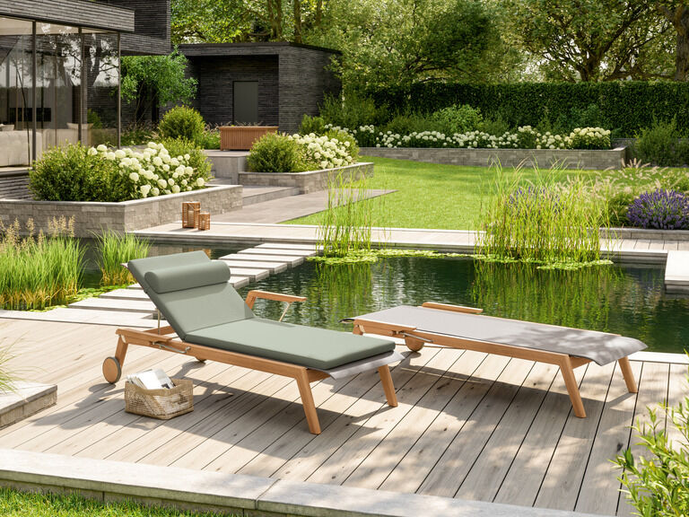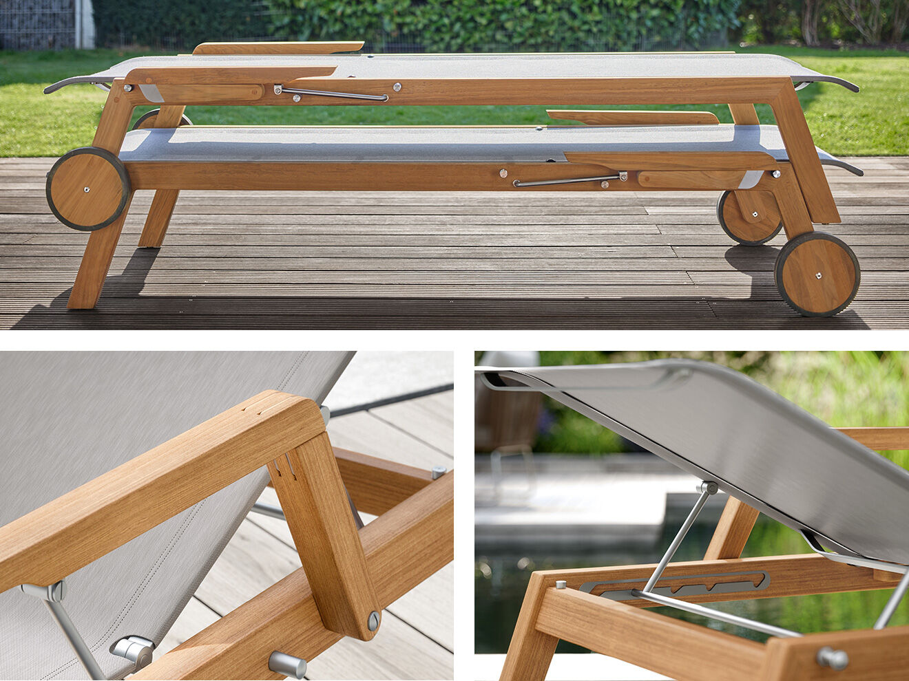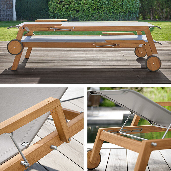 Das Teakgestell trägt einen Edelstahlrahmen mit Polymerbespannung. Für den Einstieg werden die Armlehnen nach hinten geklappt. Das Rückenteil, wie bei den Stühlen mit einem Edelstahlbügel als konstruktivem Designelement, ist fünffach verstellbar. Auf Rädern rollt die Liege in Position, stapeln lässt sie sich auch.