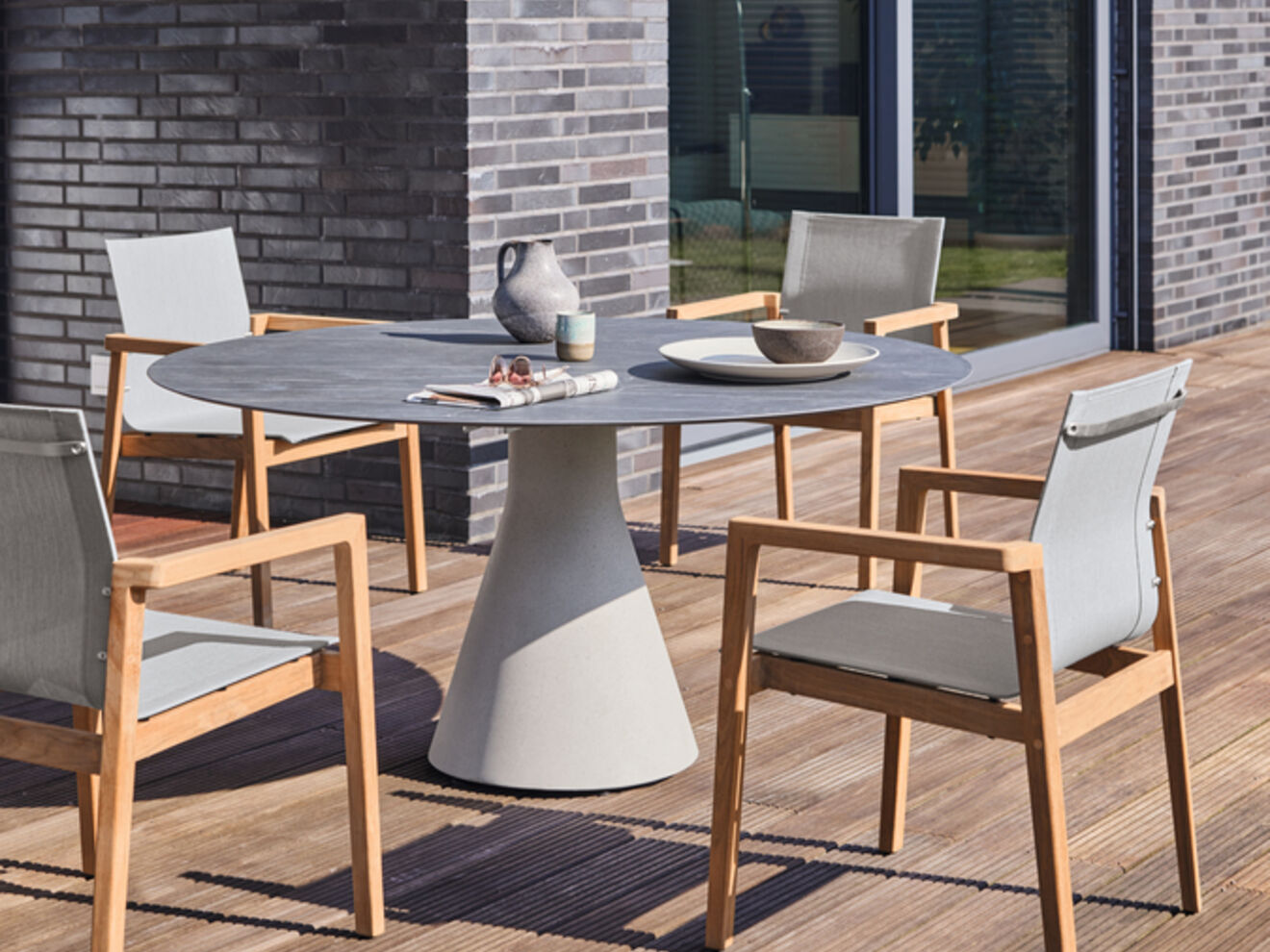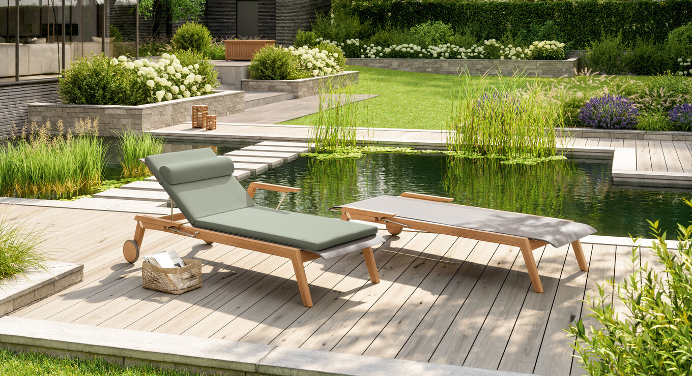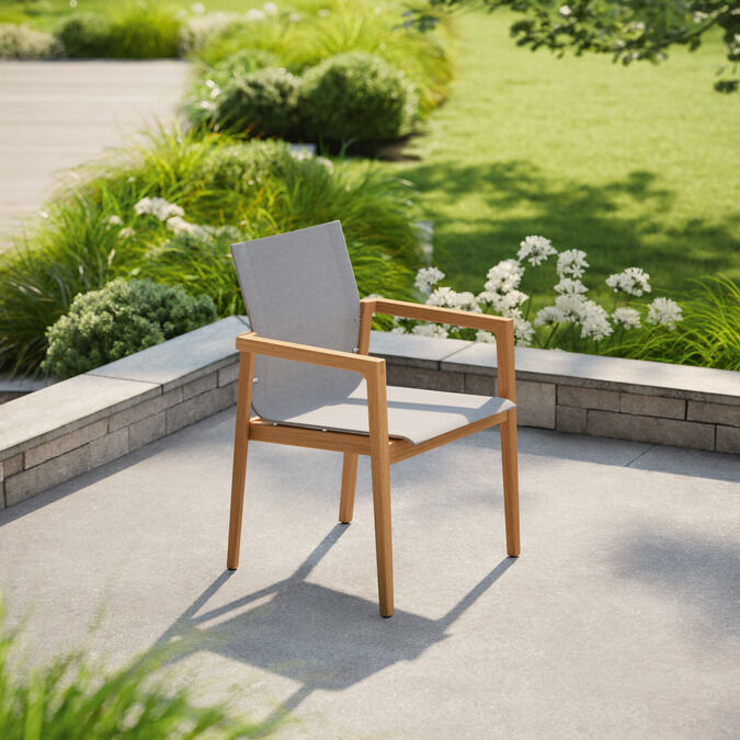 Auf der sonnengefluteten Terrasse kombinieren klassisches Teak und modernes Gewebe ihre Vorzüge. Armlehnstühle mit grafisch anmutender Silhouette versprechen ein erhebendes Gefühl.