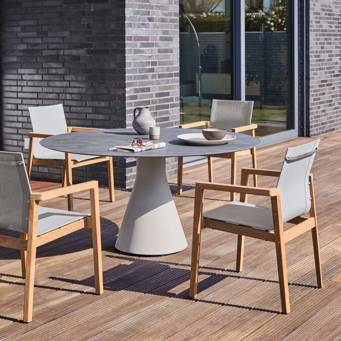 Gemeinsames Merkmal der runden Namur Tische ist der konisch geformte Mittelfuß, der angenehme Beinfreiheit gewährt. Die gelungene Materialkombination aus Leichtbeton mit einer Keramikplatte setzt nicht nur Teak und Edelstahl in eine neue spannende Beziehung. Sie schafft auch eine harmonische Verbindung mit vielen weiteren Kollektionen.
