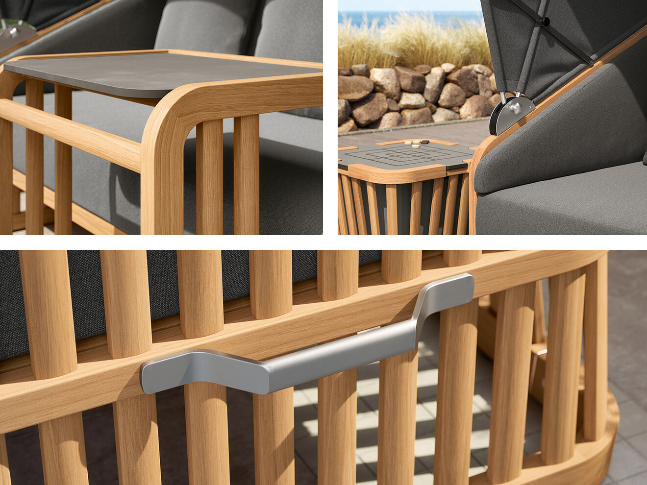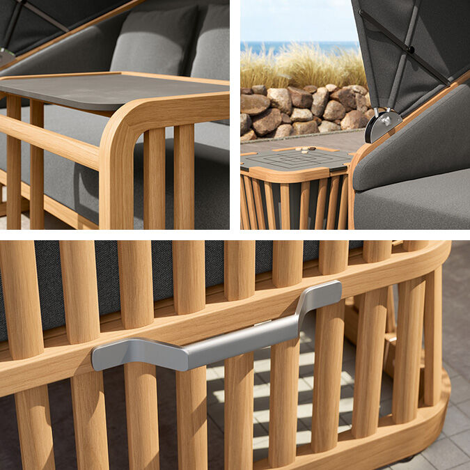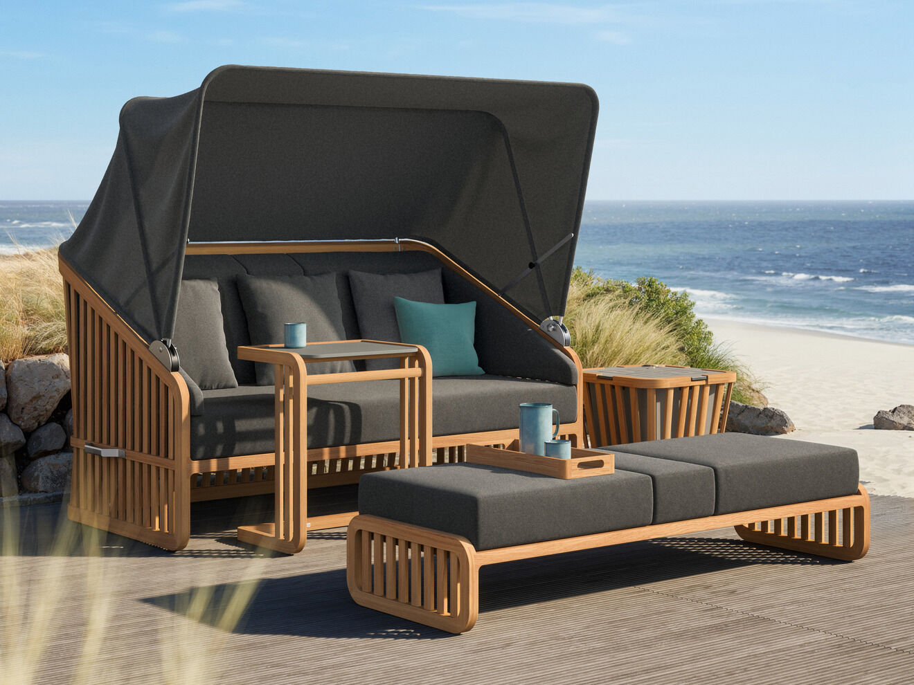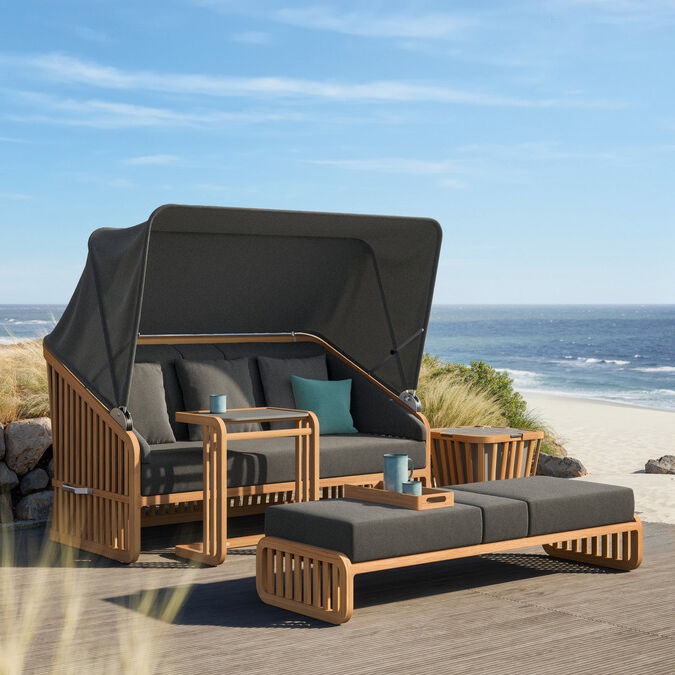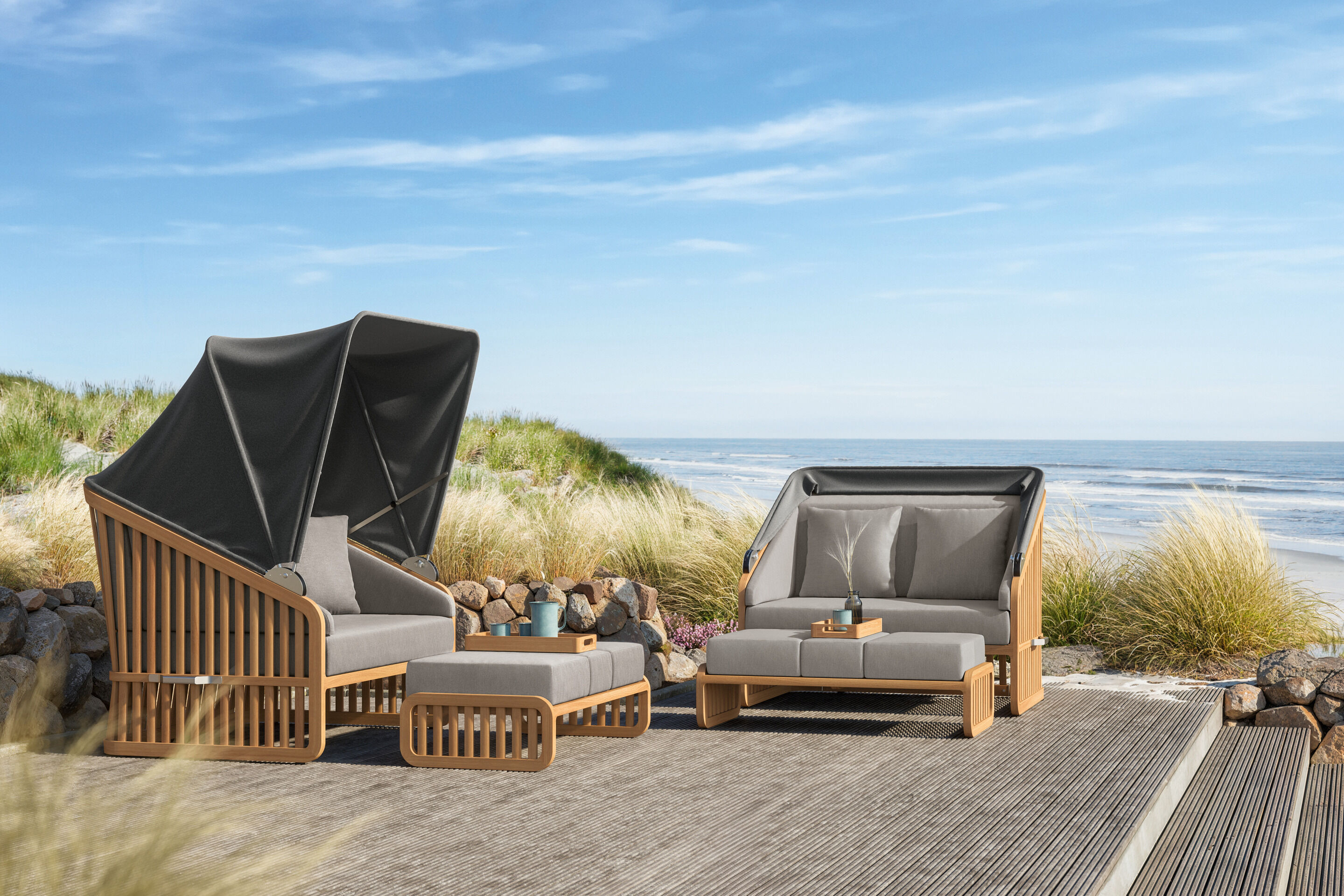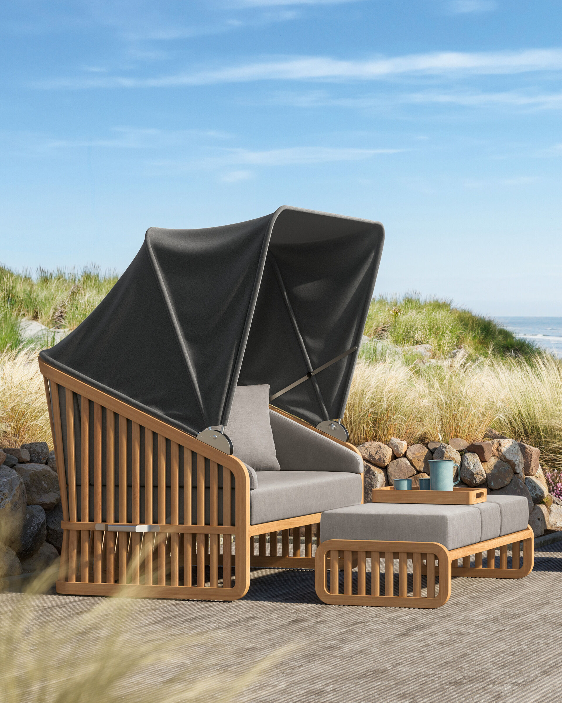 Sehnsuchtsziel und Rückzugsort zugleich: Der Solitär aus Teak interpretiert den Strandkorb neu und entführt auf eine luxuriöse Entdeckungsreise zu sich selbst.