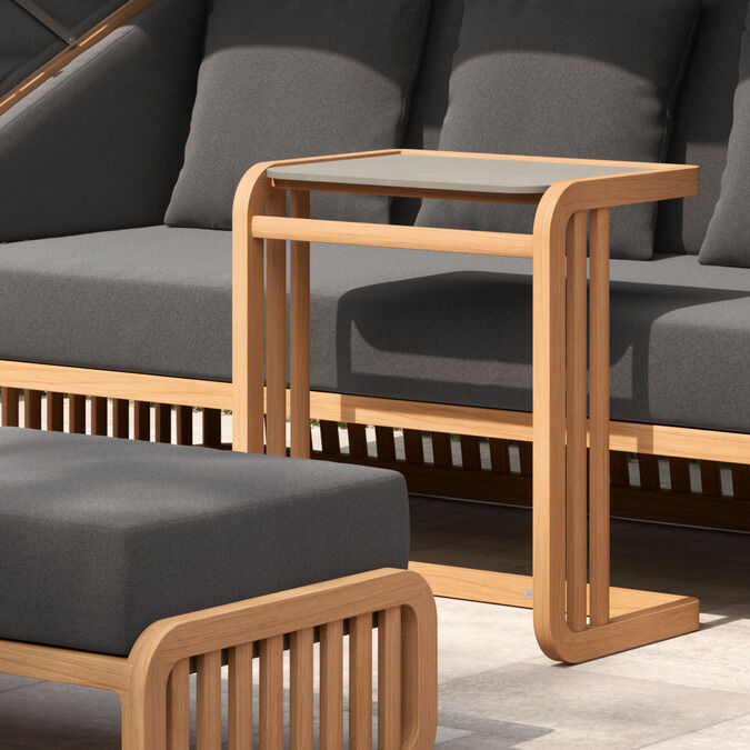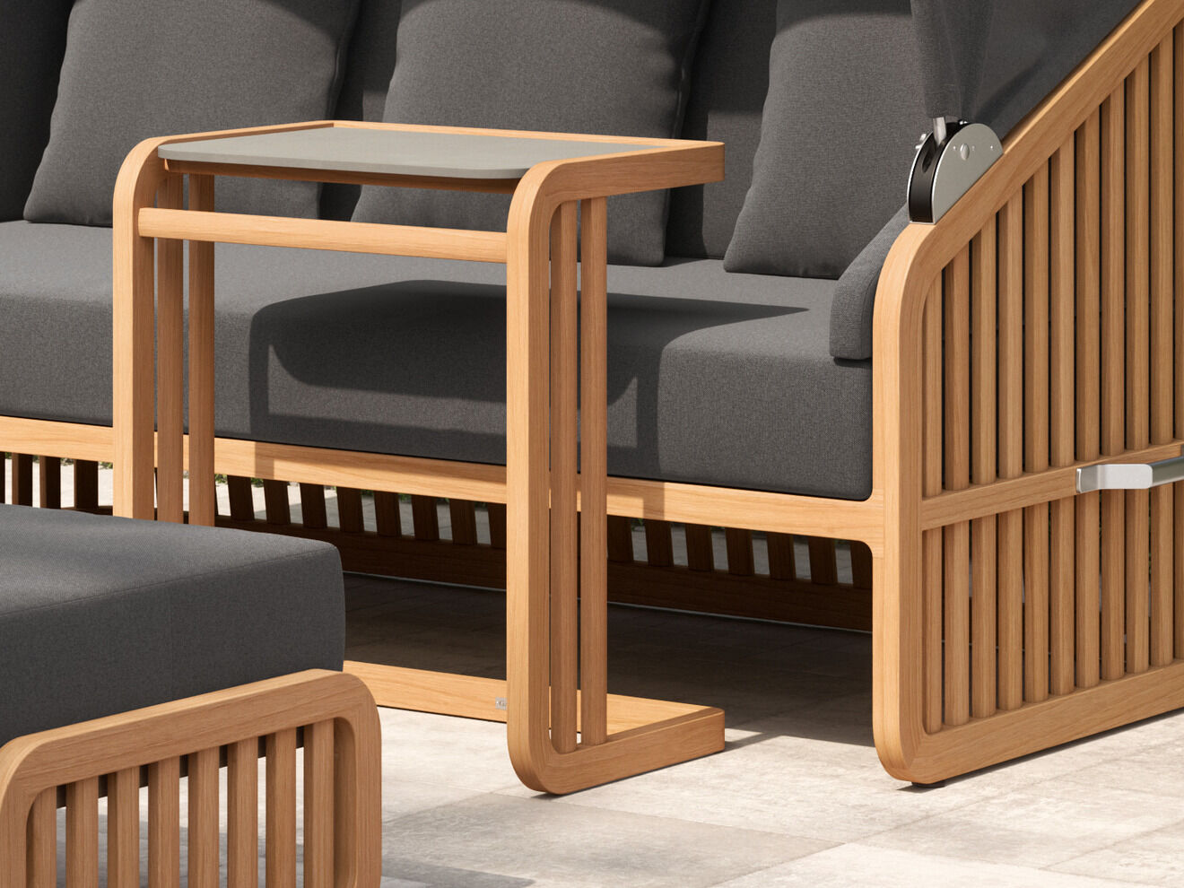 Er ist die optimale Ergänzung zum Newcastle Set. Wird der Strandkorb als Homeoffice genutzt, dient der Beistelltisch als praktische Ablagefläche für Laptop, Smartphone und Notizbuch, während er in wohlverdienten Ruhepausen spannende Literatur und leckere Snacks bereithält. Auch das Getränk Ihrer Wahl findet seinen Platz auf der Tischplatte aus Kunstharz. Die gestalterischen Parallelen zum Rack sind unverkennbar, doch ist der Beistelltisch mit einem Teakgestell in C-Form noch flexibler, da er sich bequem sowohl unter die Sitzfläche als auch unter die Bank ziehen lässt.