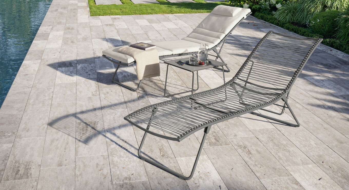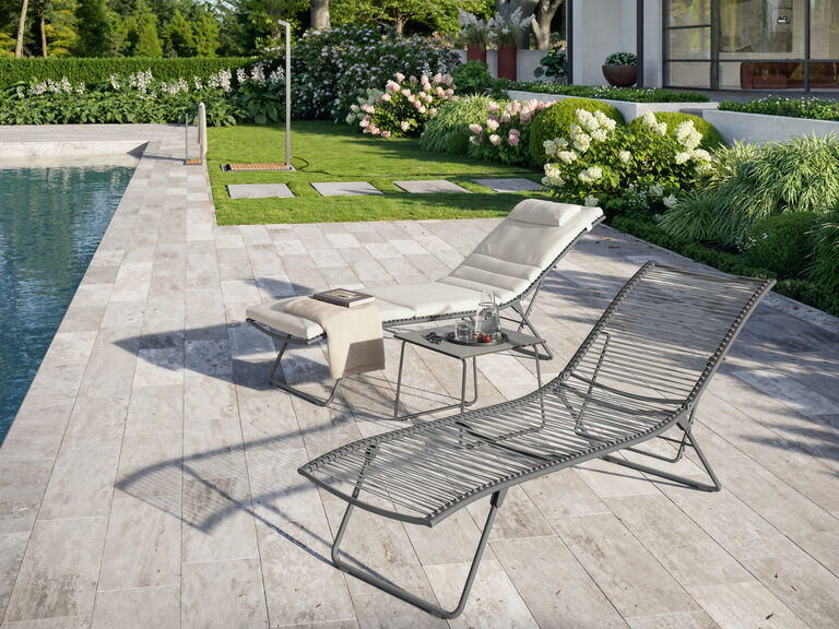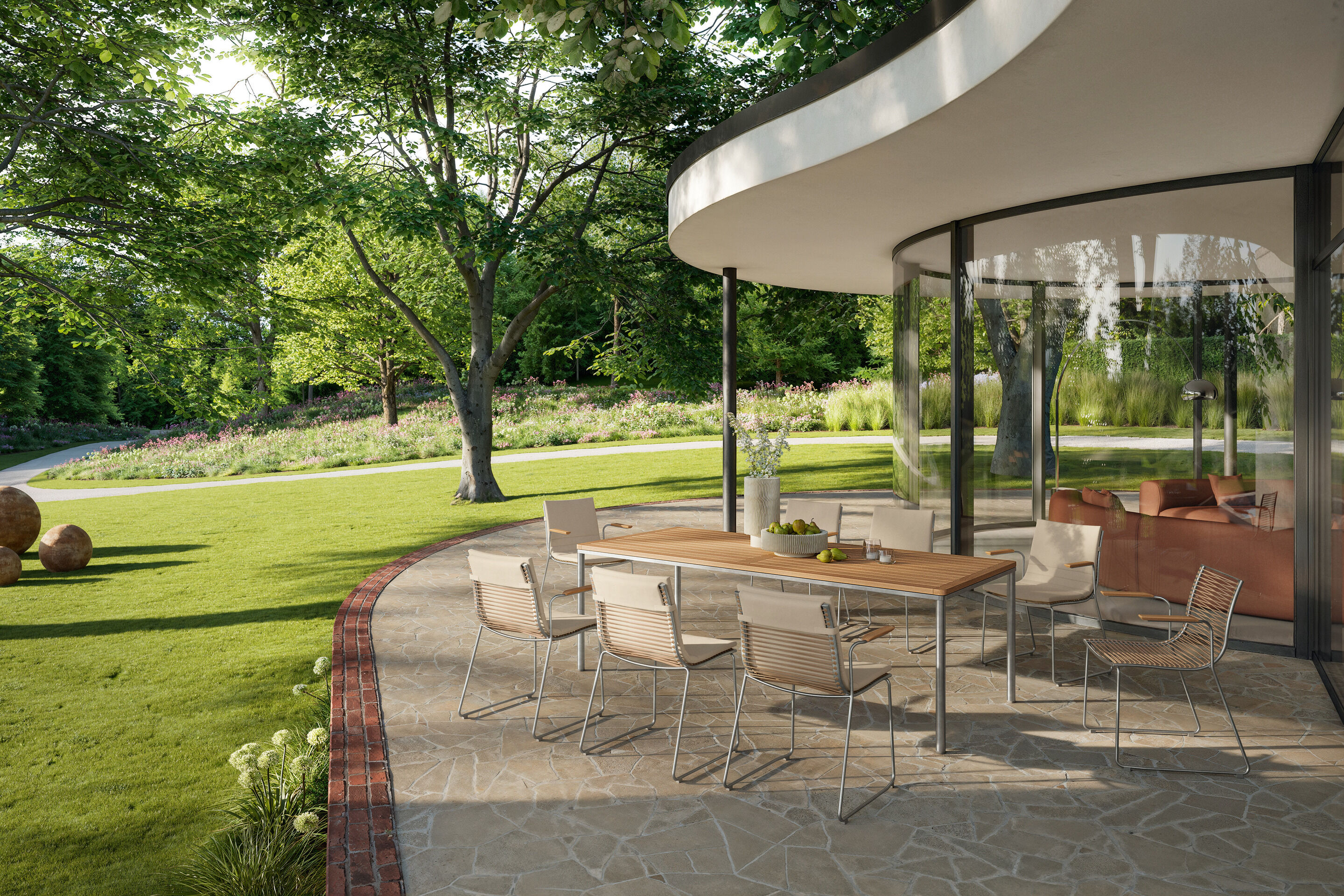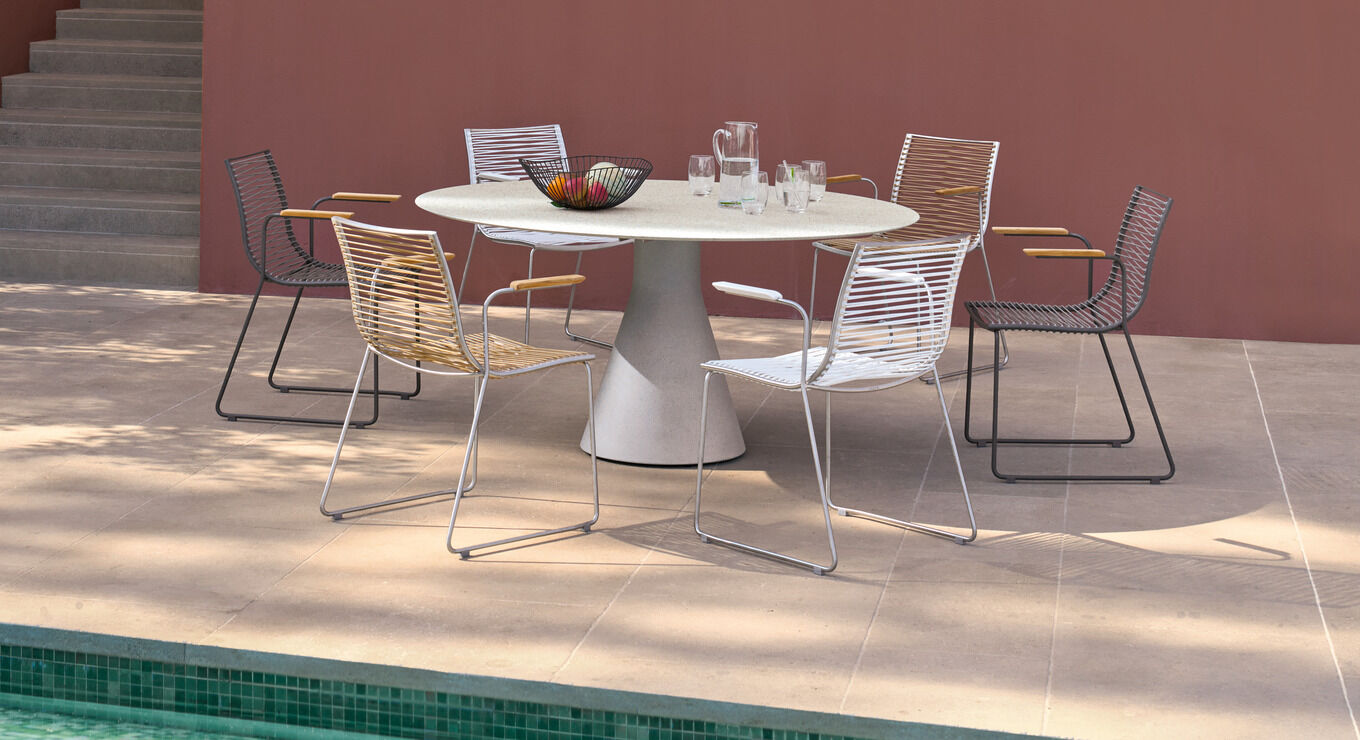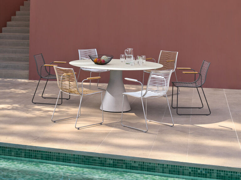 Tische in vielen Größen, gebürstet oder mit graphitgrauer Pulverbeschichtung, empfehlen sich als ideale Begleiter für Pan. Feste oder ausziehbare Varianten der exklusiven Portland Tische bilden großzügige Ensembles, Ronda Mittelfußtische bieten angenehm viel Beinfreiheit. Die Tischplatten aus hochwertigem Teak oder grauem Kunstharz ermöglichen harmonische Kombinationen, für Ronda stehen auch weiße Steinkeramikplatten mit marmorgleicher Maserung zur Wahl.