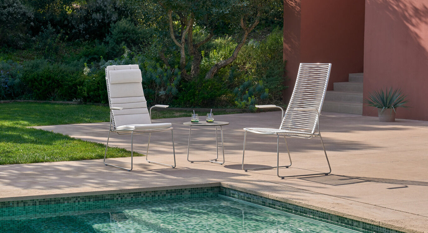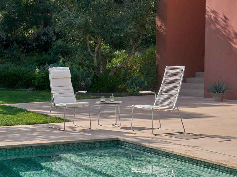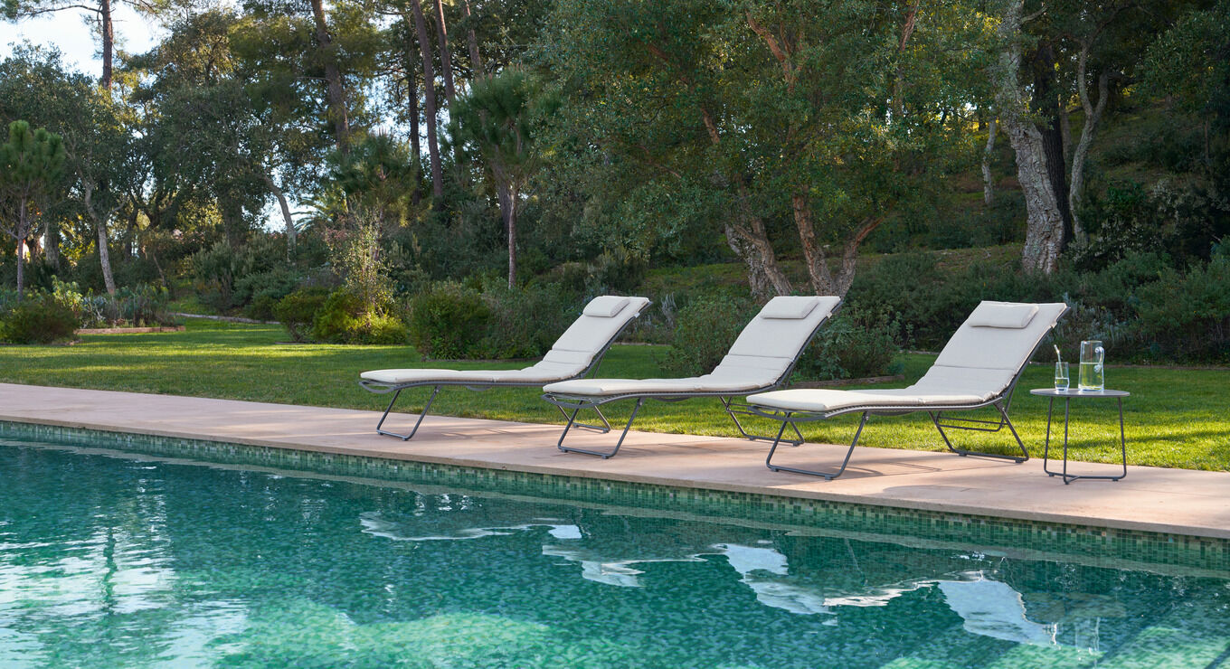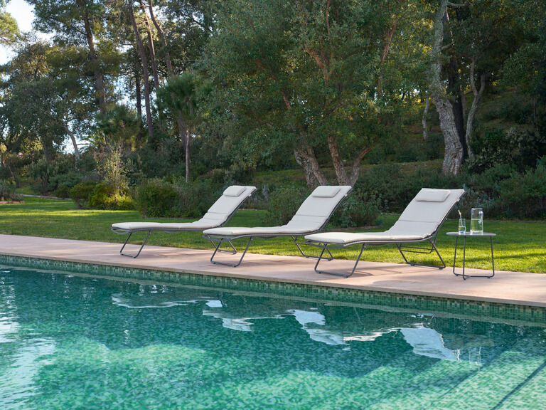Ein schwungvoller Federstrich diente als Vorbild für eine Liege, die sich auf Wesentliches konzentriert und nichts als Ruhe verheißt. Ihre Rückenlehne hat fünf einstellbare Stufen, nach dem Sonnenbad kann man sie flach zusammenklappen.