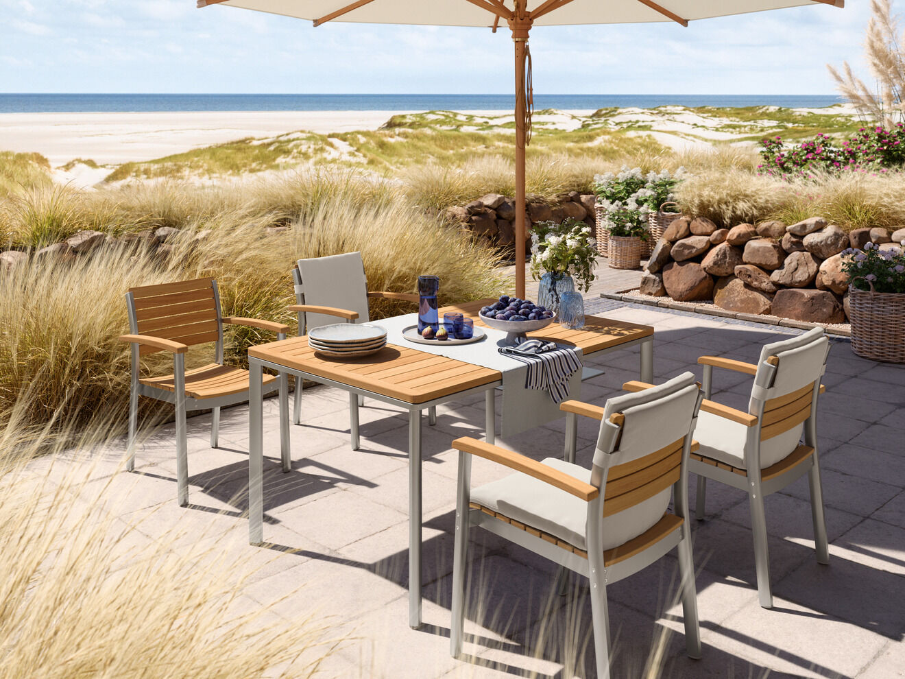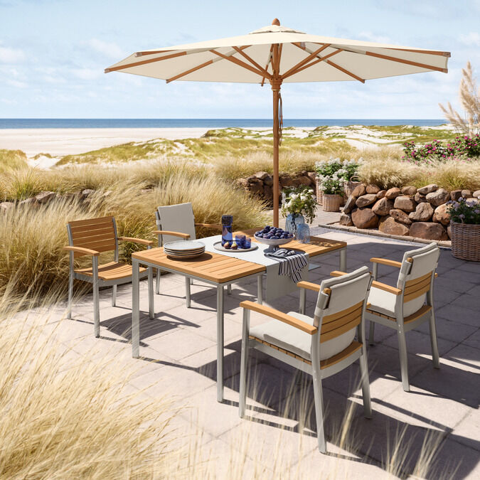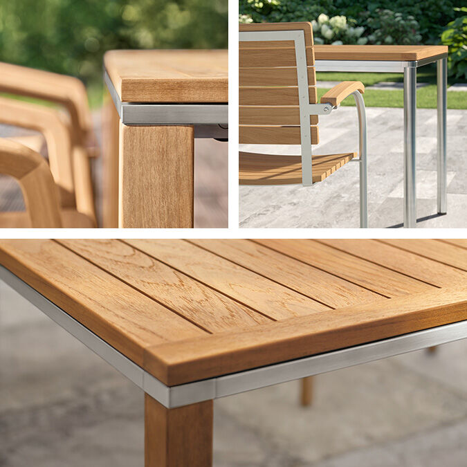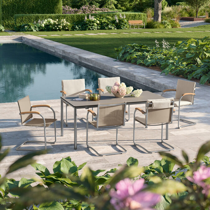 Portland Tische haben Beine aus Teak, Edelstahl, graphitgrau pulverbeschichtetem Edelstahl oder eloxiertem Aluminium. Insbesondere die Armlehnstühle, Stühle und Freischwinger der Kollektionen Pan und Bolero passen perfekt zu Portland. Einladende Sitzgruppen verspricht auch die Kombination von Portland Silk und Monterey Silk.