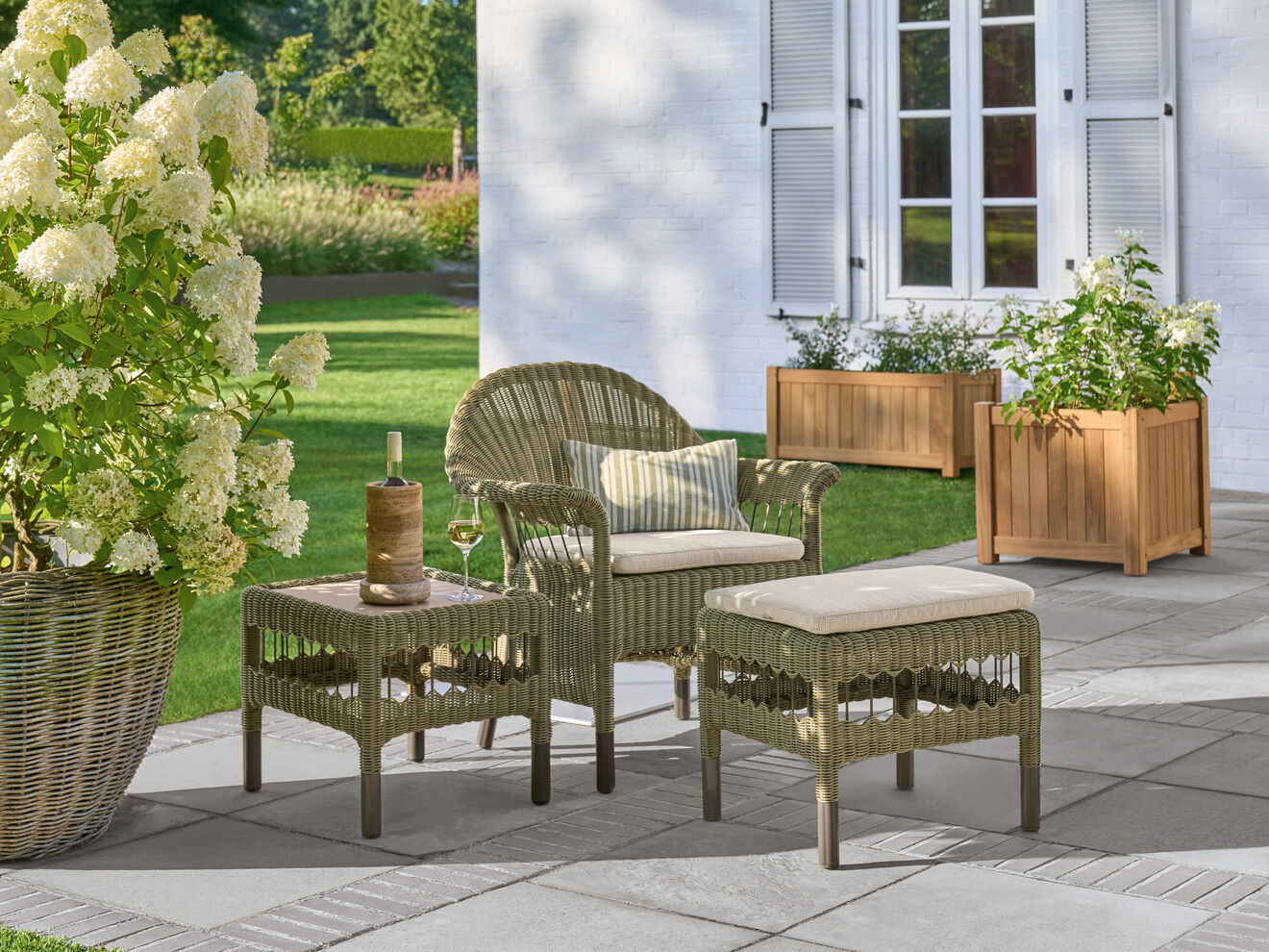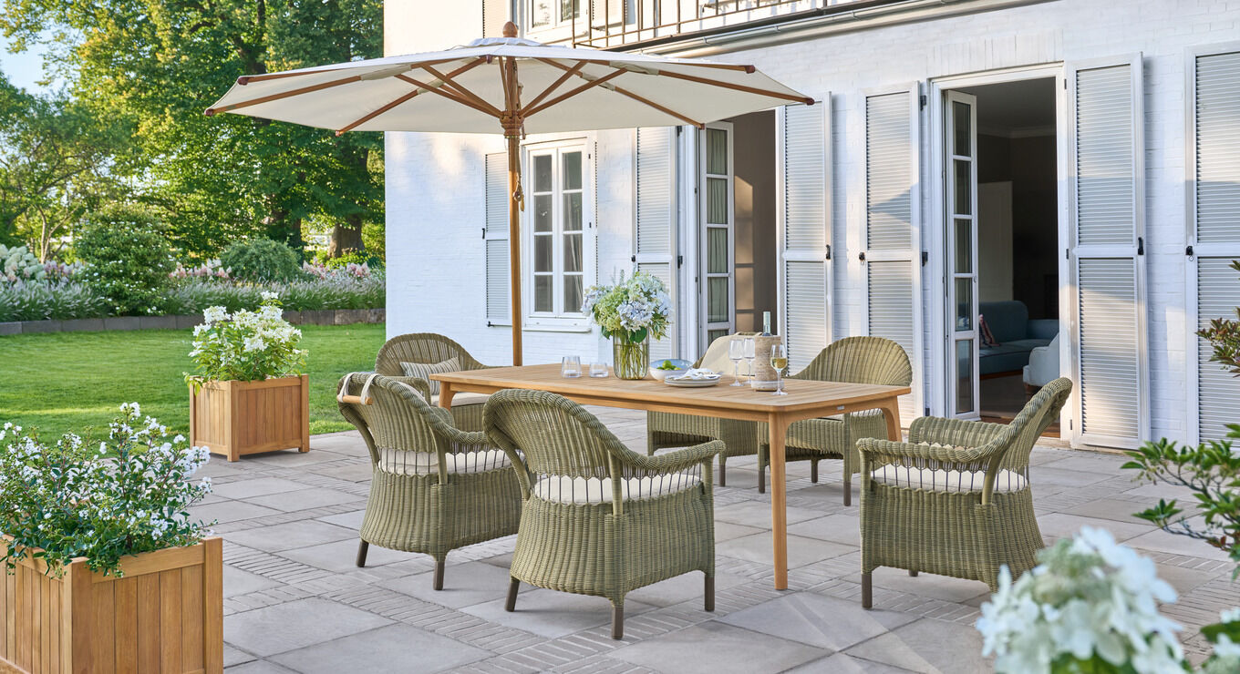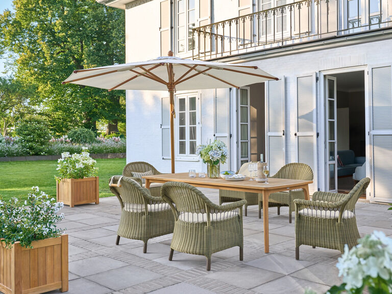Armlehnstuhl, Hocker und Beistelltisch ergeben ein gemütliches Ensemble, das dazu einlädt, ein Glas Wein zu genießen. Kleine Schirme wie das Ligura Modell sorgen auf Wunsch für Schatten. Zudem empfehlen sich die Geflechtmöbel der Torenso Kollektion für stimmige Kombinationen mit den Ashford Pflanzkübeln. Aus hochwertigem Plantagenteak gefertigt, schaffen sie einen eleganten Rahmen für Sitzgruppen und Lieblingsplätze. Kombinieren Sie die Pflanzkübel in den Größen Ihrer Wahl und setzen Sie Blumen, Gräser und kleine Gehölze in Szene.