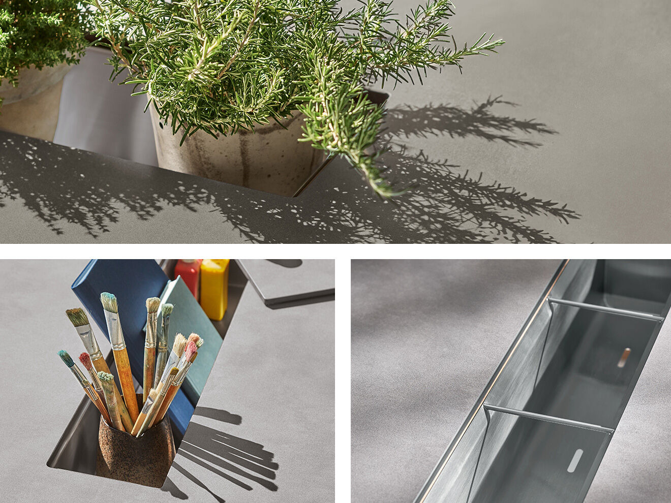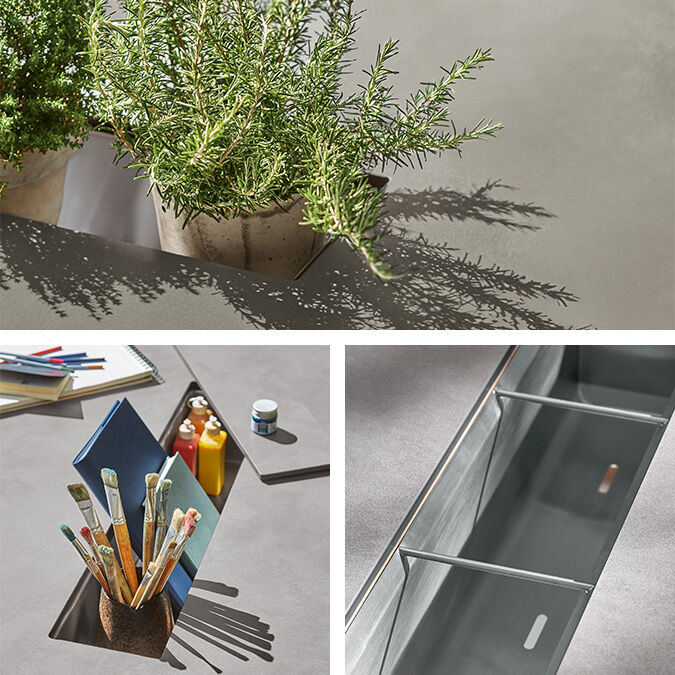Am geräumigen Tisch lässt sich spielen, malen, basteln – und ruhig auch mal kleckern. Die leicht strukturierten und ganz natürlich wirkenden grauen Oberflächen aus Kunstharz machen alles mit. Vor dem Essen verschwinden die Utensilien dann blitzschnell in einem integrierten Behälter aus Edelstahl.