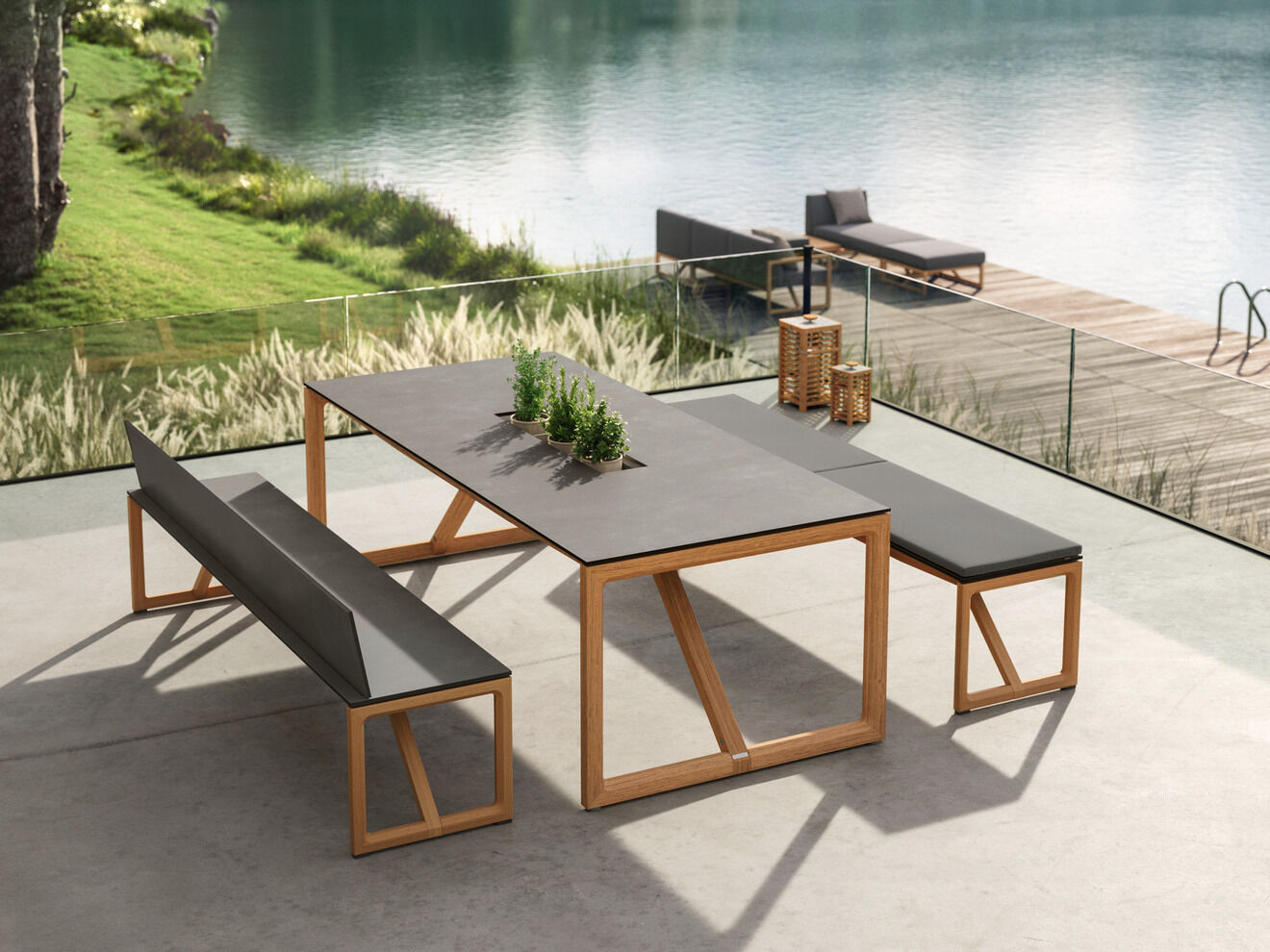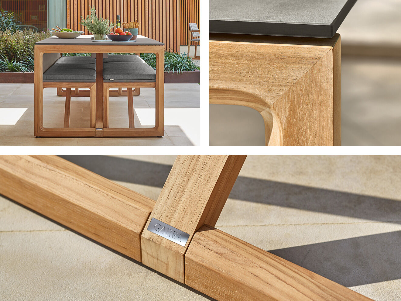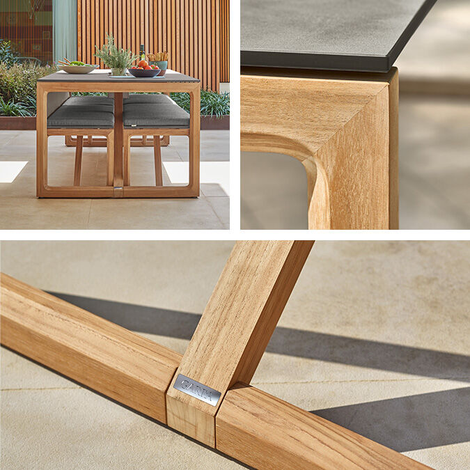 Die Bänke, mit oder ohne Lehne, gleichen in ihrer Konstruktion aus Teakholzrahmen und Kunstharzplatten dem Tisch. Nach geselligen Abenden oder bei Dauerregen können sie in voller Länge unter ihm verschwinden und bilden gemeinsam eine kompakte Quaderform.