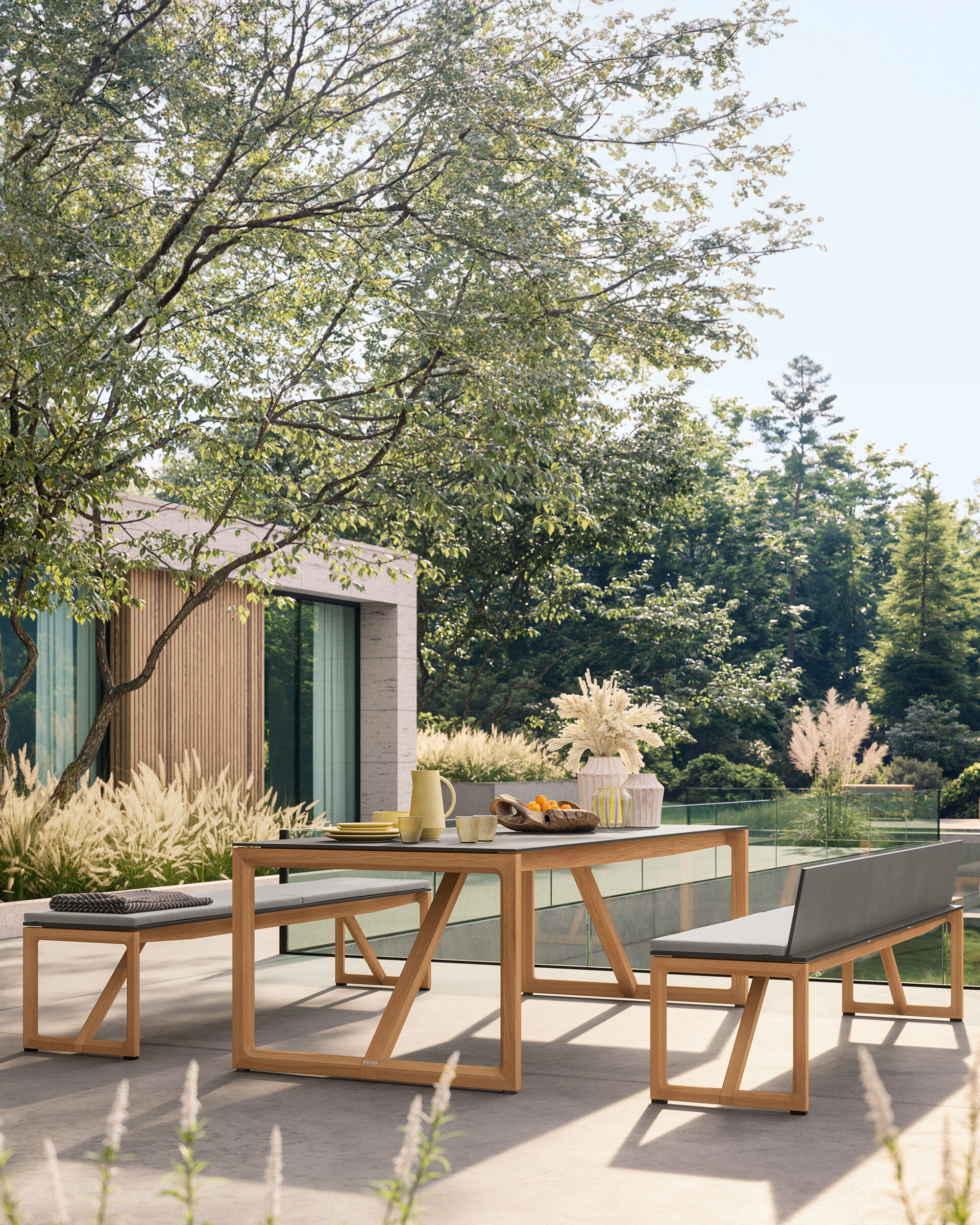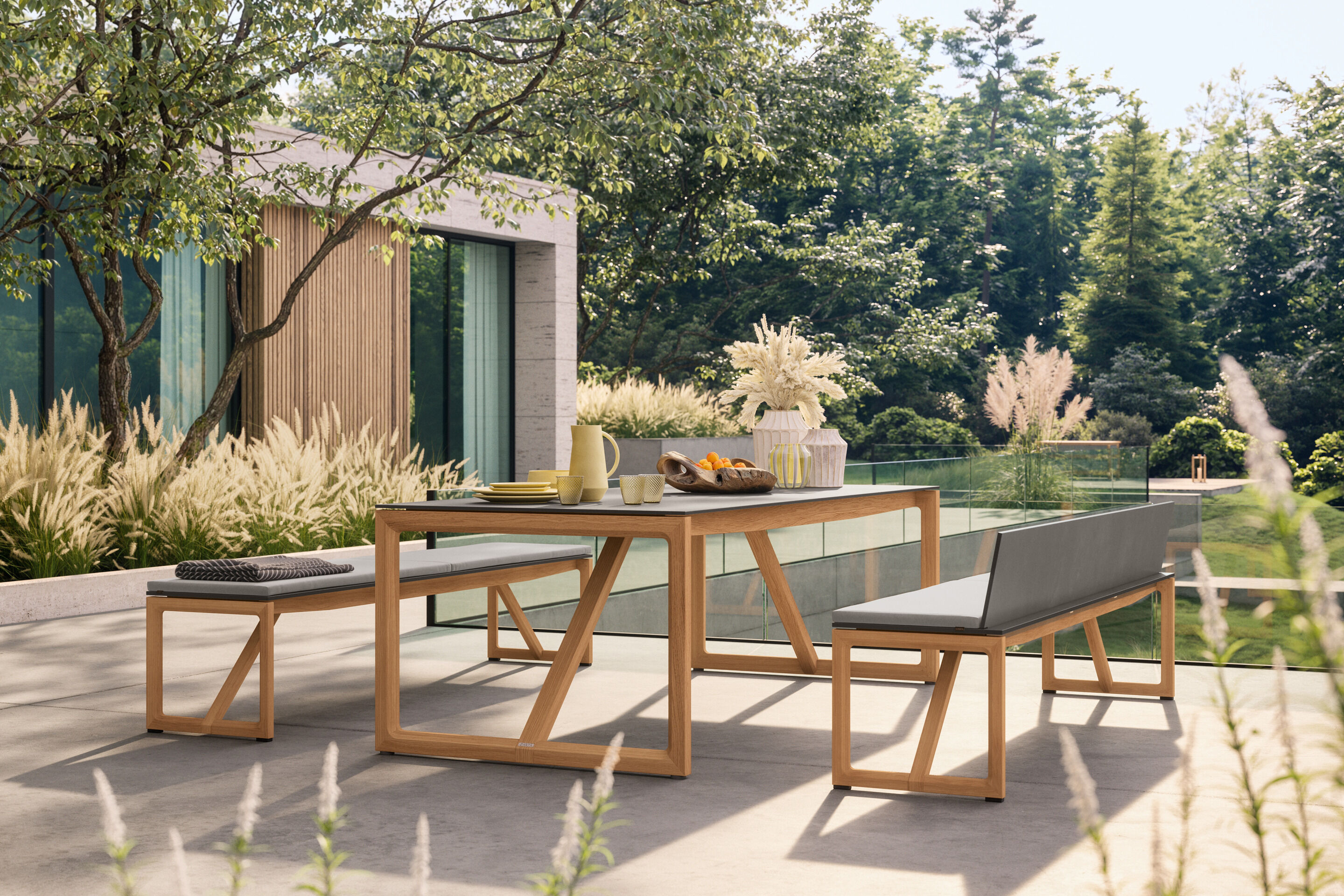 Tisch und Bänke im geradlinigen Design bieten reichlich Platz, dienen der Geselligkeit und eignen sich sogar als Spielecke. Vor allem garantieren sie Komfort, dem einfach nichts hinzuzufügen ist – höchstens ein paar Kissen.