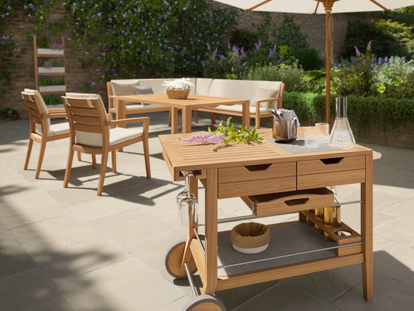 Die Dining Möbel der Valencia Kollektion eröffnen vielfältigen Gestaltungsspielraum – mit komfortablen Armlehnstühlen, einer modularen Eckbank und dem Valencia Barwagen.