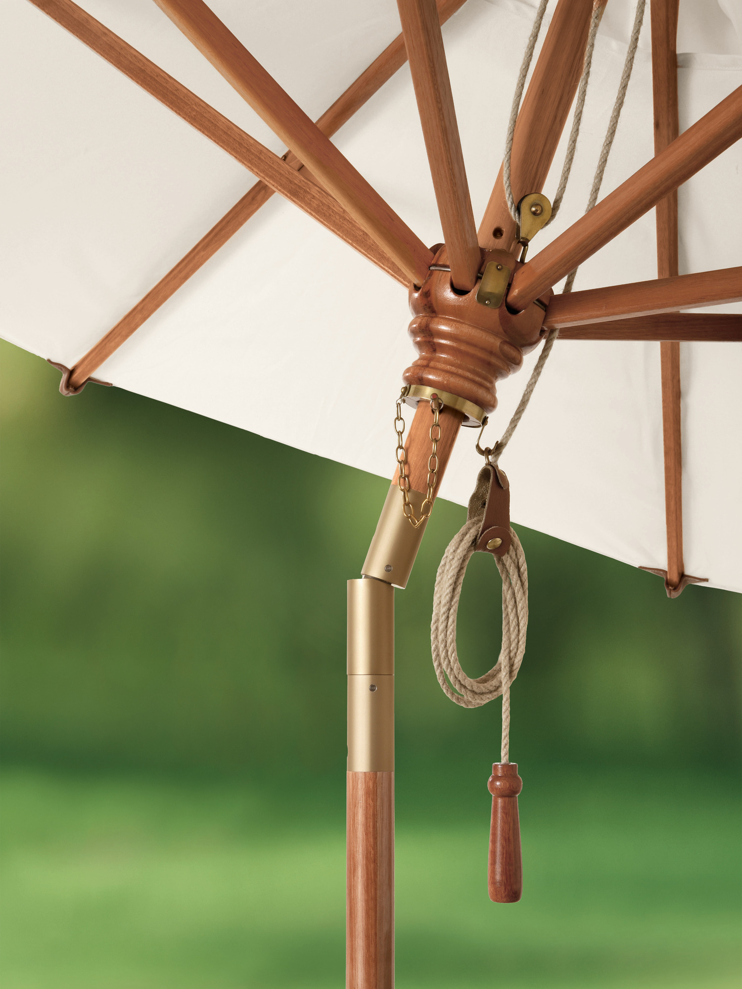 Die Liguria Bespannung wird aus leichtem, imprägniertem Polyacryl gefertigt und ist im Farbton Elfenbein erhältlich. Ihre Streben werden von braunen Ledertaschen gehalten, eine Windabzugshaube stabilisiert das Dach zusätzlich.