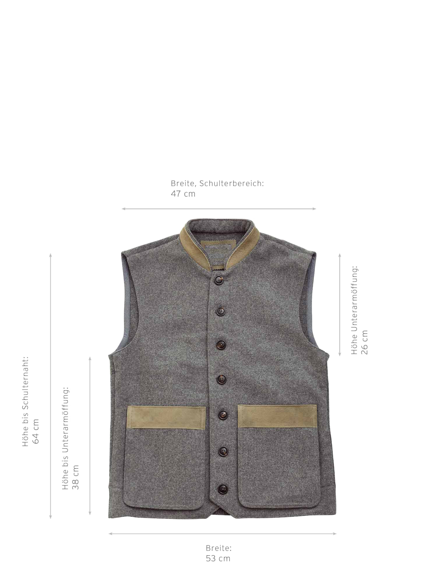 Jeweils von Naht zu Naht gemessen, hat die Lodenweste in Höhe der Schultern eine Breite von 47 cm und im Hüftbereich von 53 cm. Die von diesem bis zur Schulternaht gemessene Höhe beträgt 64 cm. Die Passform "Comfort Fit" garantiert Bewegungsfreiheit bei der Gartenarbeit und erlaubt Kombinationen mit unterschiedlichsten Kleidungsstücken. Weitere Informationen entnehmen Sie bitte dem obigen Bild zu den Maßgaben.