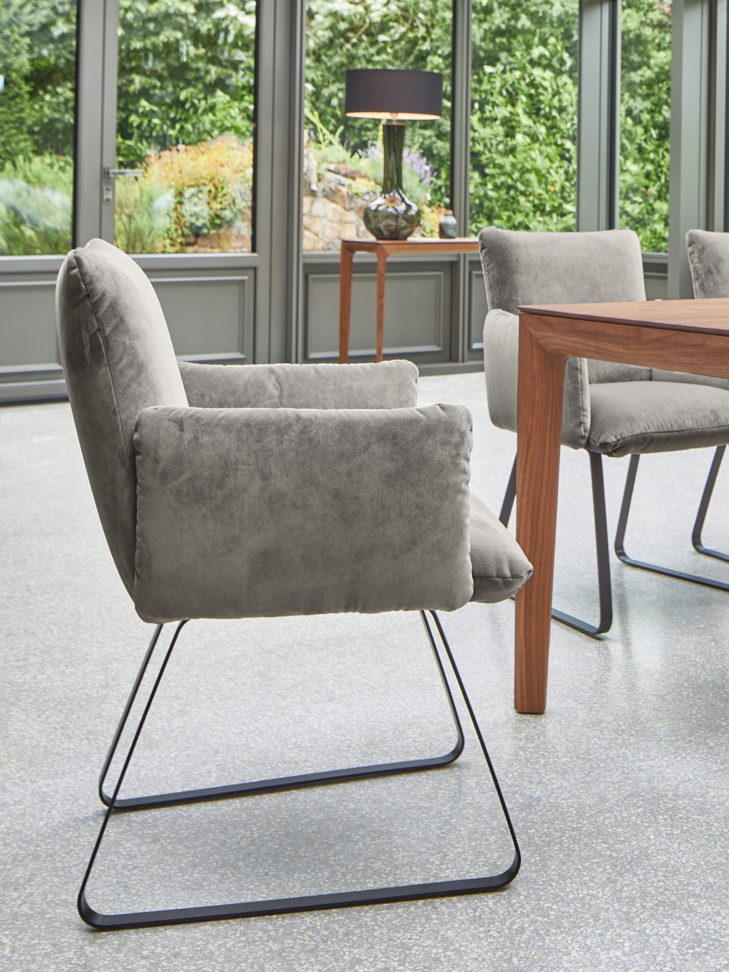 Die Mandø Armlehnstühle und Bänke machen nicht nur bei Tisch eine gute Figur. Schlanke Sitz-, Arm- und Rückenpolster unterstreichen den Eindruck zeitloser Eleganz und legerer Behaglichkeit. Im matten Schwarz des Metallgestells finden die leuchtenden Farben der Samtbezüge eine neutrale Basis. Für höchsten Komfort sorgen die perfekt geformten Rückenlehnen.