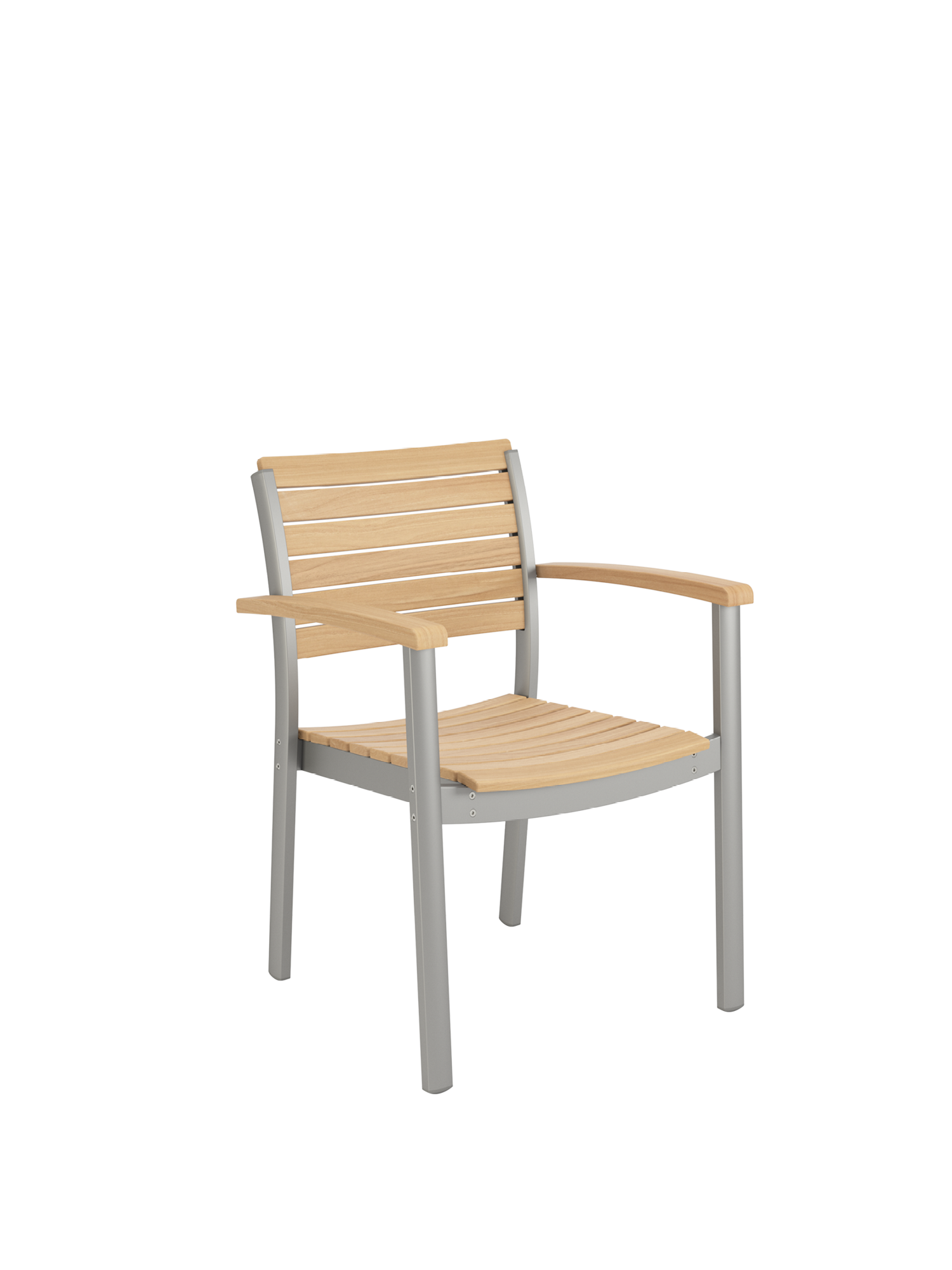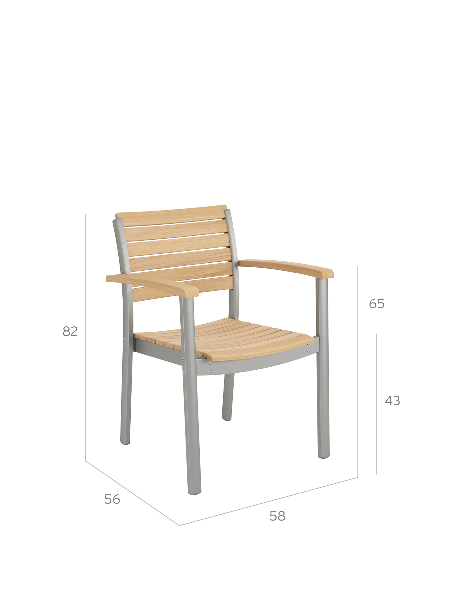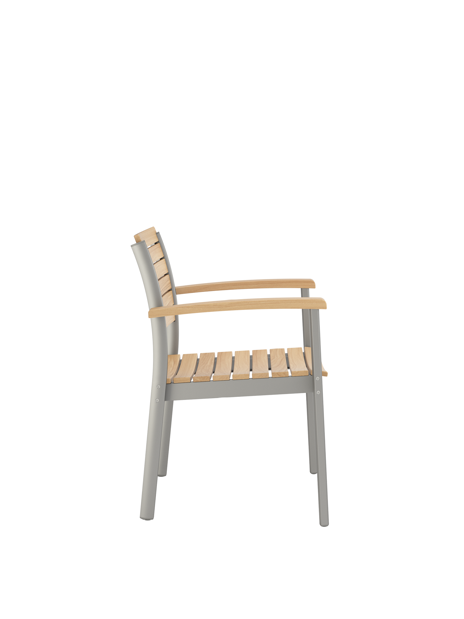 Hier werden langlebige Materialien perfekt in Szene gesetzt: Die eloxierten Profile des seidig glänzenden Aluminiumgestells umfassen passgenau die ergonomisch modellierten Teakleisten an Sitz und Rückenlehne. Und verleihen dem stapelbaren Designklassiker eine moderne Note.