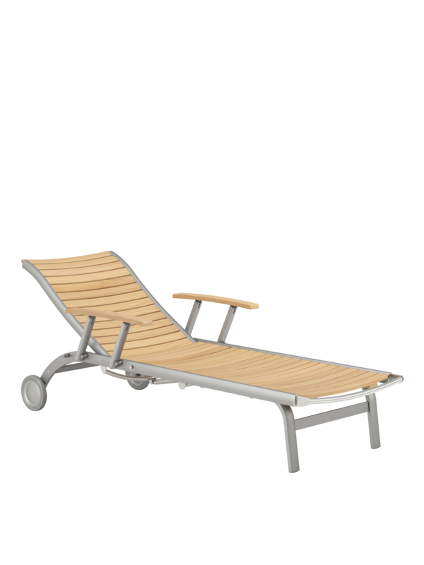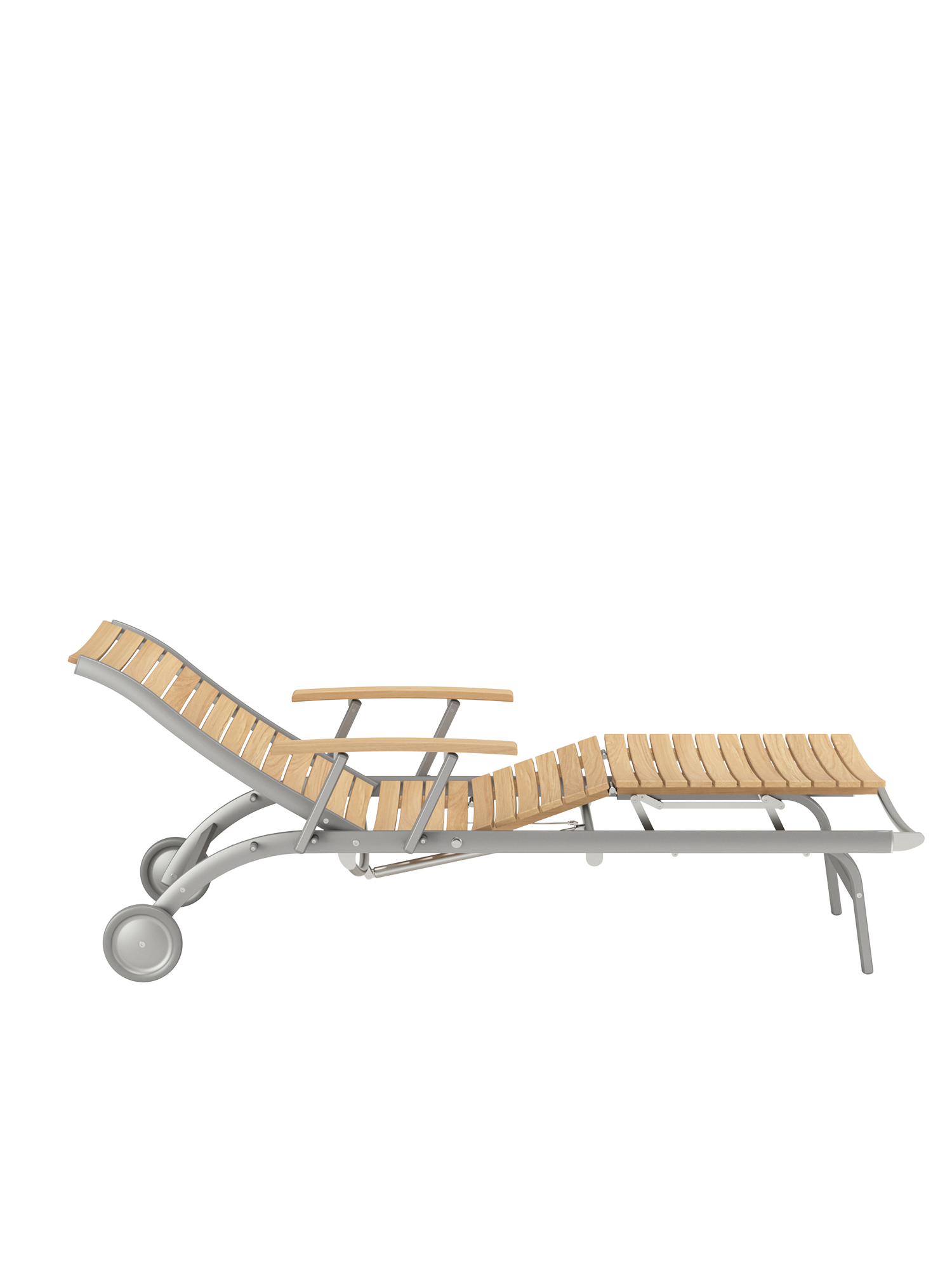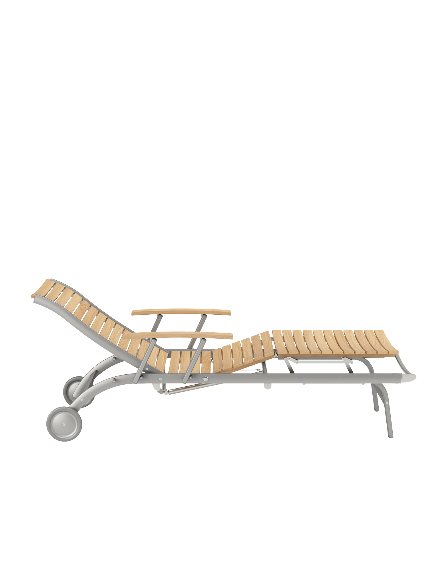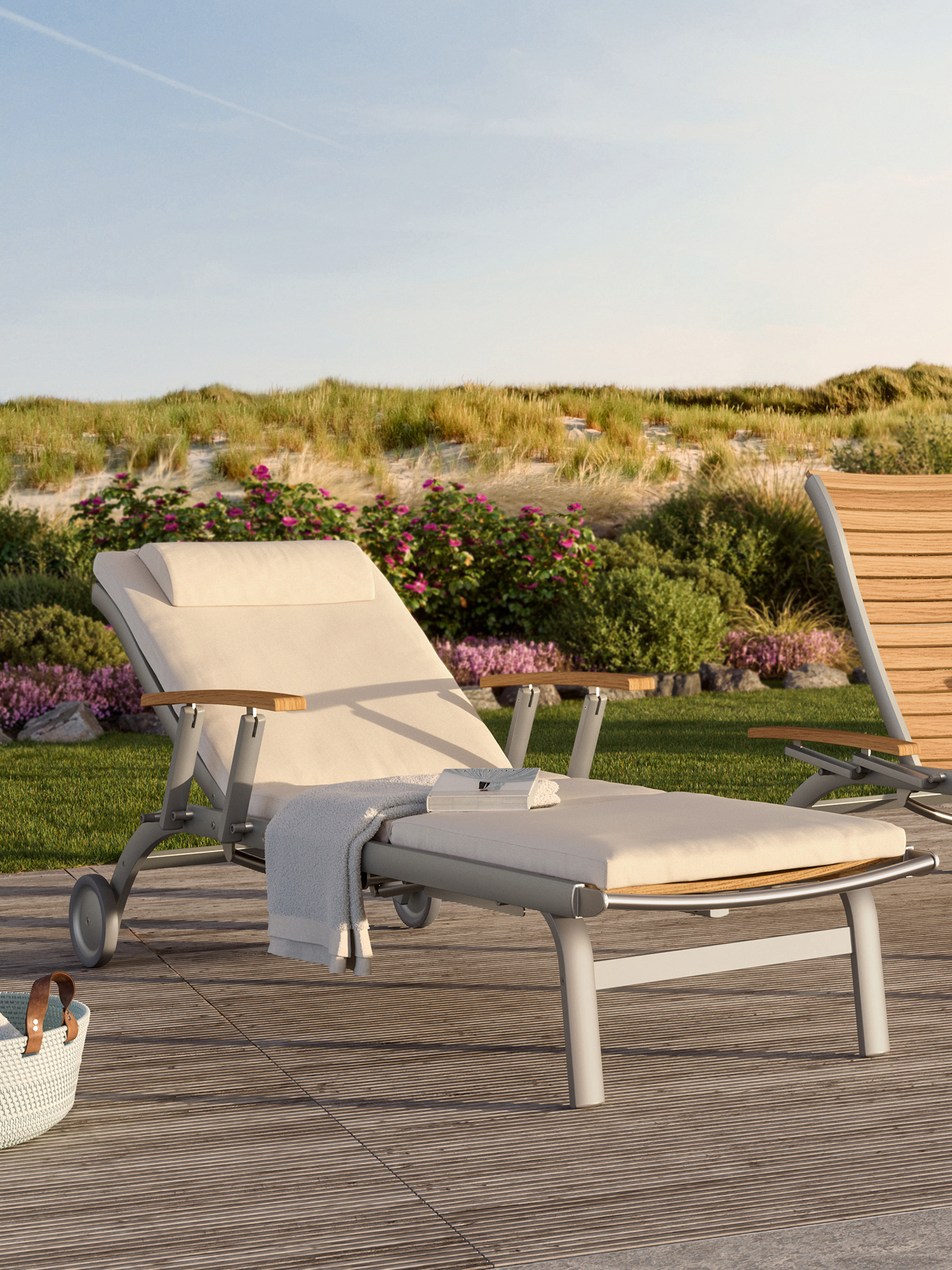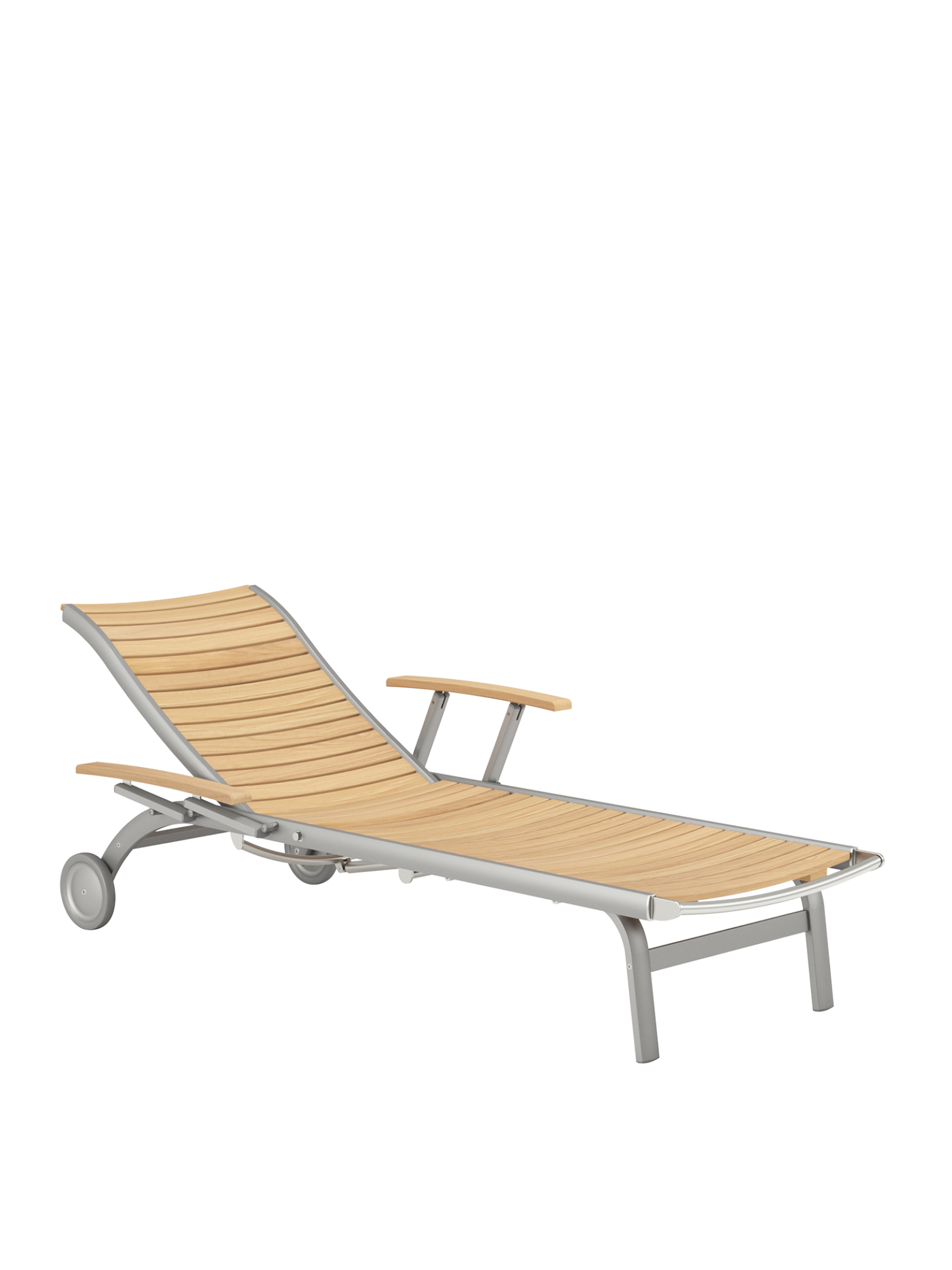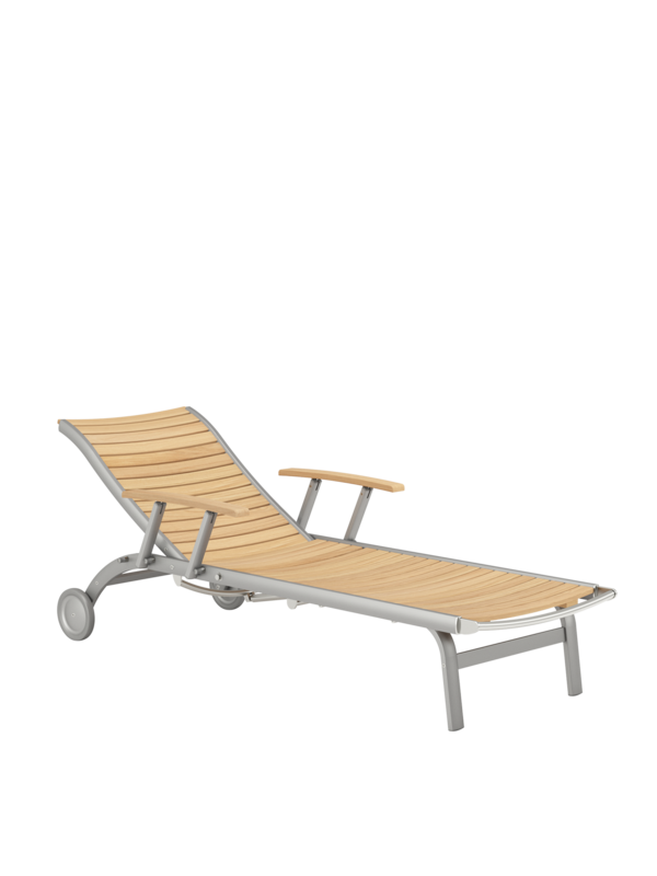 Hier werden langlebige Materialien perfekt in Szene gesetzt: Die eloxierten Profile des seidig glänzenden Aluminiumgestells rahmen ergonomisch modellierte Teakleisten und verleihen dem Designklassiker eine moderne Note.