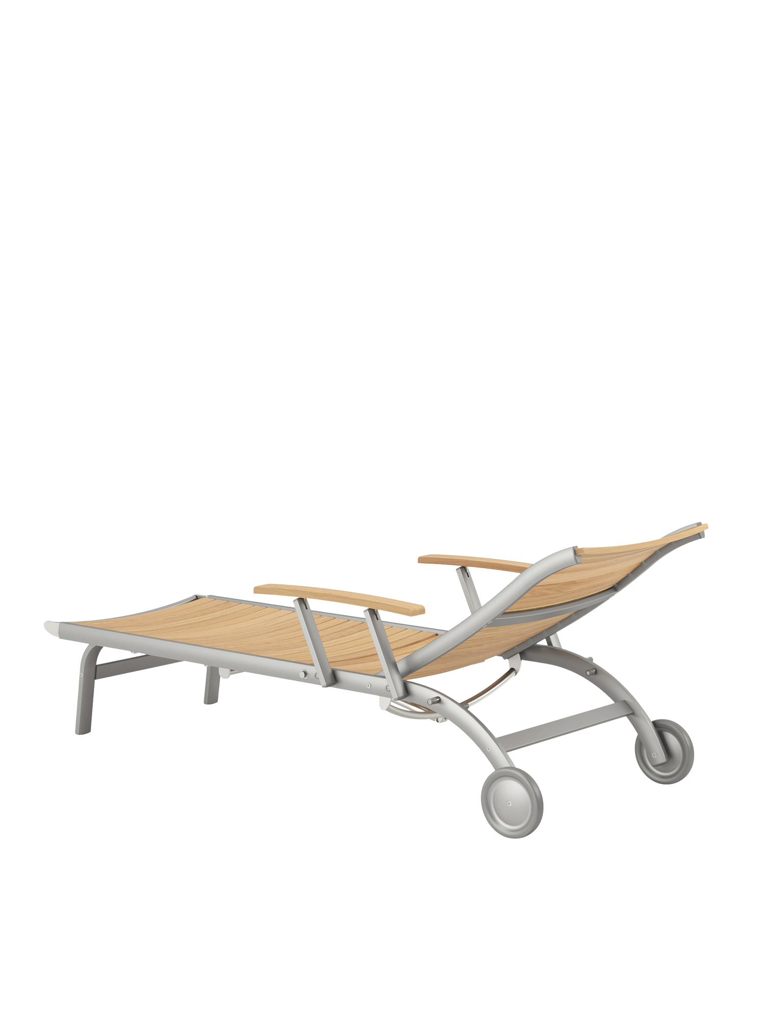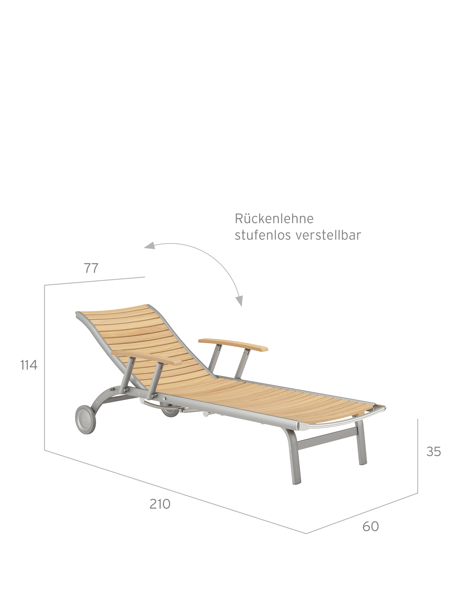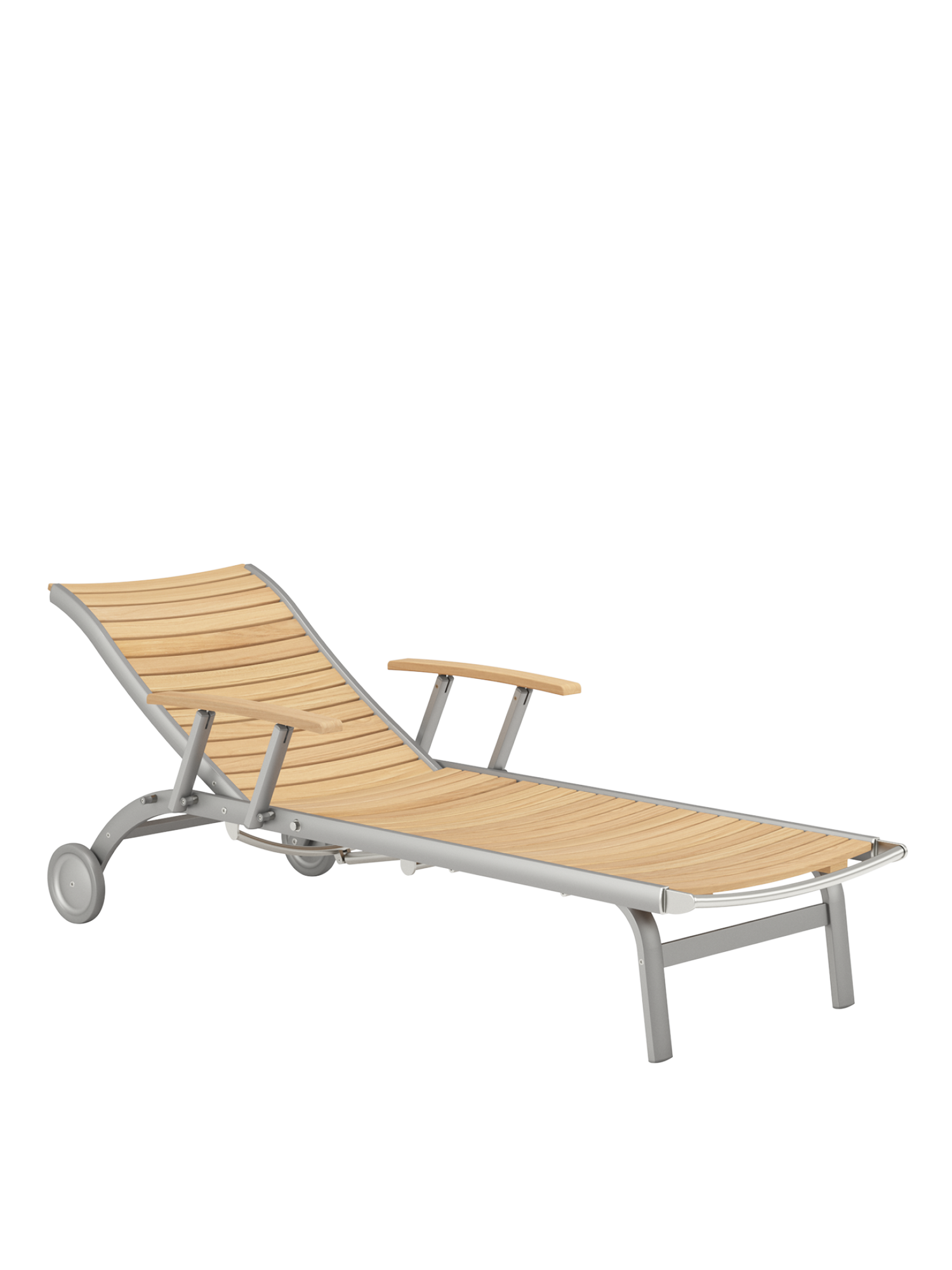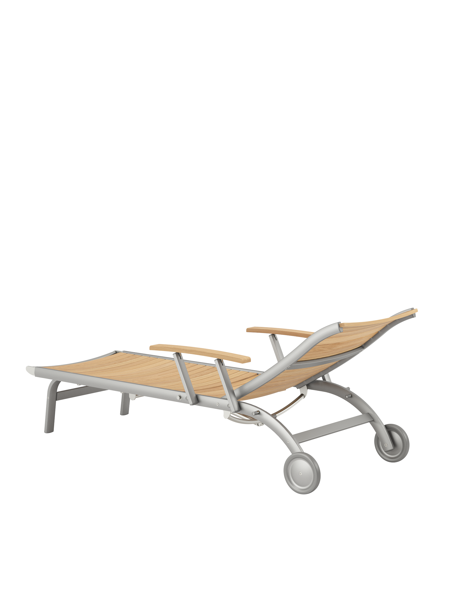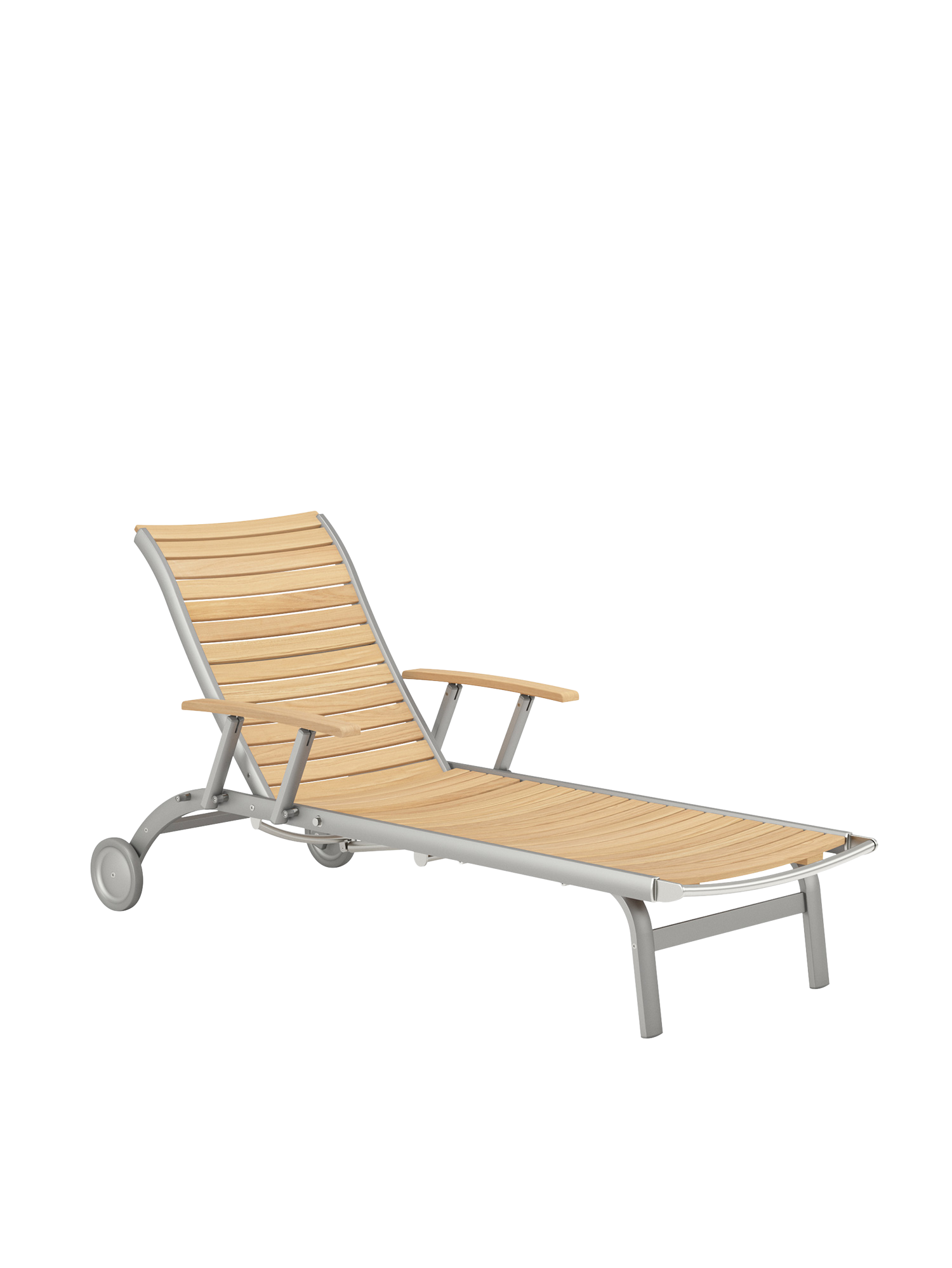 Hier werden langlebige Materialien perfekt in Szene gesetzt: Die eloxierten Profile des seidig glänzenden Aluminiumgestells rahmen ergonomisch modellierte Teakleisten und verleihen dem Designklassiker eine moderne Note.