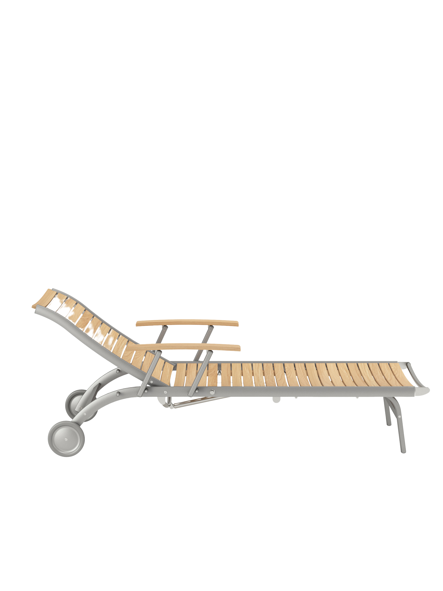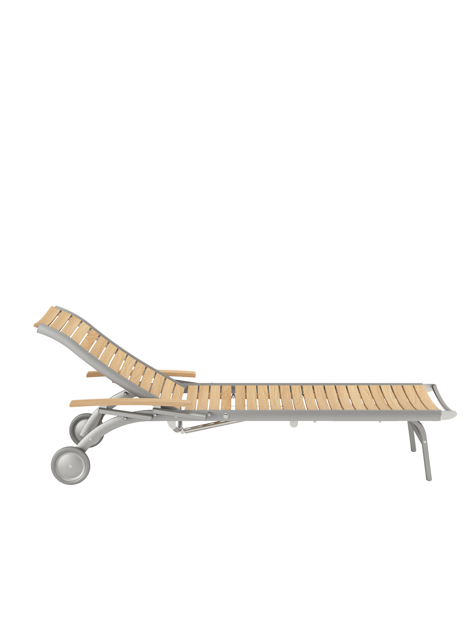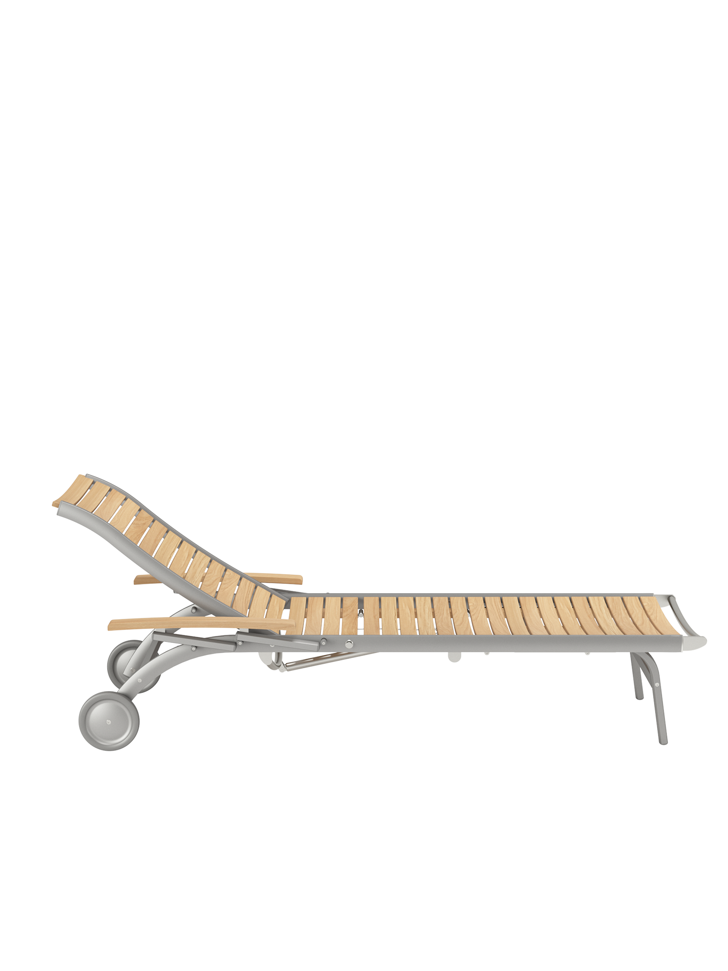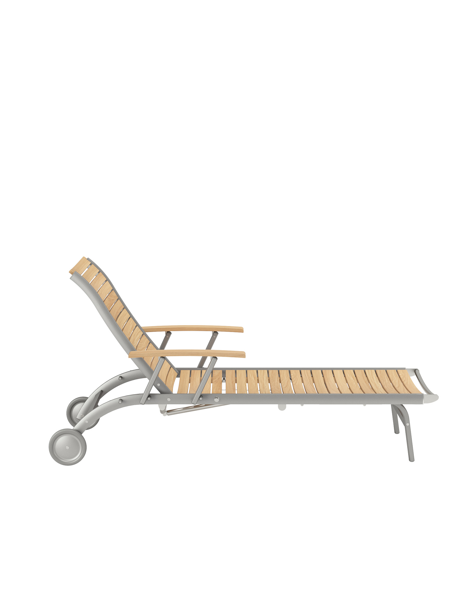 Hier werden langlebige Materialien perfekt in Szene gesetzt: Die eloxierten Profile des seidig glänzenden Aluminiumgestells rahmen ergonomisch modellierte Teakleisten und verleihen dem Designklassiker eine moderne Note.