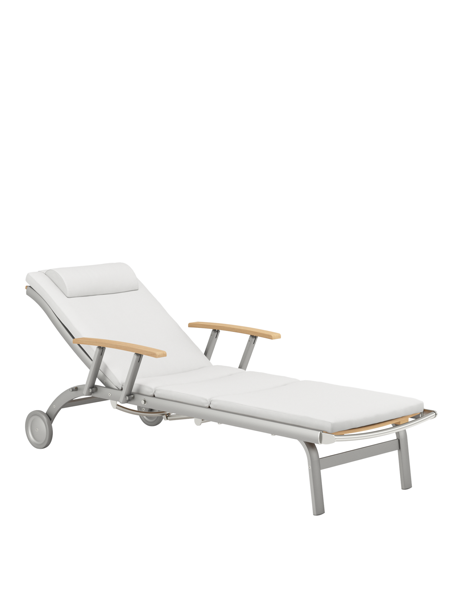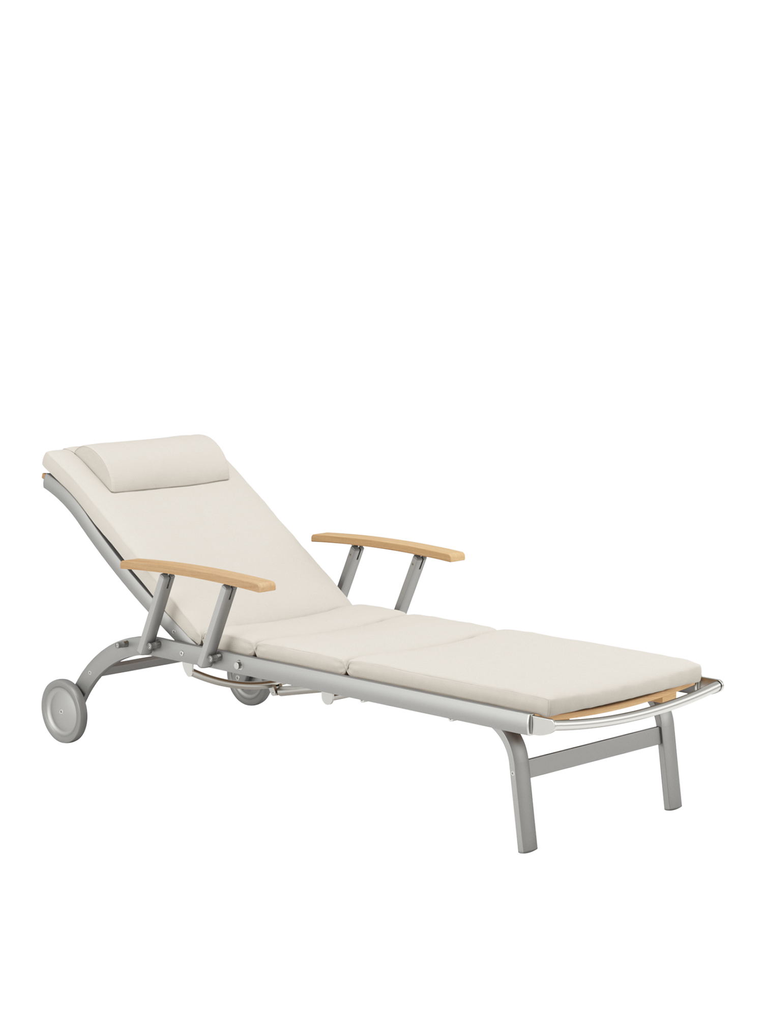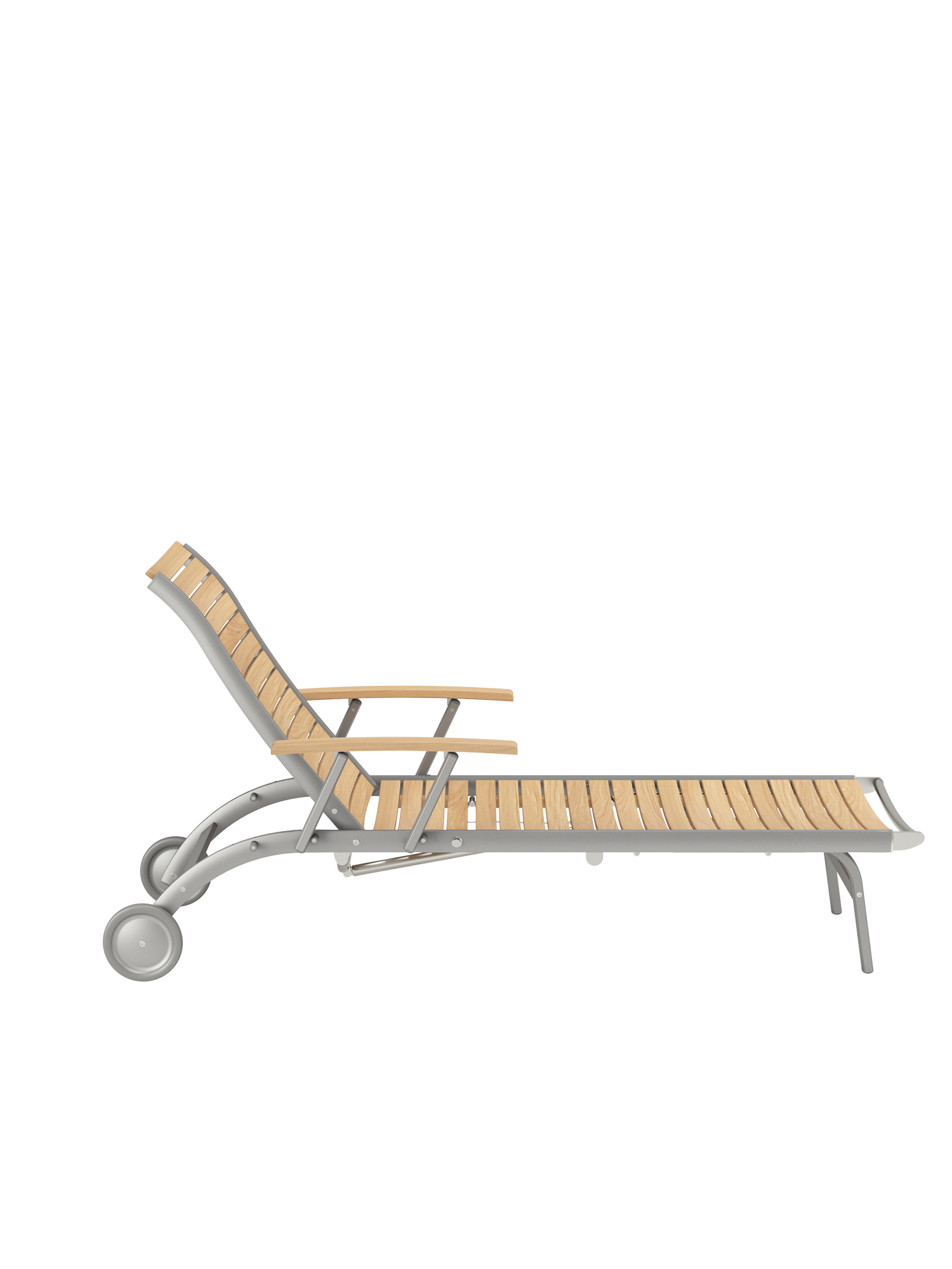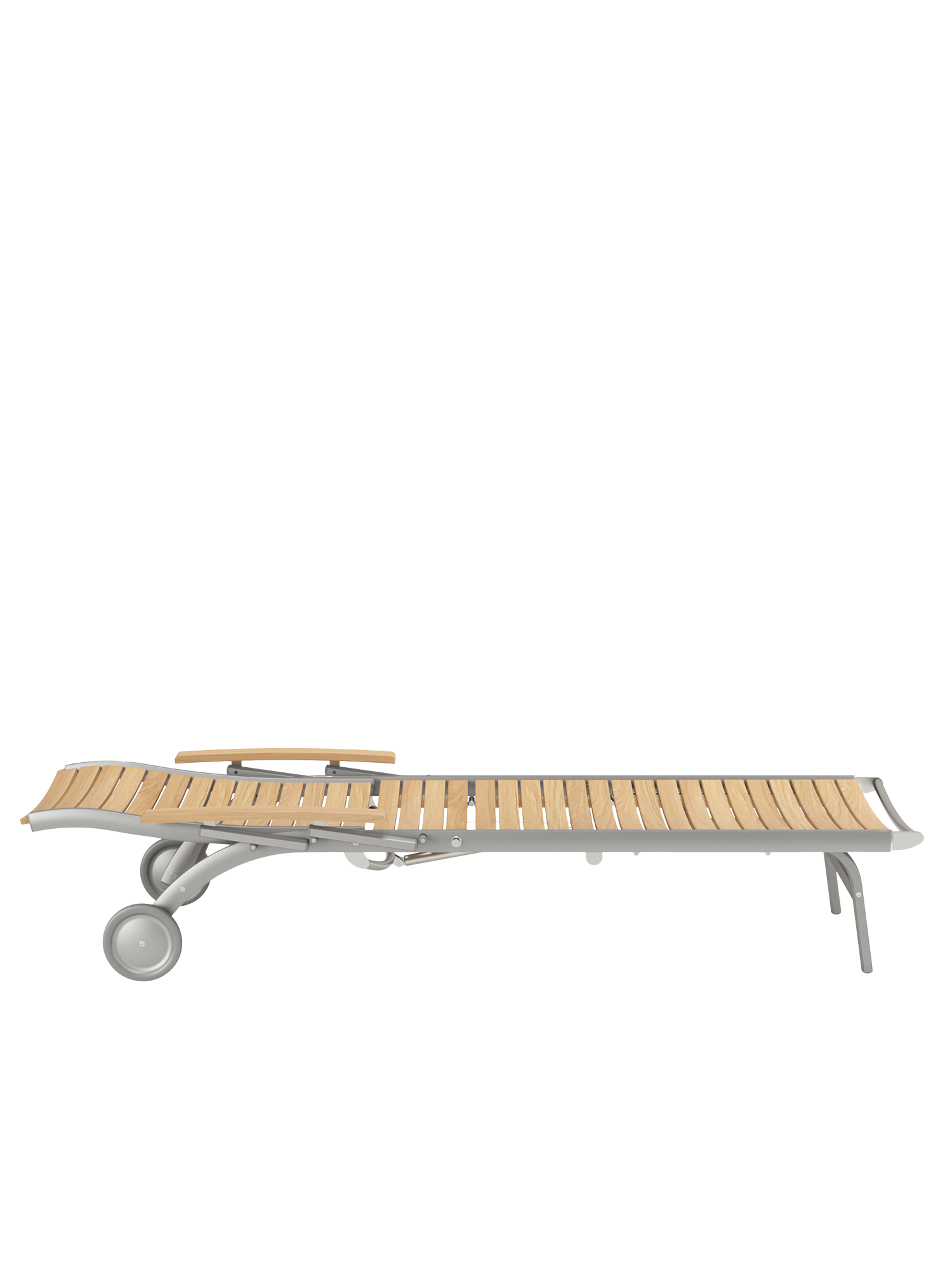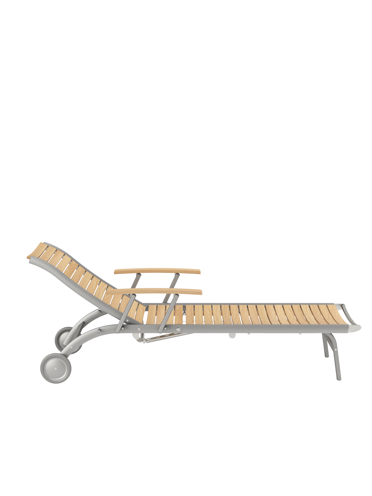 Hier werden langlebige Materialien perfekt in Szene gesetzt: Die eloxierten Profile des seidig glänzenden Aluminiumgestells rahmen ergonomisch modellierte Teakleisten und verleihen dem Designklassiker eine moderne Note.