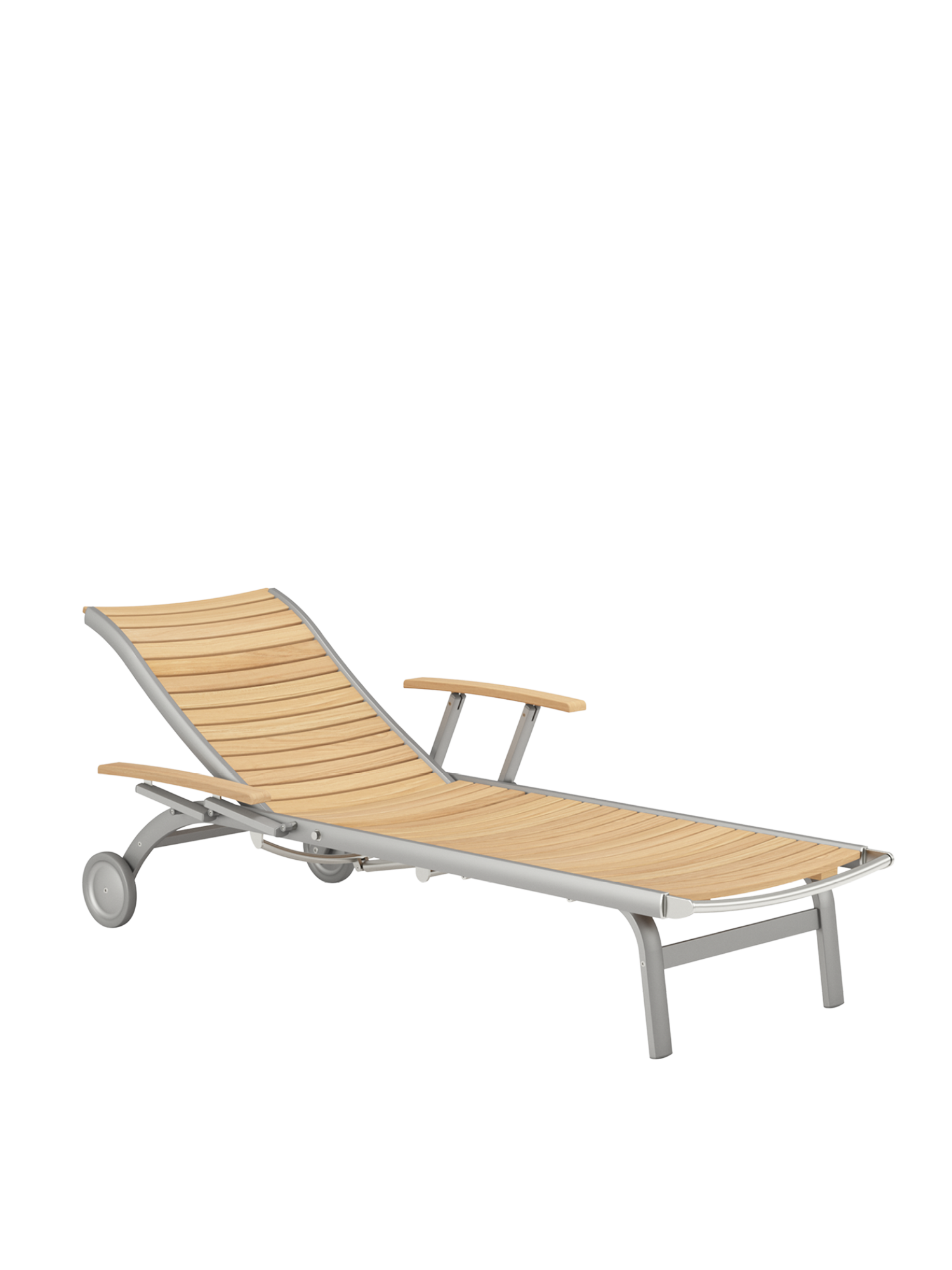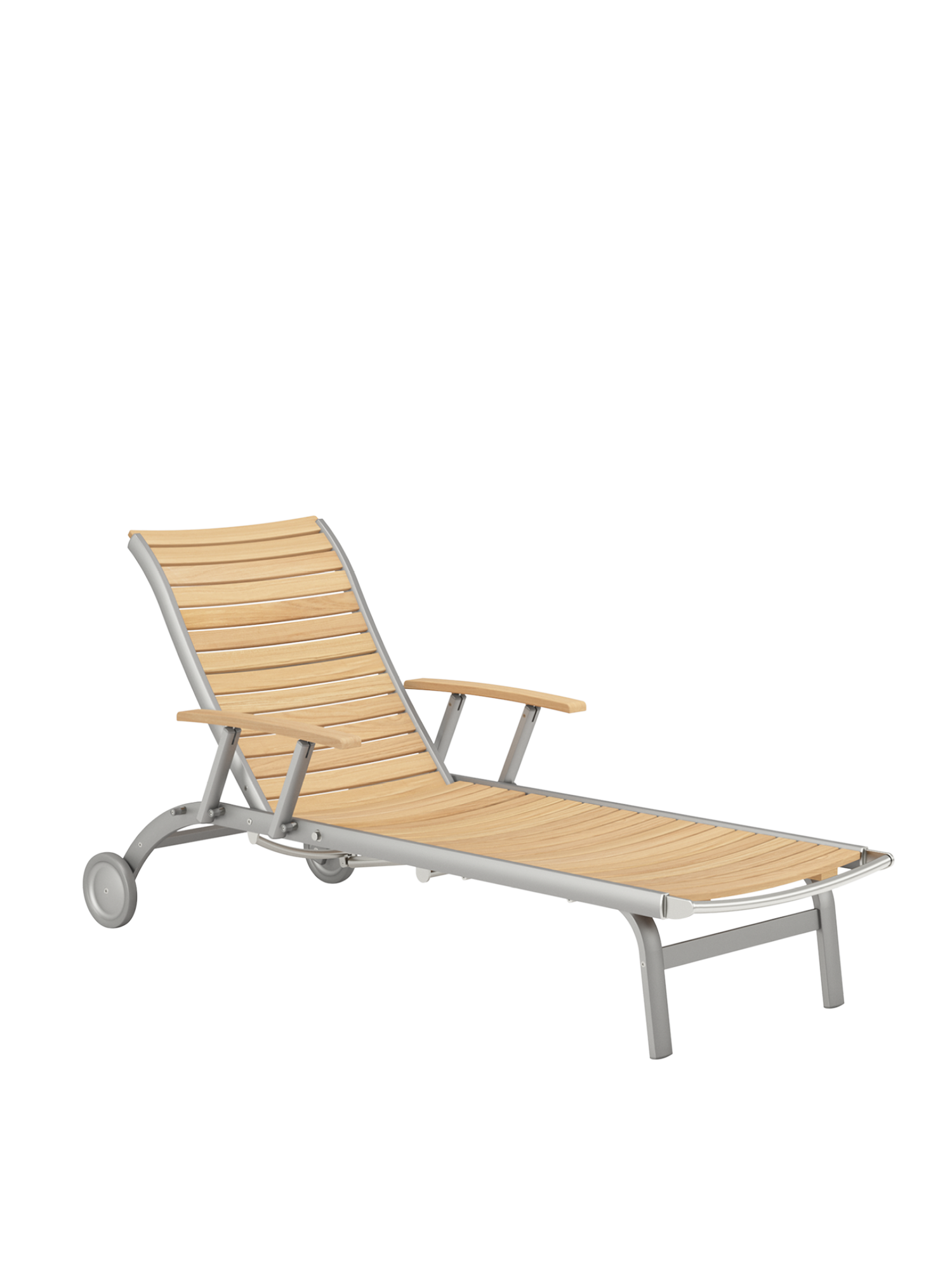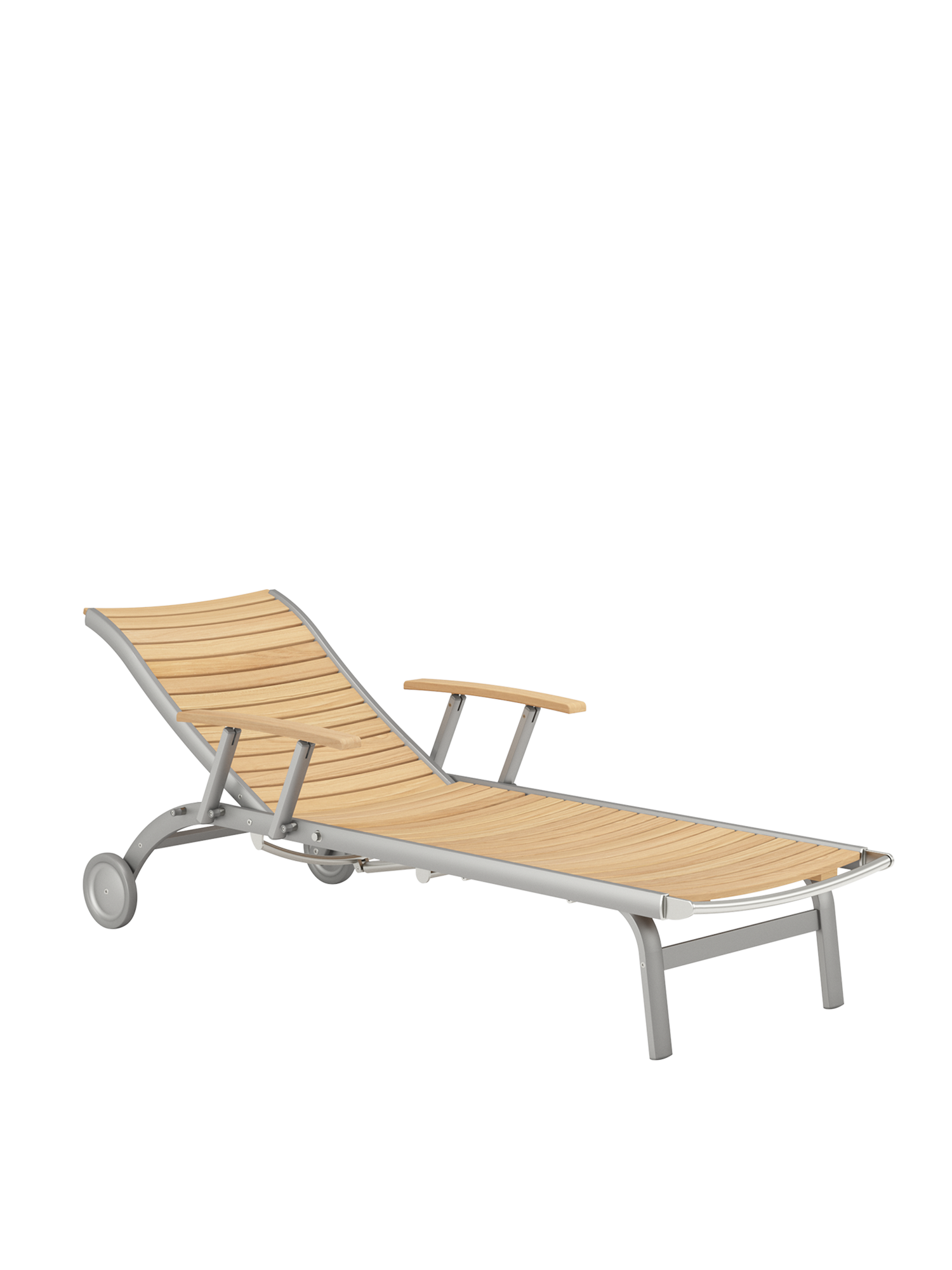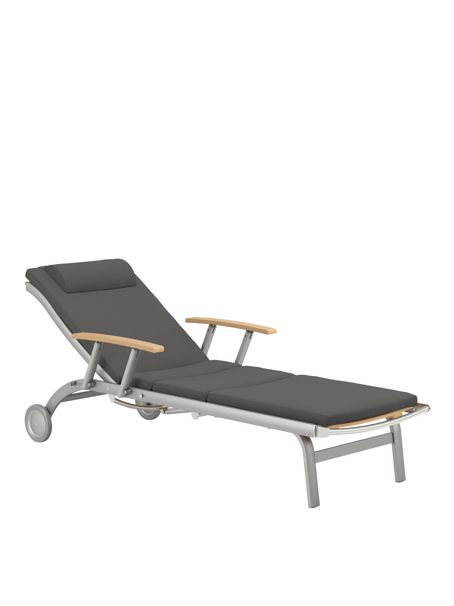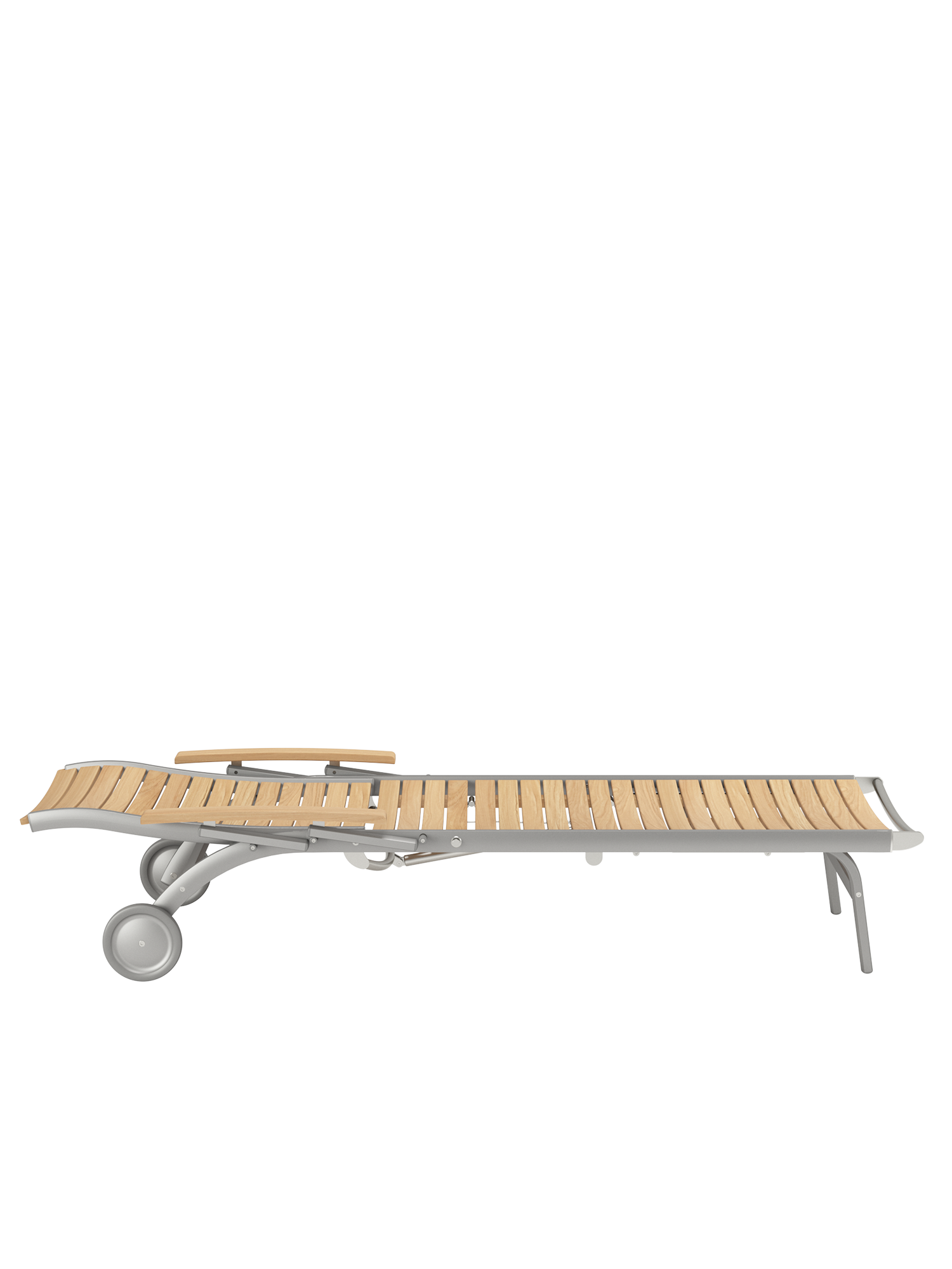 Hier werden langlebige Materialien perfekt in Szene gesetzt: Die eloxierten Profile des seidig glänzenden Aluminiumgestells rahmen ergonomisch modellierte Teakleisten und verleihen dem Designklassiker eine moderne Note.