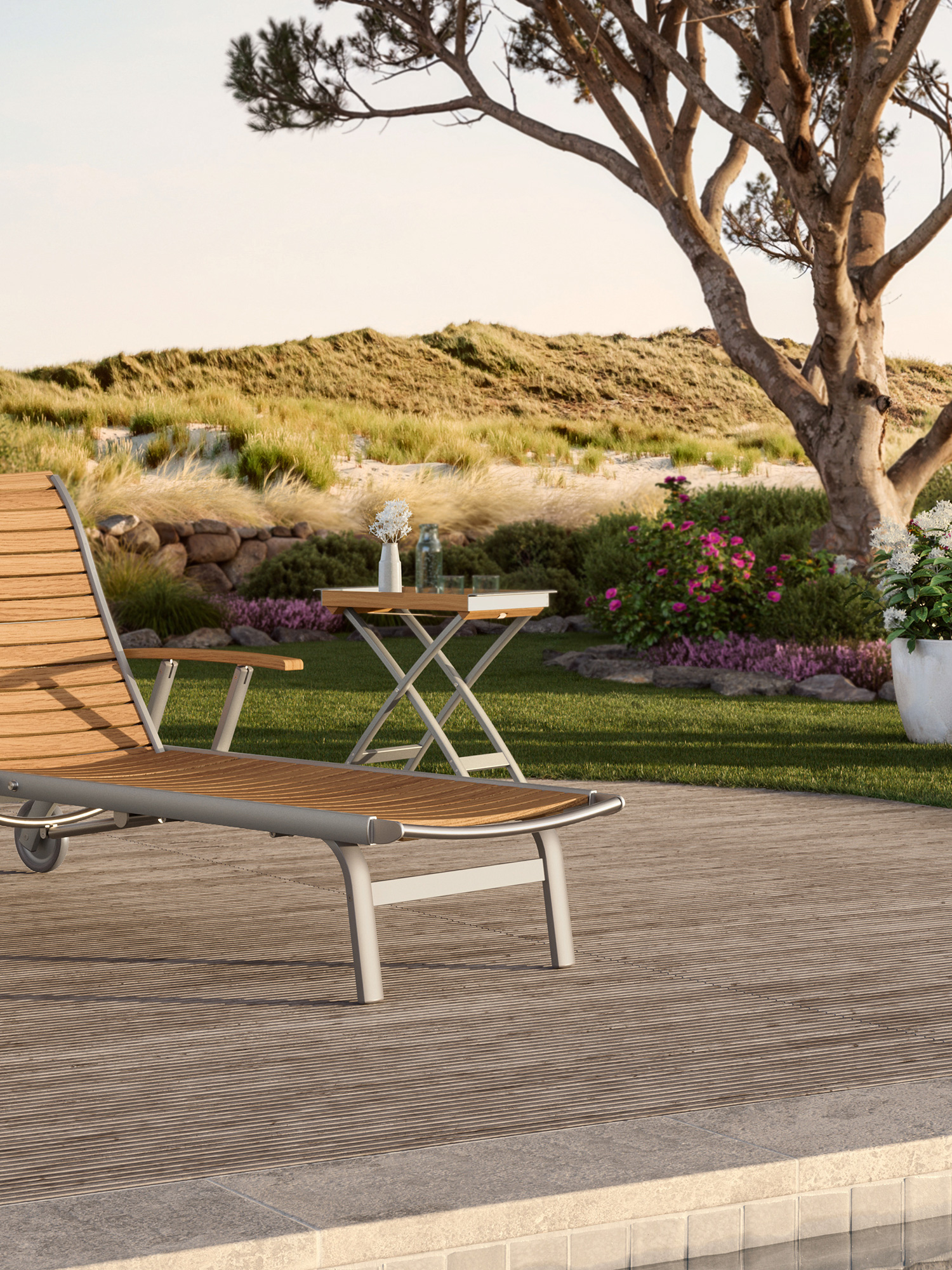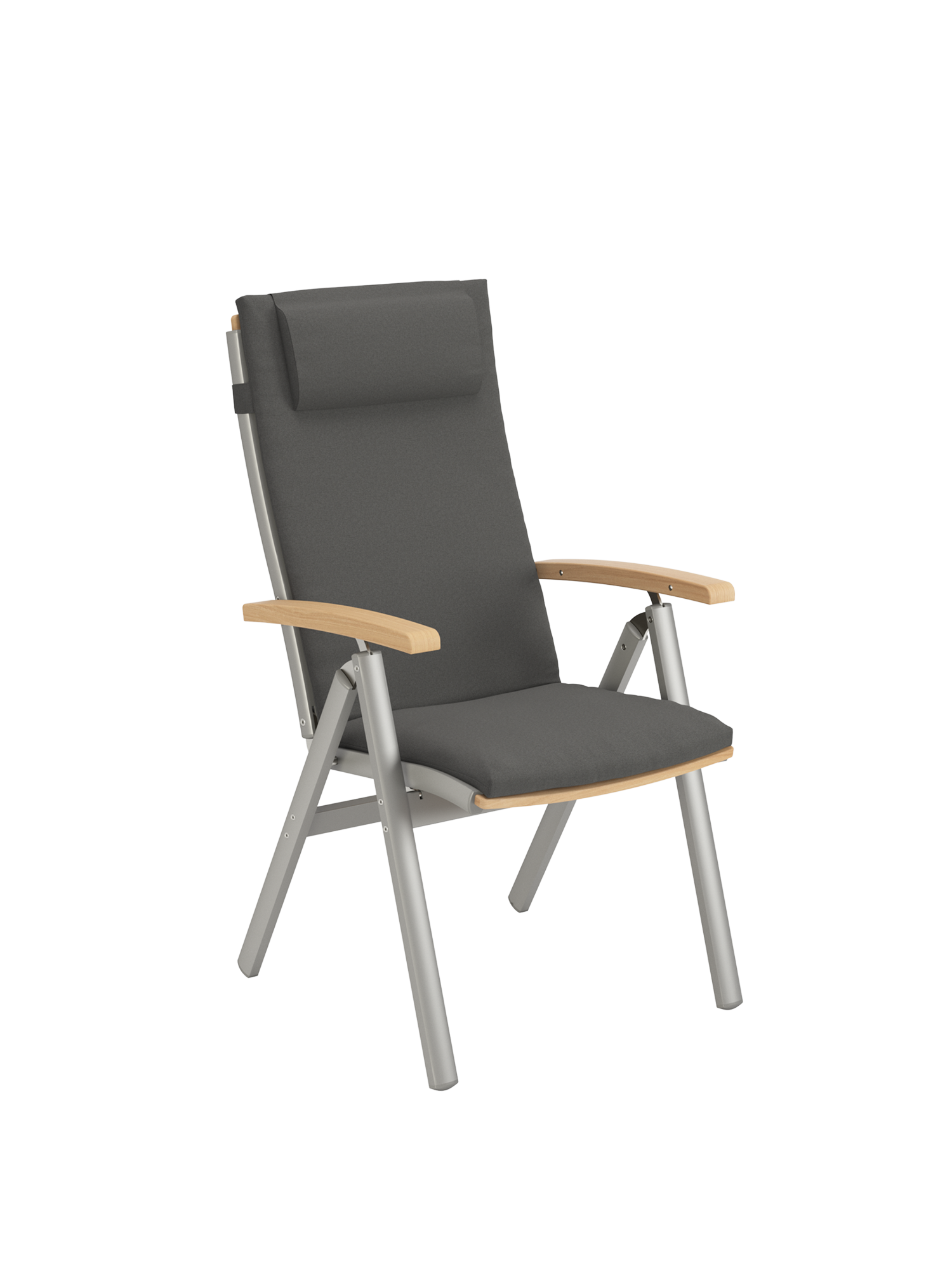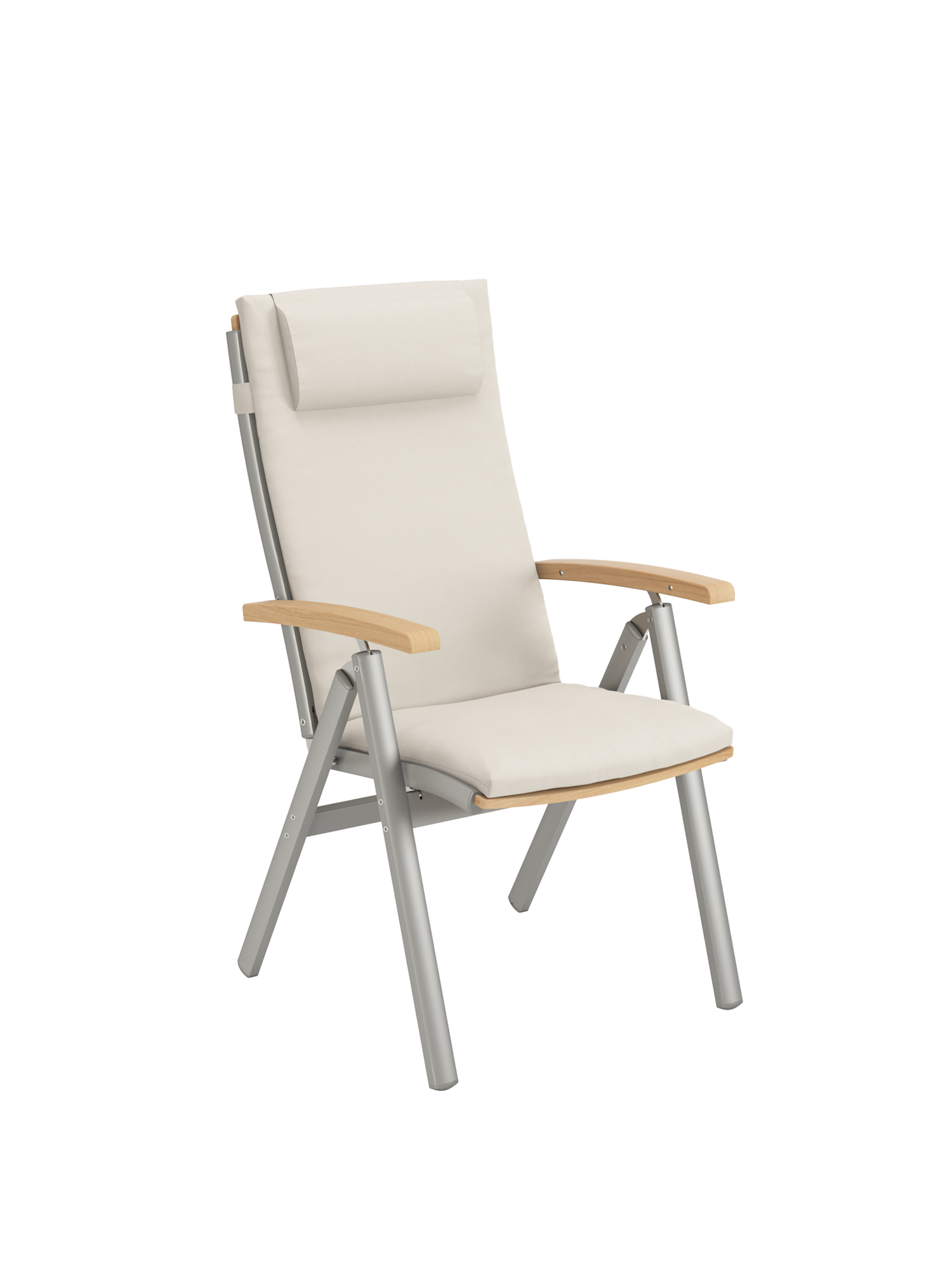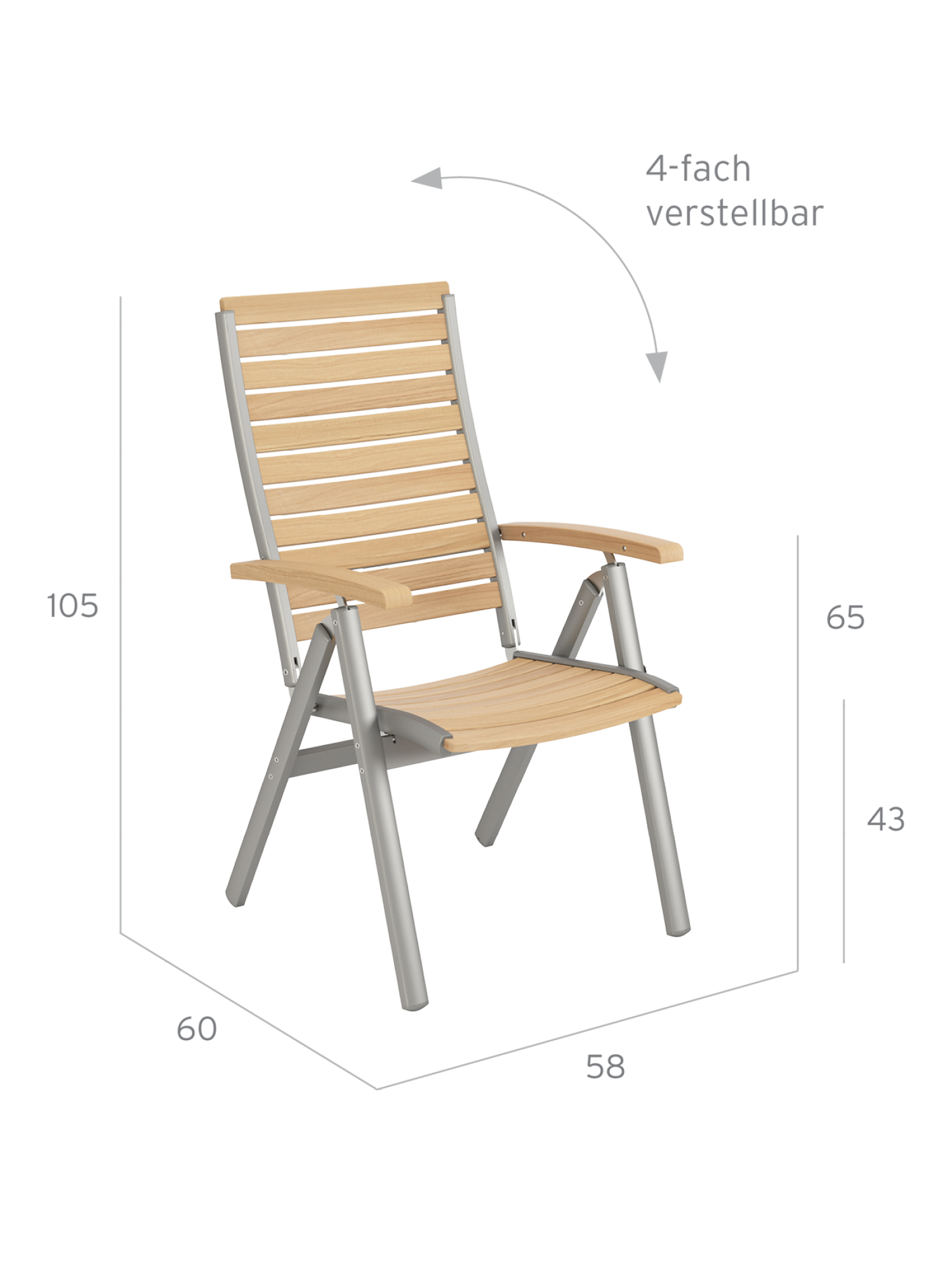 Hier werden langlebige Materialien perfekt in Szene gesetzt: Die eloxierten Profile des seidig glänzenden Aluminiumgestells rahmen bequeme Teakleisten und verleihen dem Designklassiker eine moderne Note. Die Rückenlehne des auf Handbreite zusammenklappbaren Hochlehners ist vierfach verstellbar.