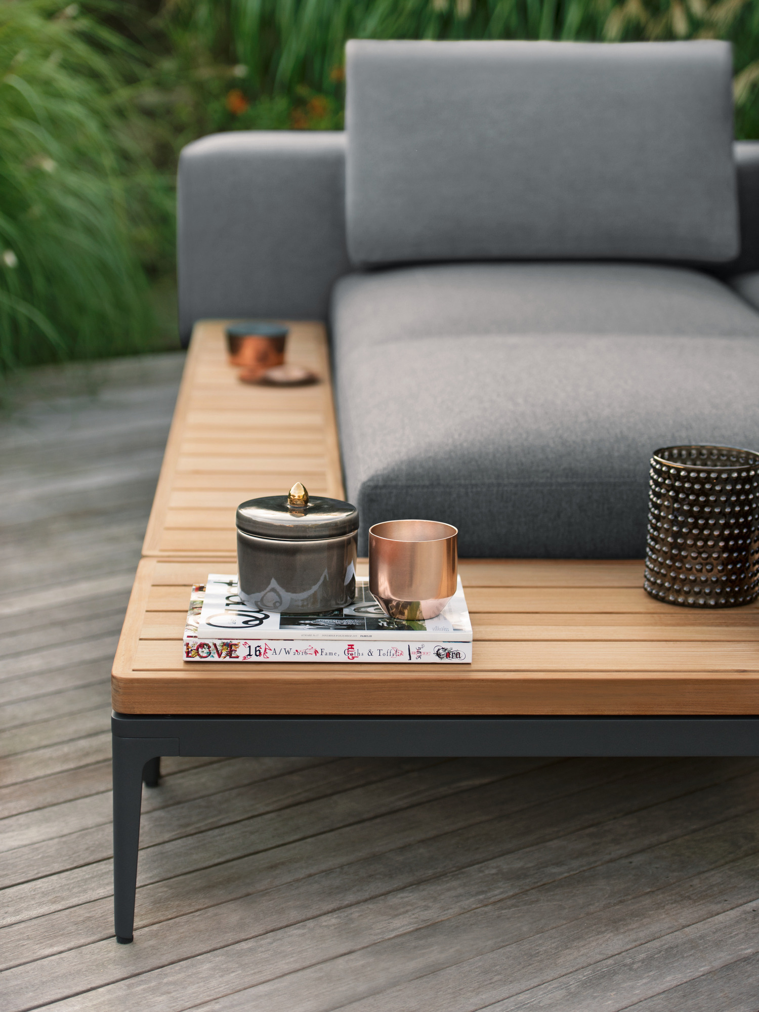 Für Morgans Bay formieren sich textile Polster, Aluminium und Teak zum individuellen Designobjekt. Die modernen Loungemöbel schaffen wohnliche Atmosphäre unter freiem Himmel. Alle Elemente haben Gestelle aus pulverbeschichtetem Aluminium. Der Couchtisch mit Teakplatte kann separat, als rahmenschaffende Verlängerung der Liege oder verbindende Komponente eingesetzt werden.