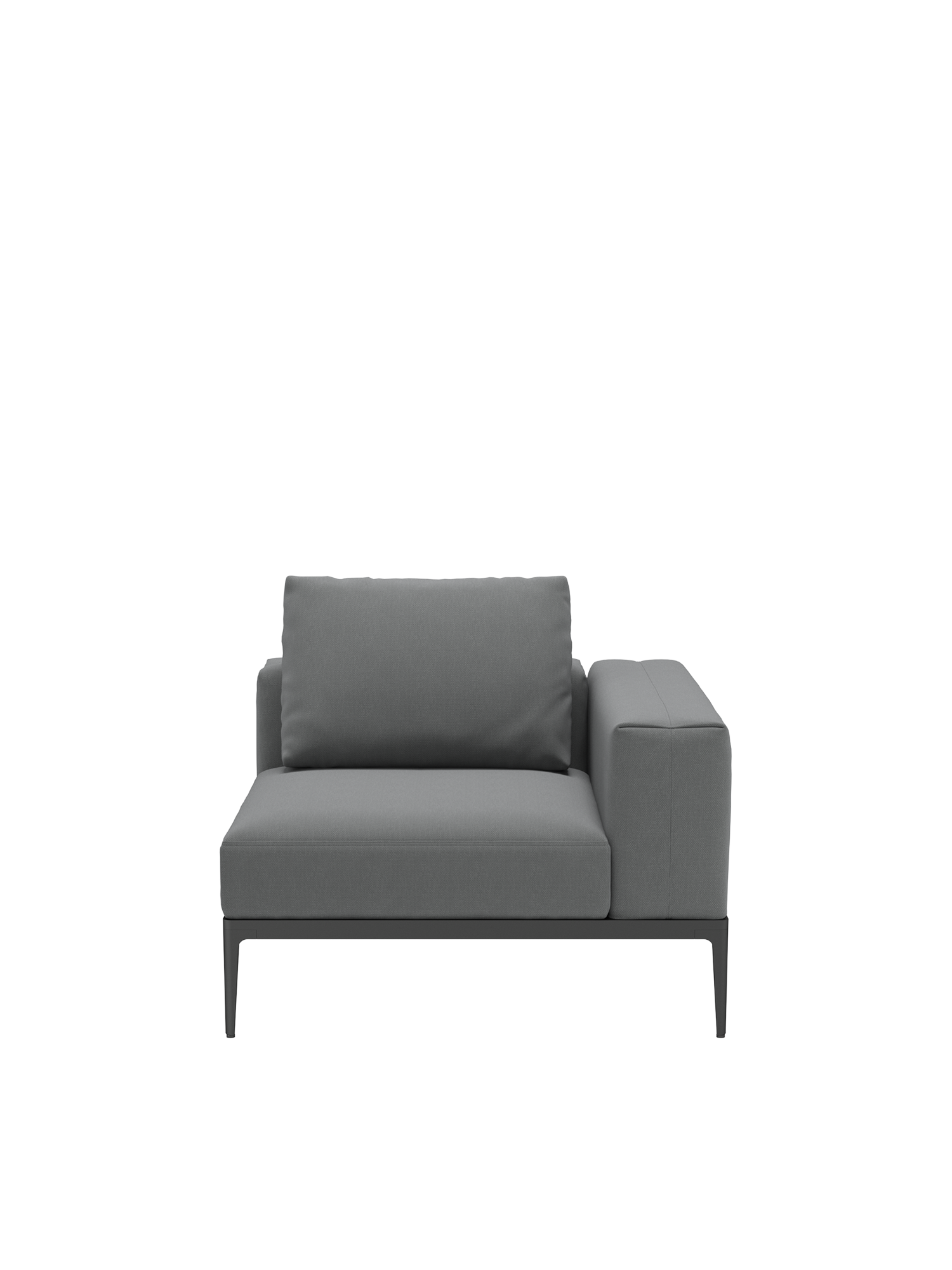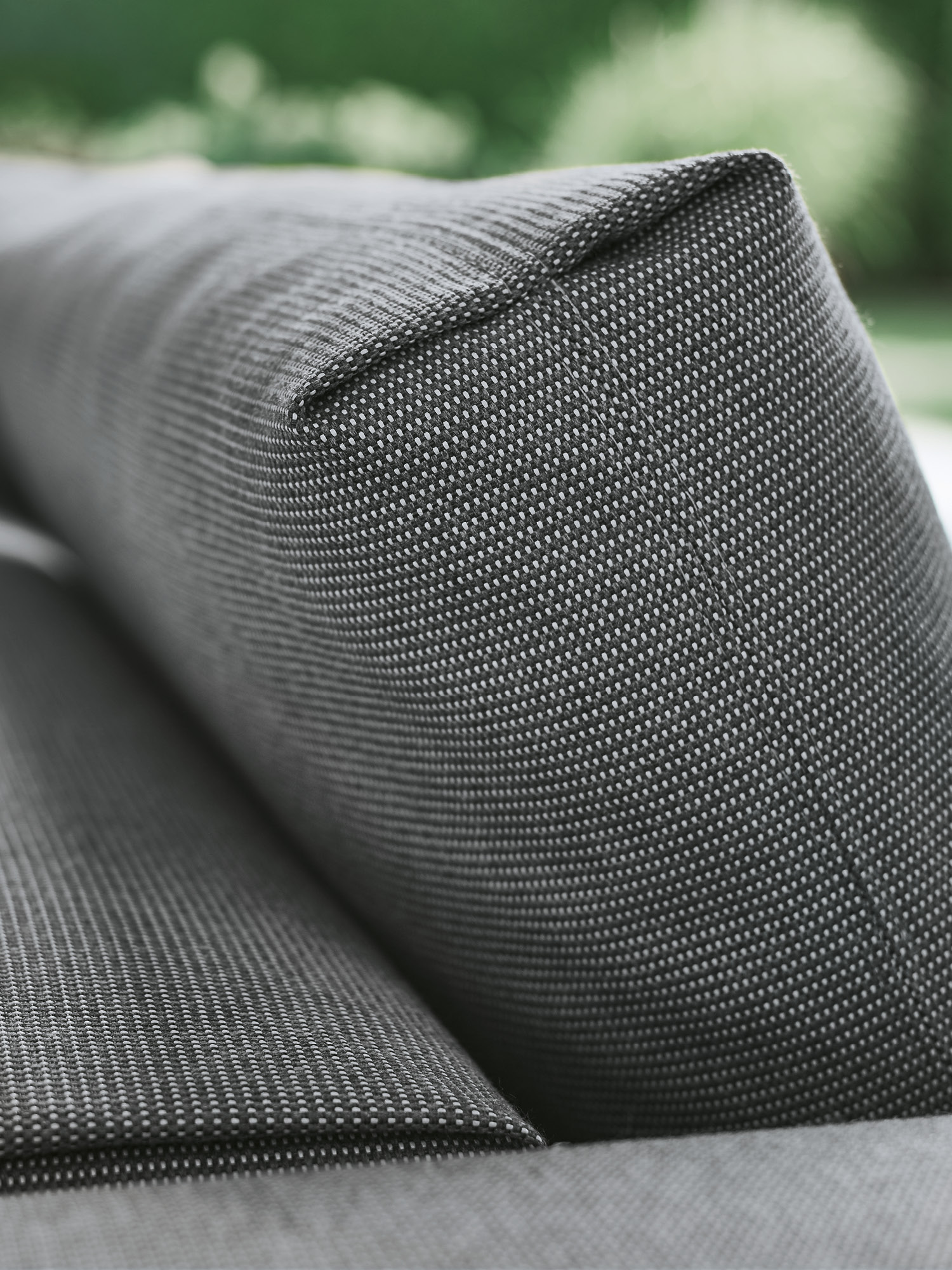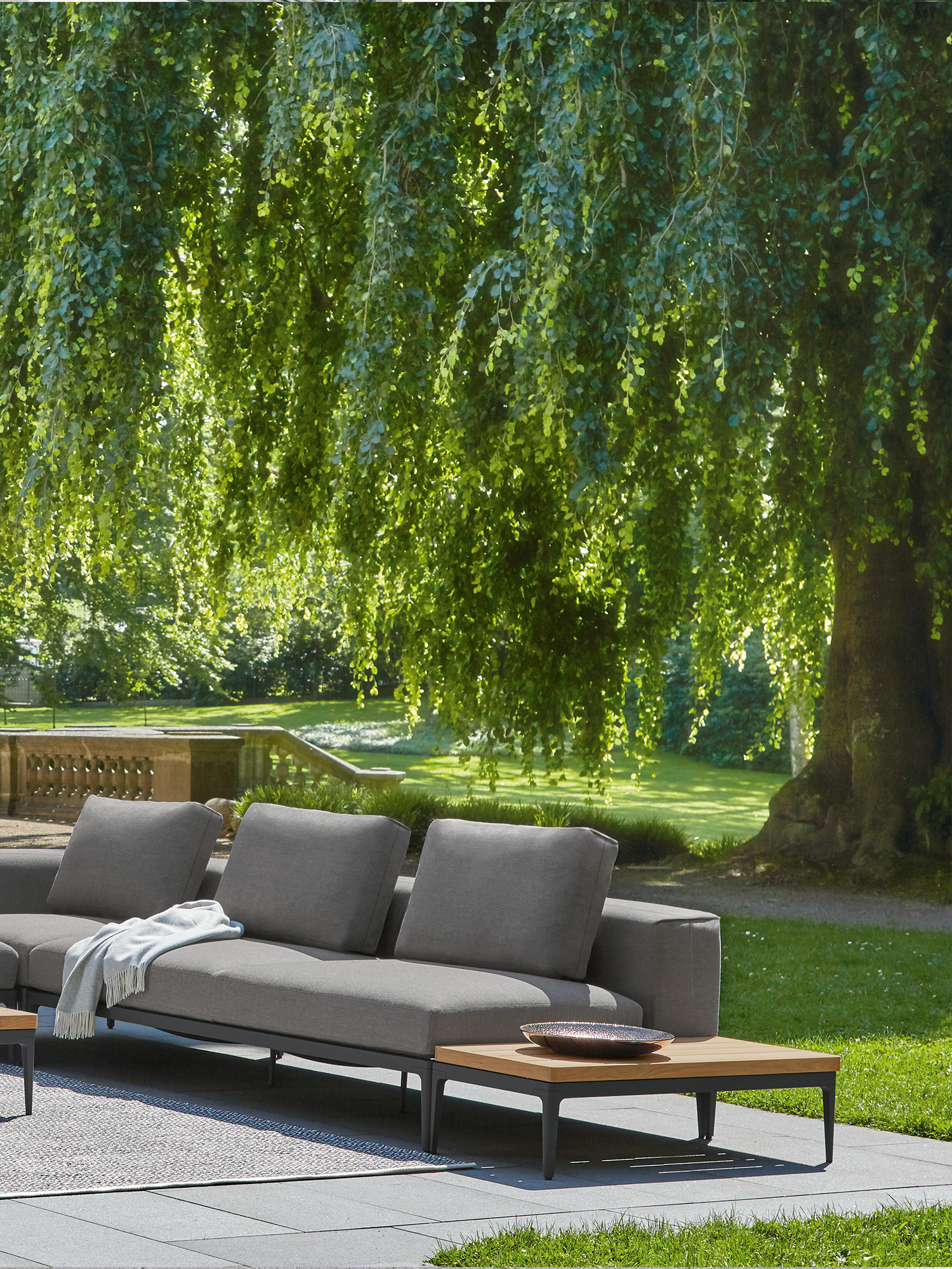 Ein Couchtisch mit Teakplatte unterstreicht die wohnliche Anmutung der extravaganten Sitzlandschaft. Er kann separat stehen oder auch als verbindende Komponente eingesetzt werden. Ebenso wie die zur Serie gehörende Liege finden Sie ihn unter "Passende Produkte" weiter unten auf dieser Seite. Der Umwelt und der Nachhaltigkeit zuliebe besteht der hochwertige Polsterbezug aus recycelten Materialien. Daher sind kleine Farbeinschlüsse im Gewebe möglich.
