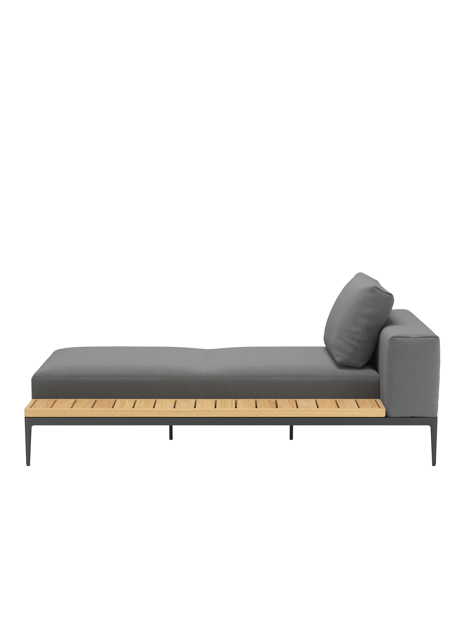 Für Morgans Bay formieren sich textile Polster, Aluminium und Teak zum individuellen Designobjekt. Die modernen Loungemöbel schaffen wohnliche Atmosphäre unter freiem Himmel. Alle Elemente haben Gestelle aus pulverbeschichtetem Aluminium. Die großzügige Liege hat am äußeren Rand eine dekorative Teakablage für Lektüre oder Drinks, die sich wahlweise auf der linken oder rechten Seite befindet. Die Liege lässt sich ganz nach Wunsch mit den übrigen Möbelnder Serie kombinieren.