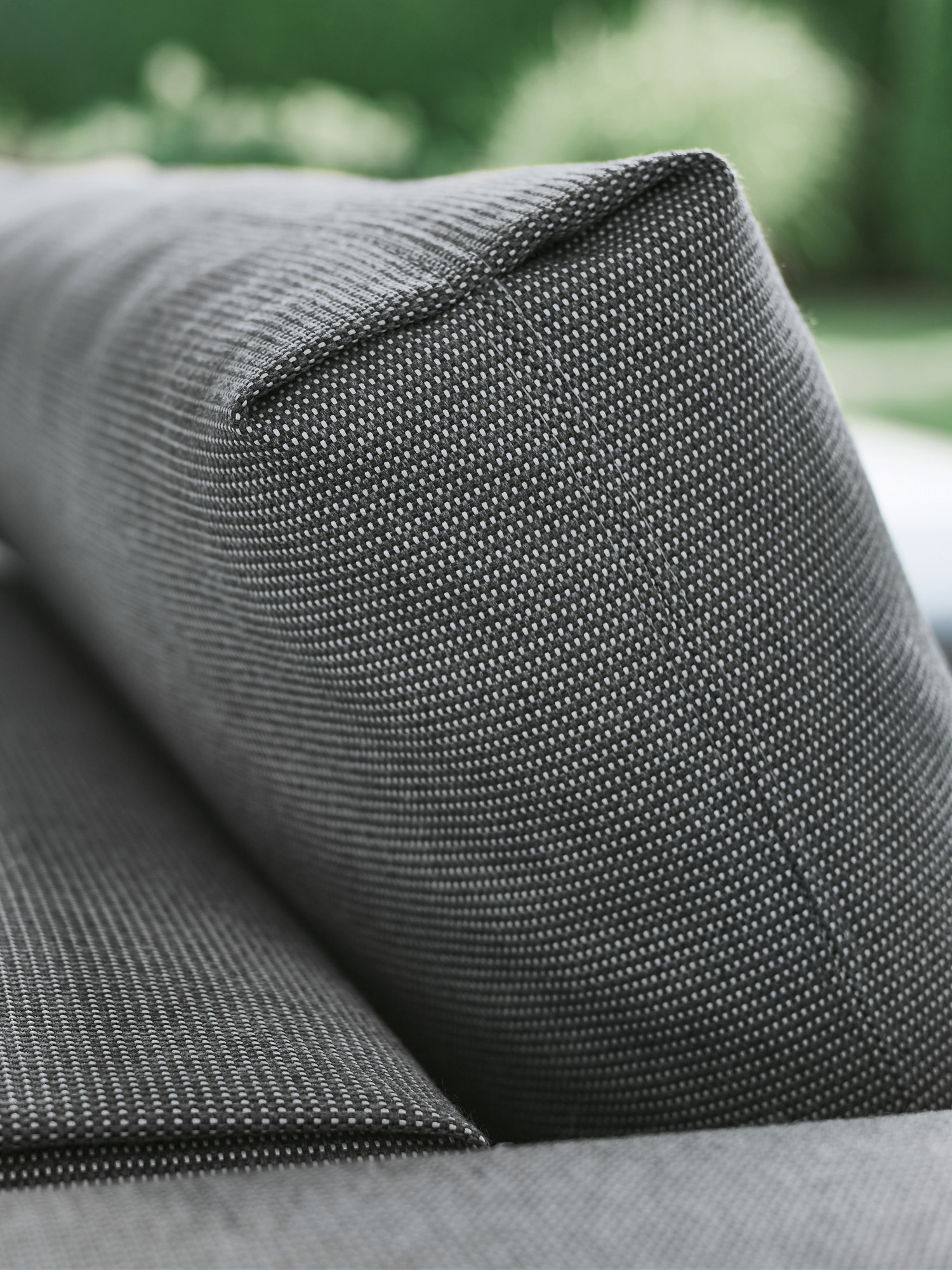 Der markante Bezugsstoff ihrer üppigen Polster ist pflegeleicht und wasserabweisend. Im Sommer können die Auflagen daher auch einmal nass werden. Um sie nach einem Schauer sofort wieder benutzen zu können, bieten sich unsere mitgelieferten Abdeckhauben als Schutz an. Im Winter sollten die Polster abgenommen und im Haus trocken gelagert werden. Der Umwelt und der Nachhaltigkeit zuliebe besteht der hochwertige Polsterbezug aus recycelten Materialien. Daher sind kleine Farbeinschlüsse im Gewebe möglich.