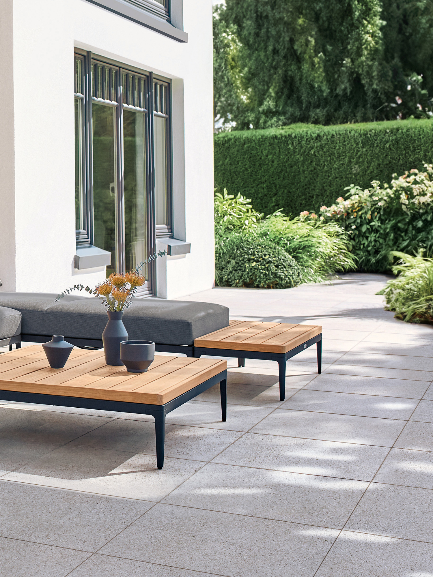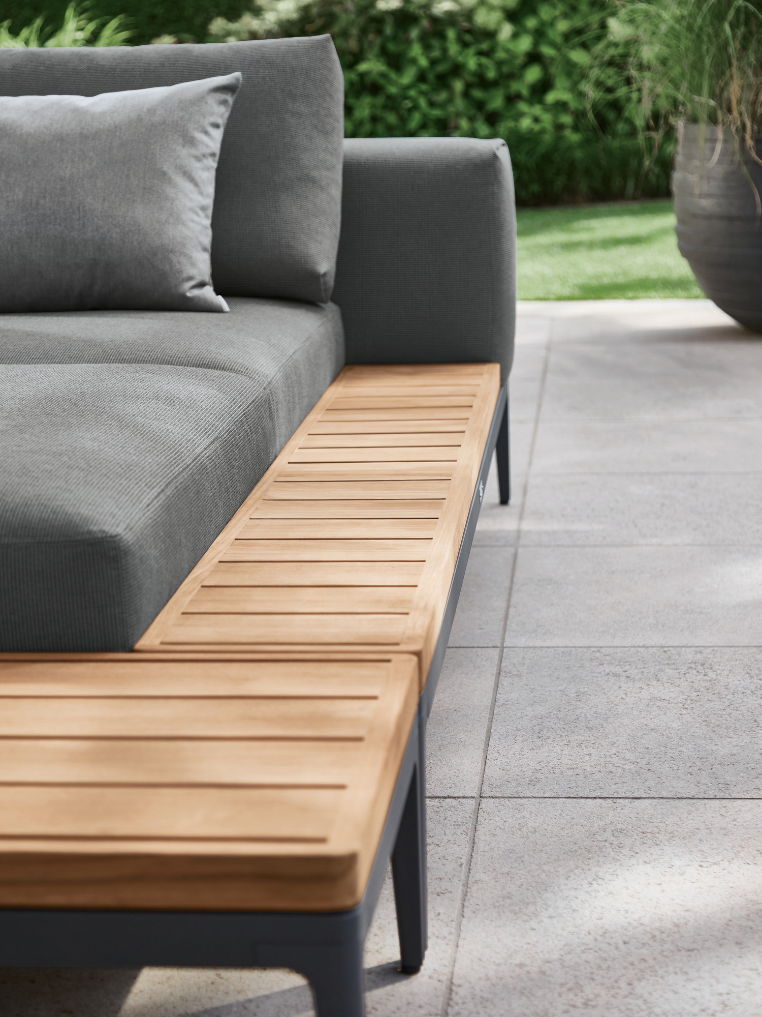 Zwei Couchtische mit Teakplatte unterstreichen die wohnliche Anmutung der extravaganten Sitzlandschaft. Der rechteckige Tisch kann als rahmenschaffende Verlängerung der Liege oder verbindende Komponente eingesetzt werden. Ebenso wie die zur Serie gehörenden Sofaelemente finden Sie ihn unter "Passende Produkte".