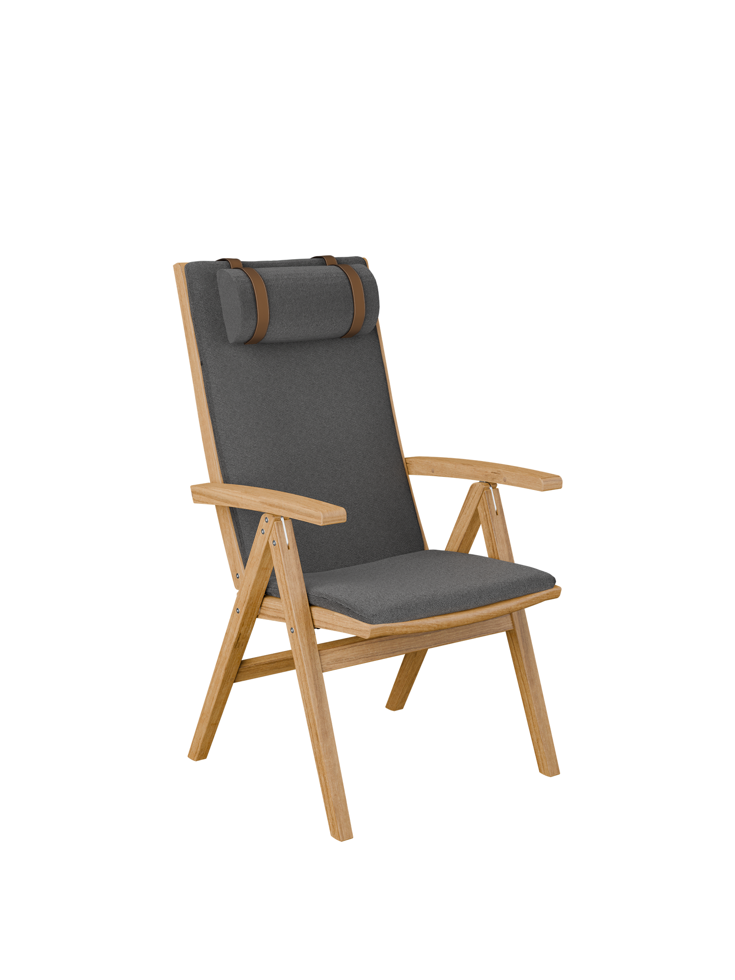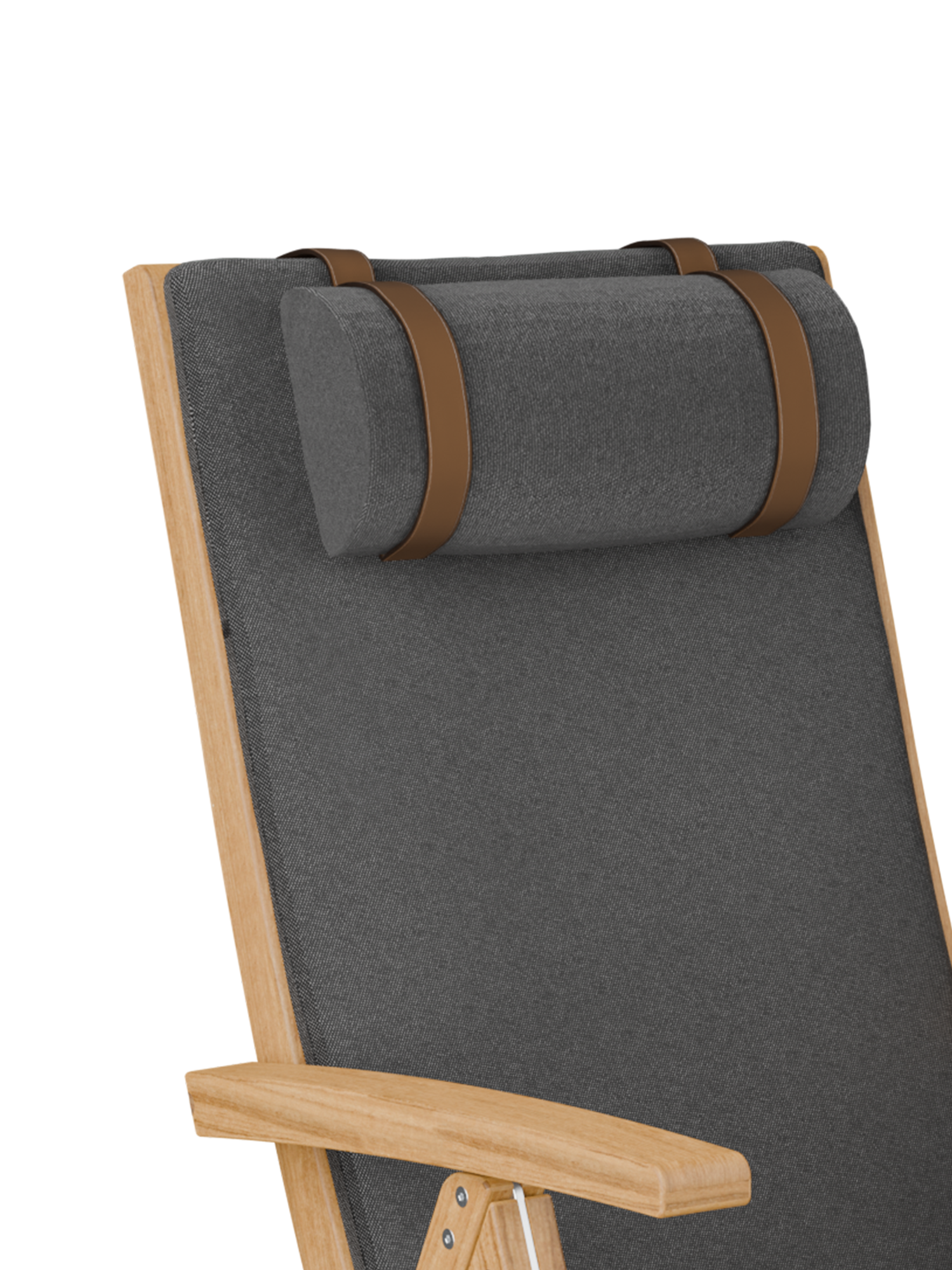 Das Nackenkissen wird mit zwei braunen Lederbändern an der Auflage befestigt und kann in drei Stufen verstellt werden.