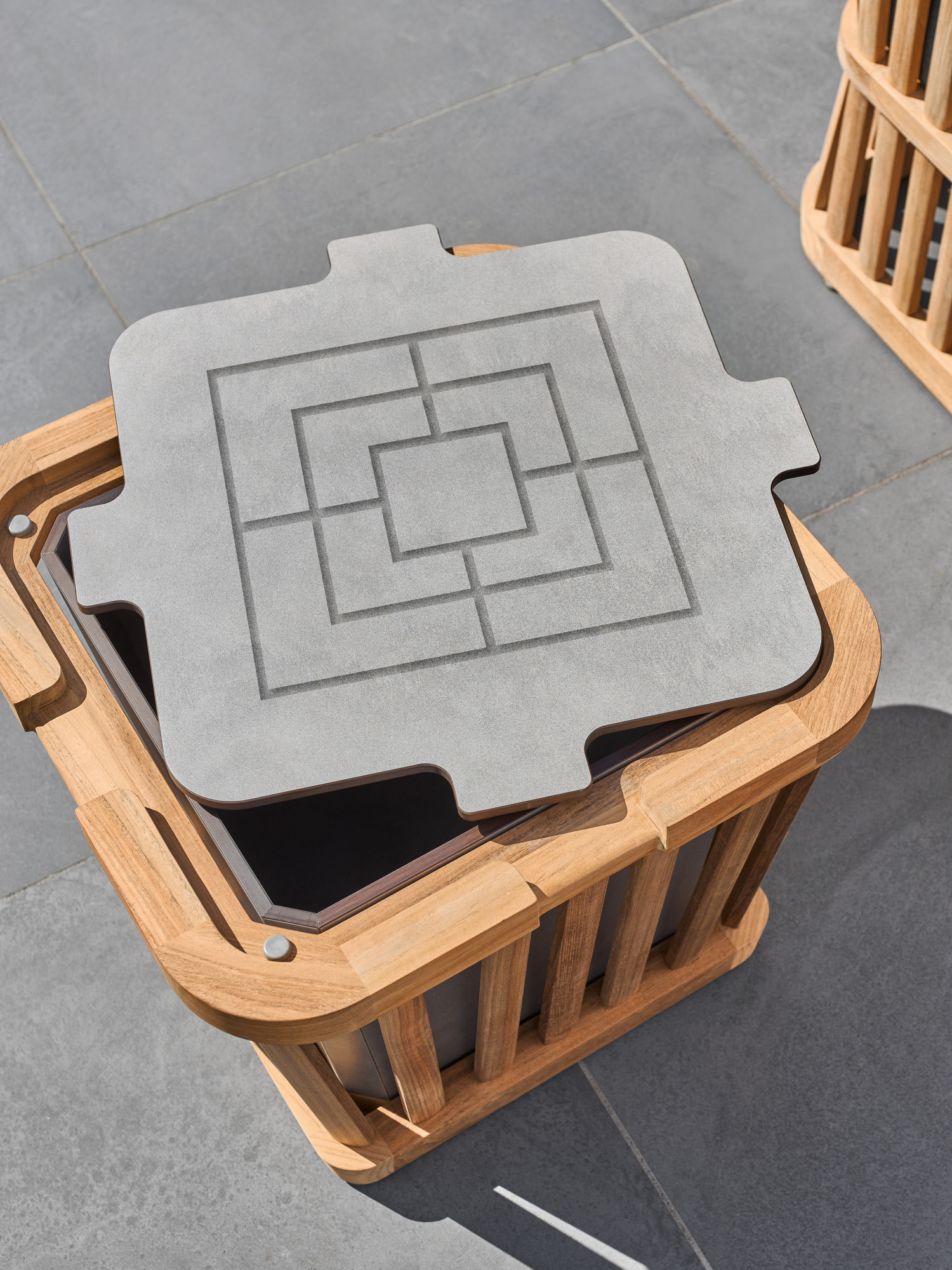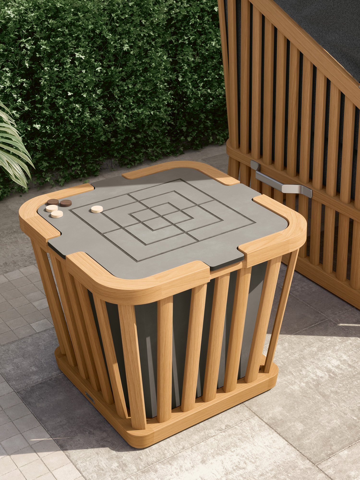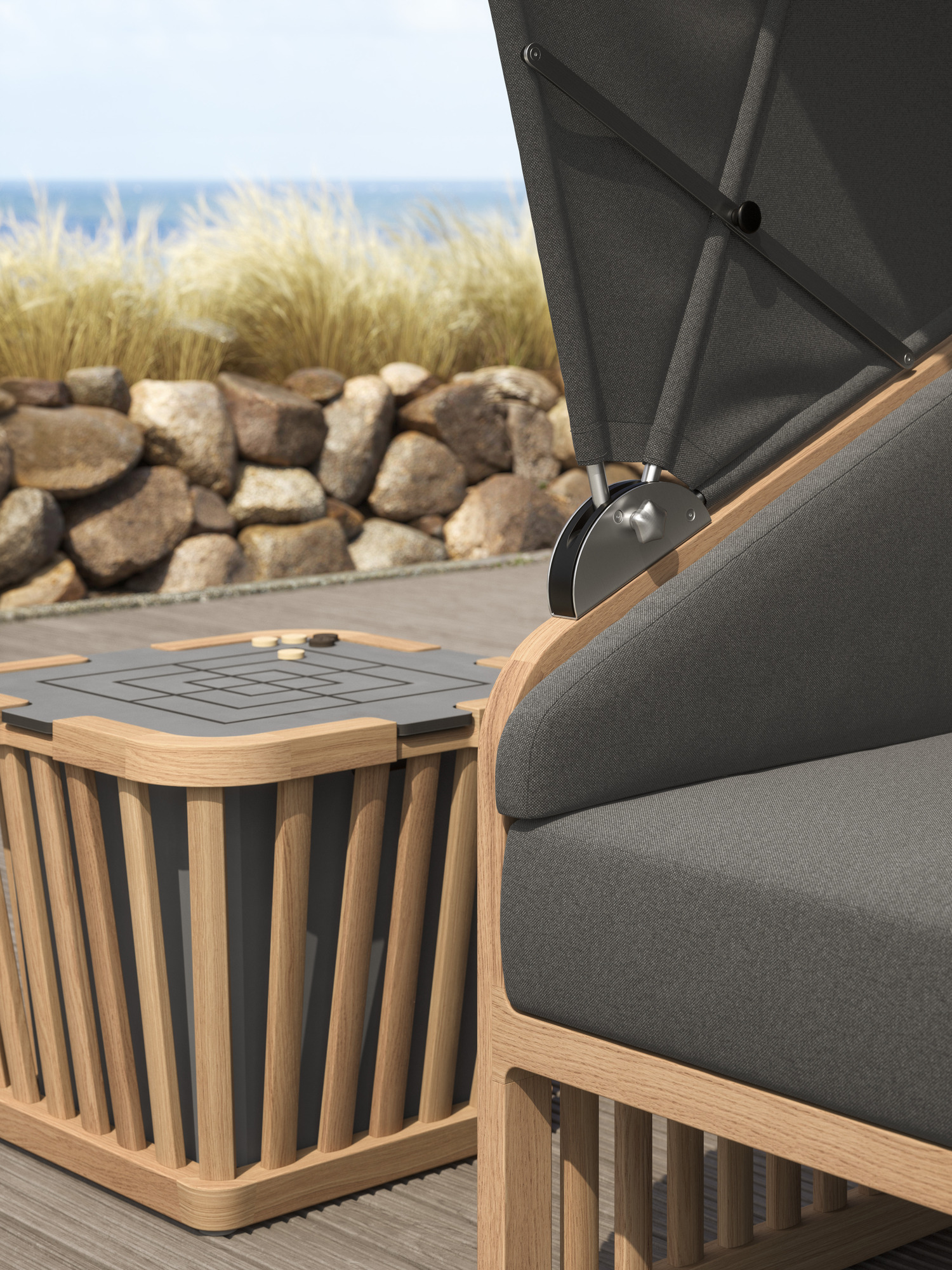 Ablagefläche für Snacks und Drinks oder großzügiger Stauraum - das Newcastle Rack überrascht mit vielfältigen Möglichkeiten der Nutzung. In seinem Inneren finden die mitgelieferten Räder des Newcastle, die Abdeckhaube und die Schutzhülle für das Sommerdach einen sicheren und trockenen Stauraum. Der Deckel lässt sich zudem im Handumdrehen zu einem Mühle Spielfeld verwandeln.