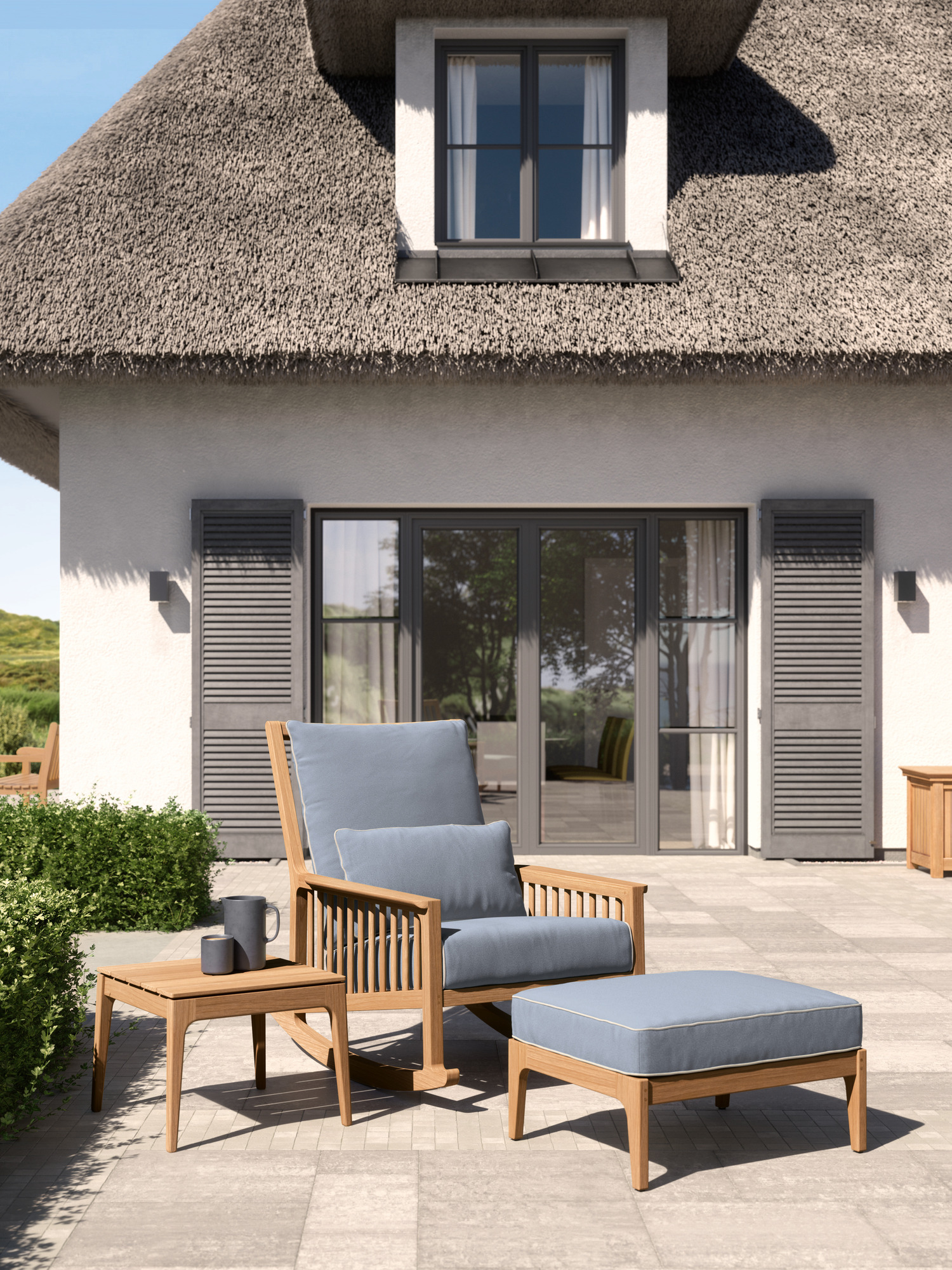 In die großzügigen Polstermöbel im Loungeformat zieht man sich gerne zurück. Ihre Rahmen sind aus hochwertigem Plantagenteakholz gefertigt, die Sitzflächen mit einem Gewebe bespannt, das die komfortablen Polster sicher trägt. Als markantes Merkmal verleihen aufwendig verarbeitete Keder dem klassischen Refugium seine maritime Anmutung. Alle Kissen sind farbig umrandet.