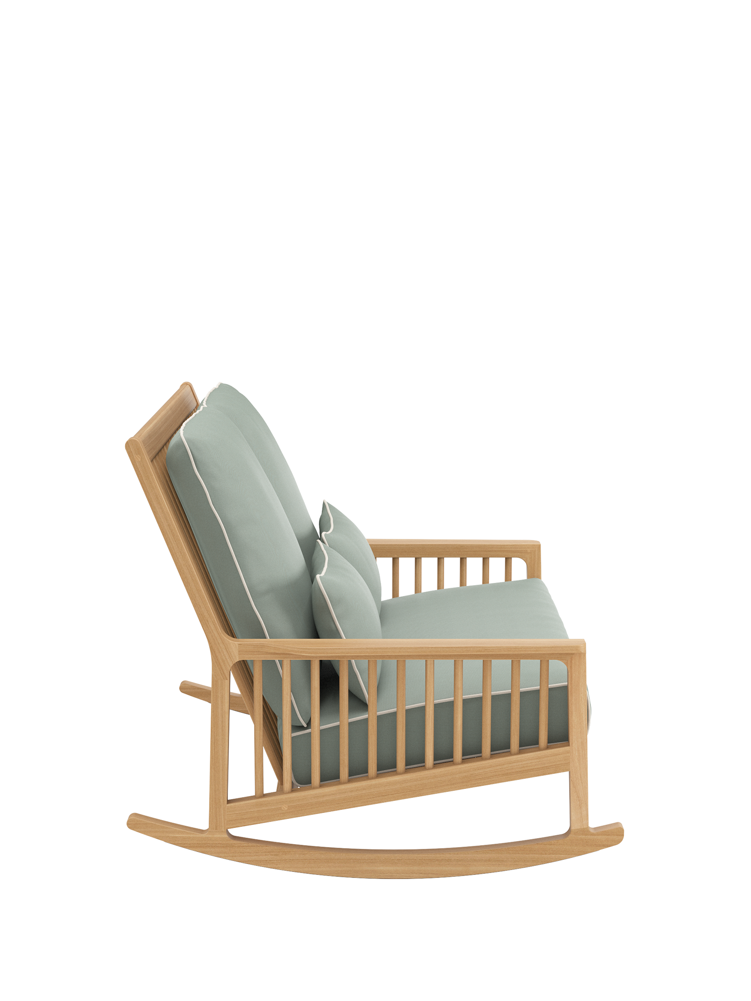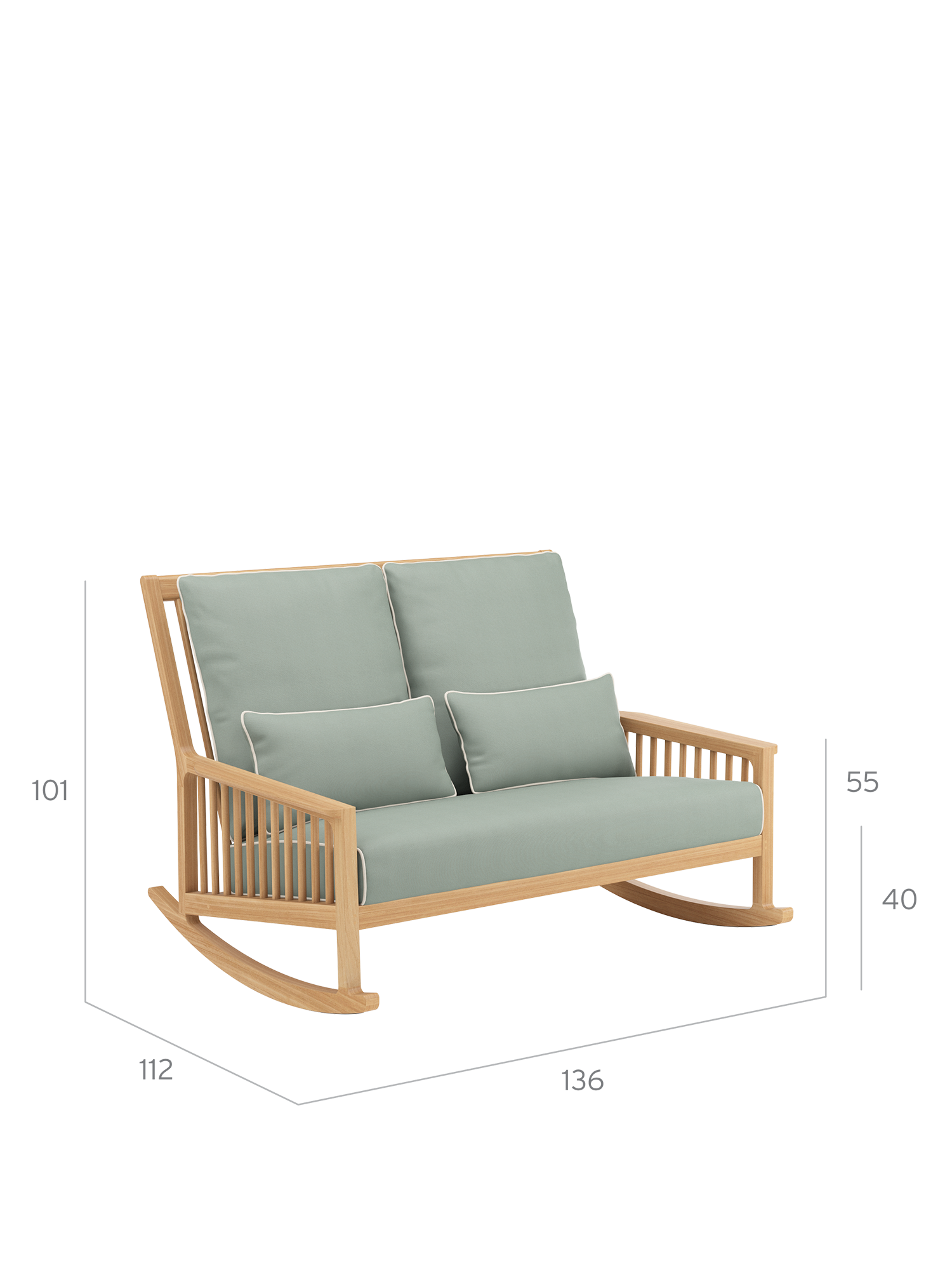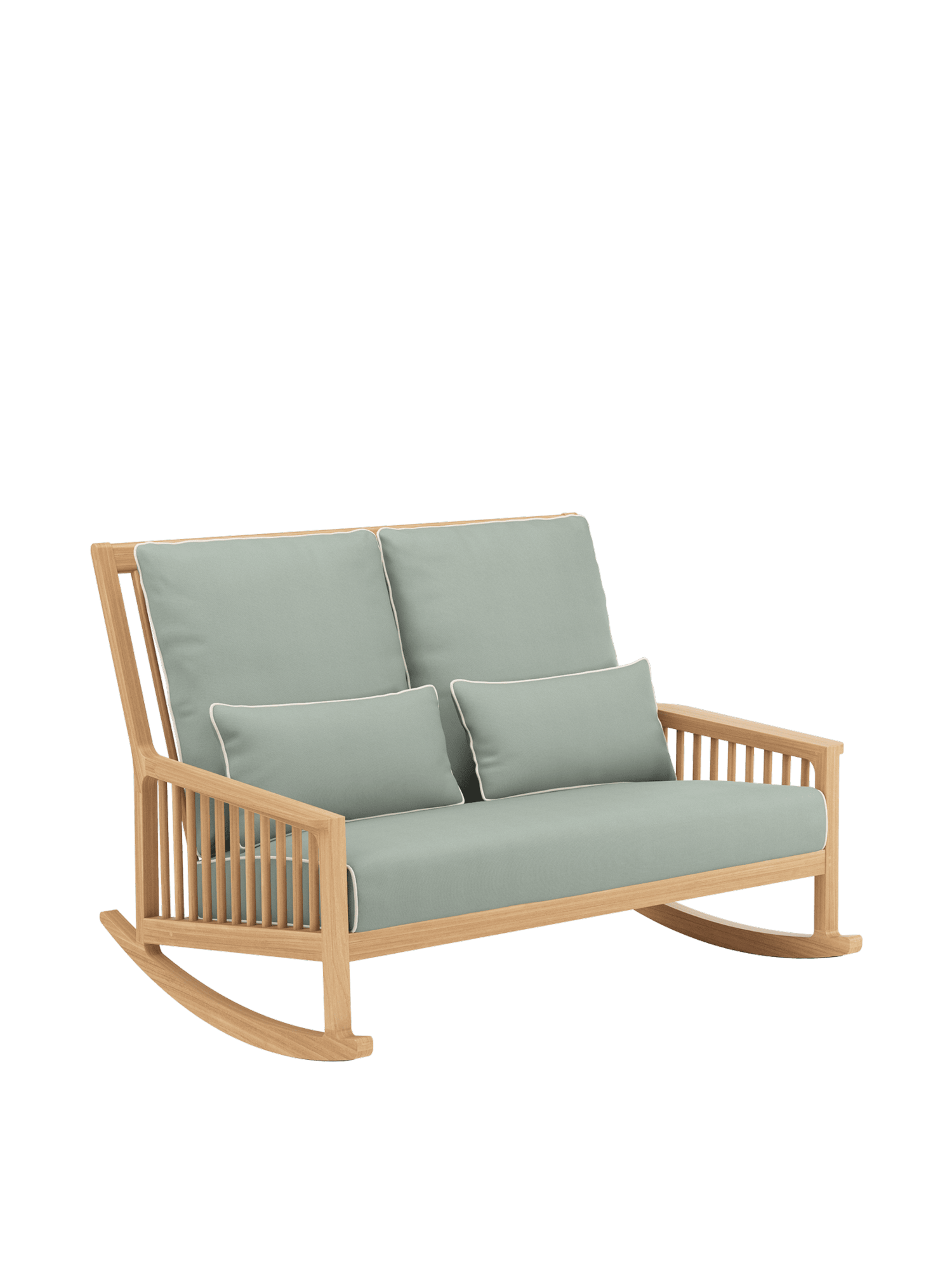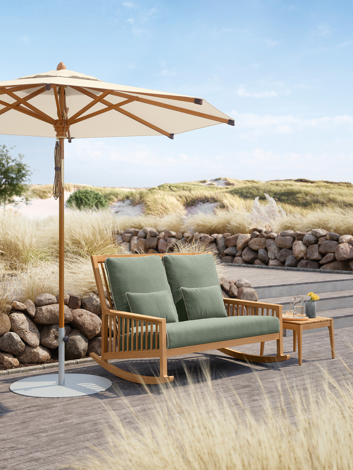 Die bewährten Qualitäten von Gartenbank und Schaukelstuhl potenzieren sich, wenn man sie vereint. Der Zweisitzer ist dazu da, glückliche Stunden zu teilen und Behaglichkeit Seite an Seite zu genießen. Newhaven verwöhnt dabei mit einer schulterhohen Rückenlehne und besonders tiefem Sitz. Klassisches Teak bringt die nötige Bodenhaftung, elegantes Design den erwünschten Schwung. Hat man beide Sitzplätze einmal ganz für sich allein, kann man sich darauf auch ausstrecken, die Beine hoch- und eines der weichen Kissen unter den Kopf legen.