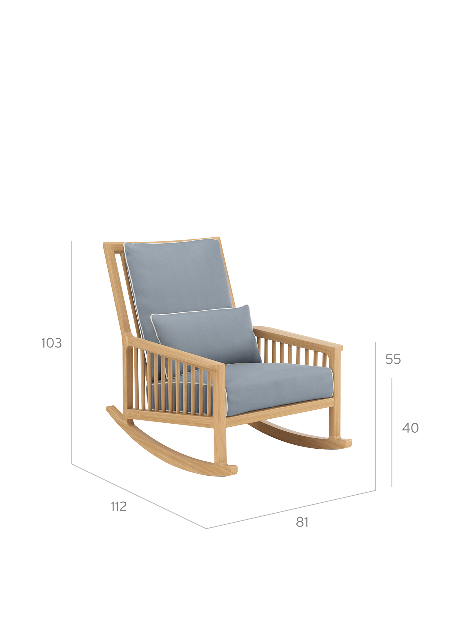 Mit schulterhohem Rücken ist er zum Anlehnen geschaffen, seine bequeme Tiefe ist besonders einladend. Kurz Schwung holen, die Beine anziehen und sich auf eleganten Teakkufen wiegen – in den traumhaft weichen Polstern des Schaukelstuhls versinkt man gern. Eine unter seinen Kufen angebrachte schmale Kunststoffschiene schützt empfindliche Böden.