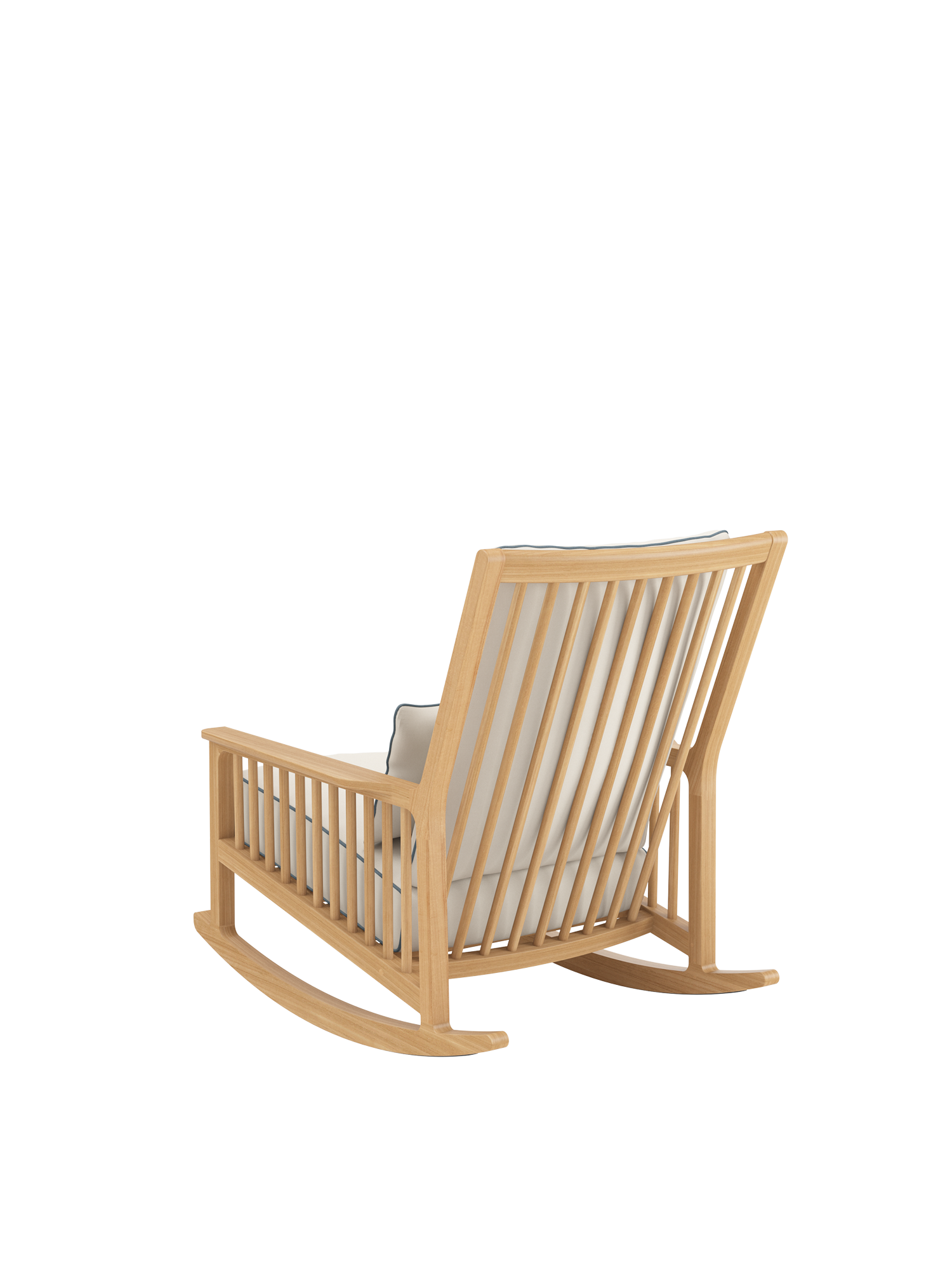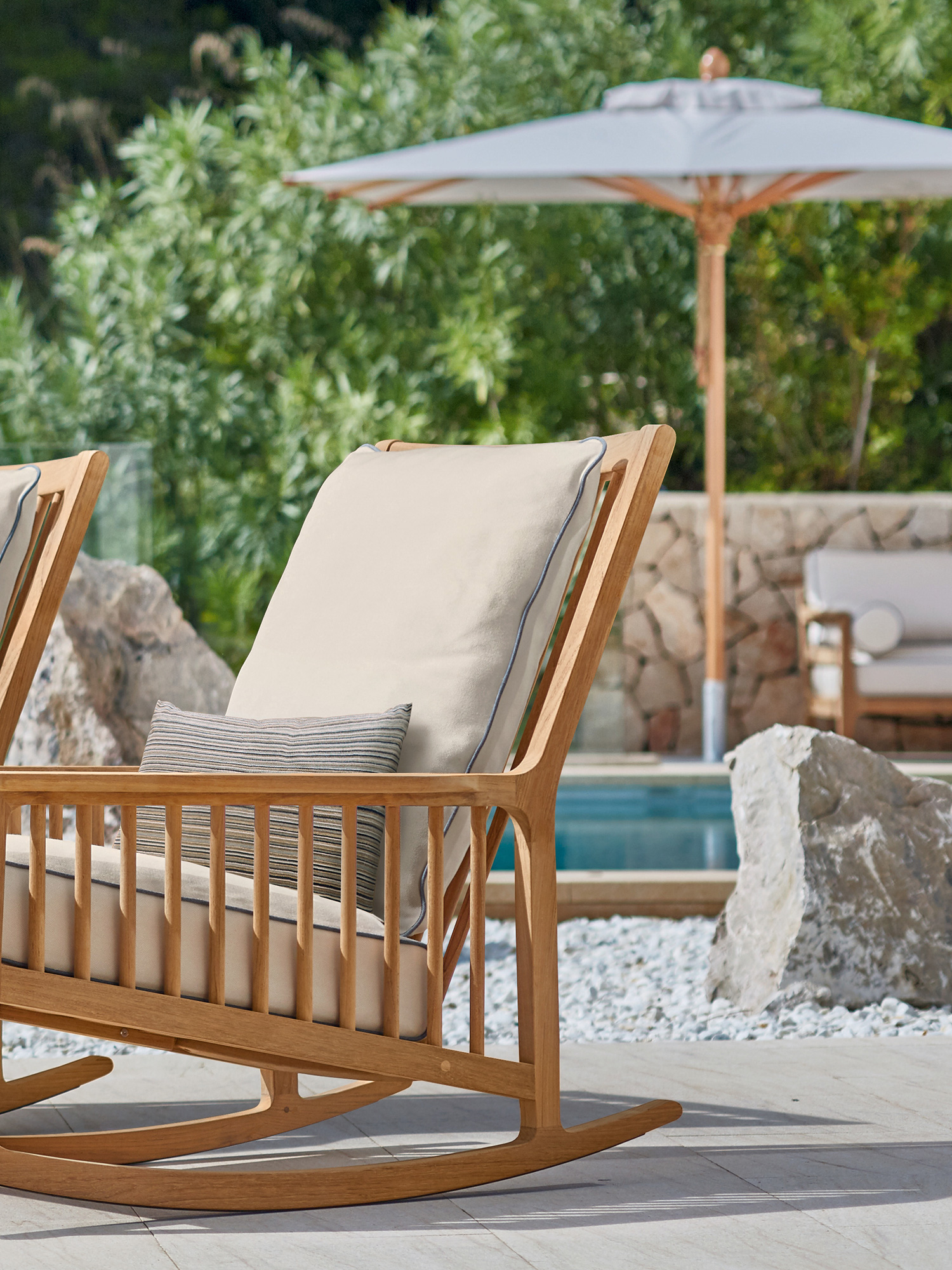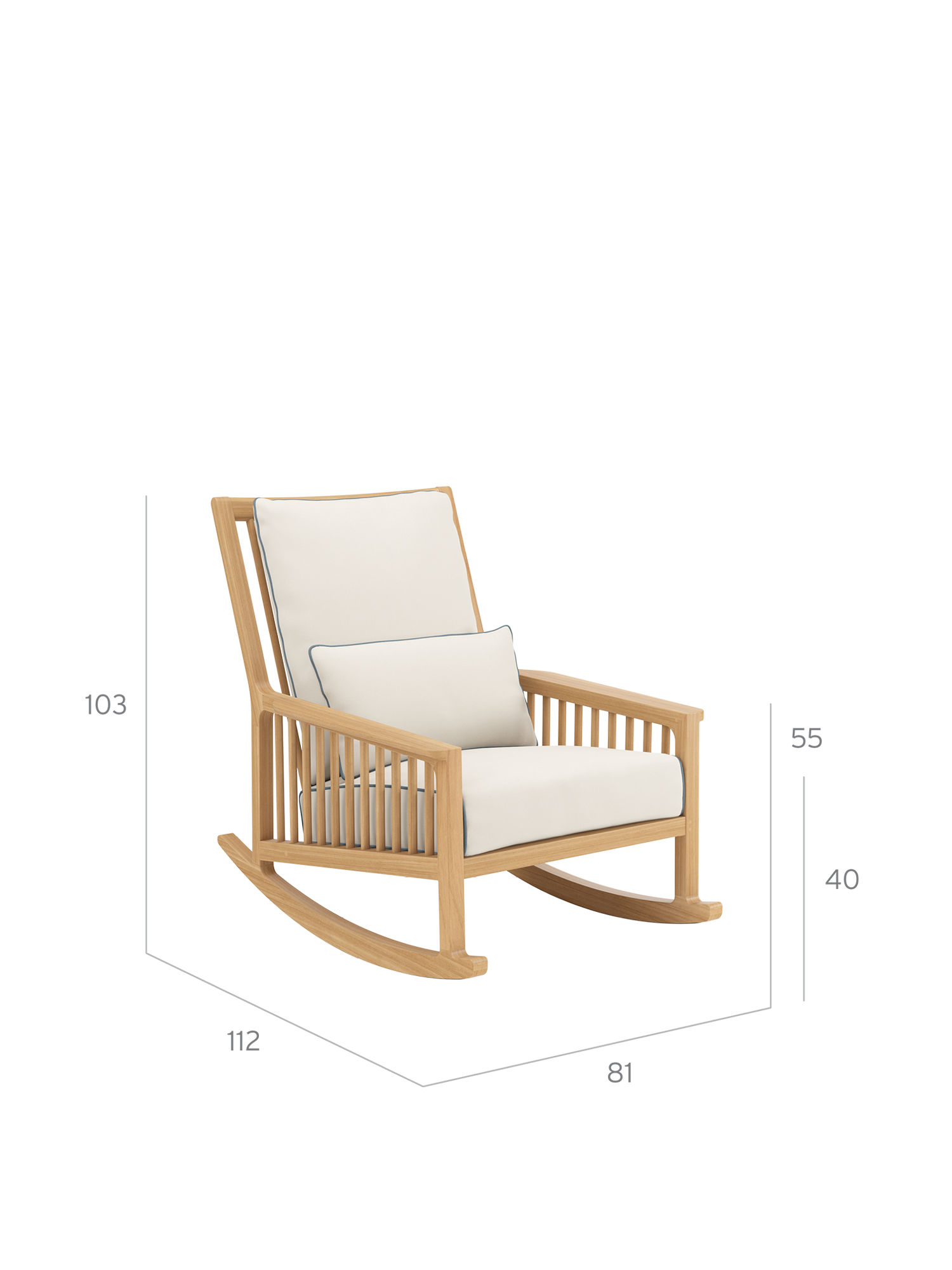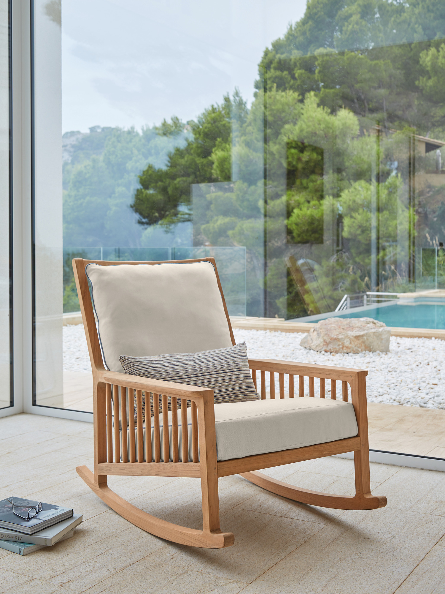 Mit schulterhohem Rücken ist er zum Anlehnen geschaffen, seine bequeme Tiefe ist besonders einladend. Kurz Schwung holen, die Beine anziehen und sich auf eleganten Teakkufen wiegen – in den traumhaft weichen Polstern des Schaukelstuhls versinkt man gern. Eine unter seinen Kufen angebrachte schmale Kunststoffschiene schützt empfindliche Böden.