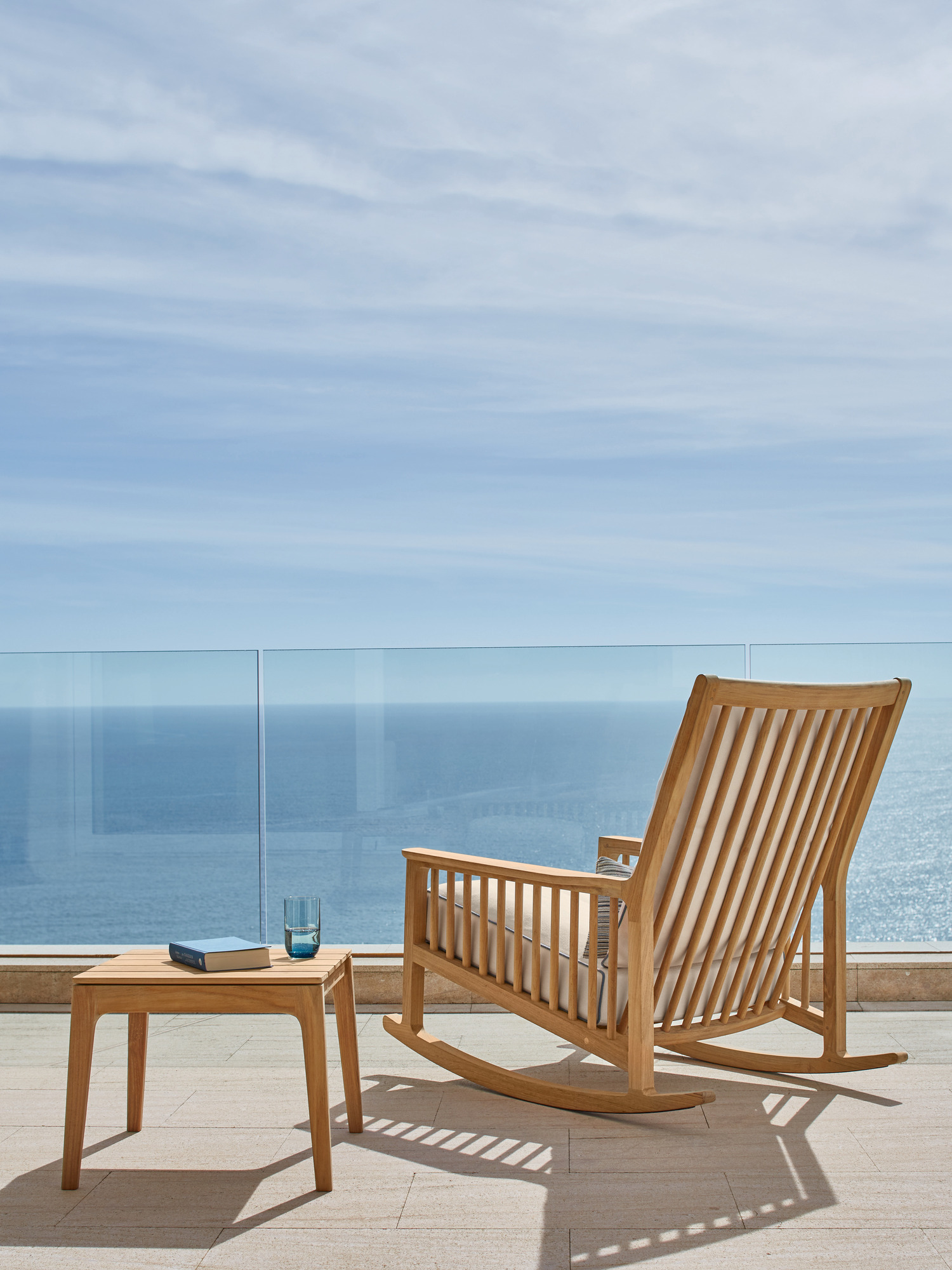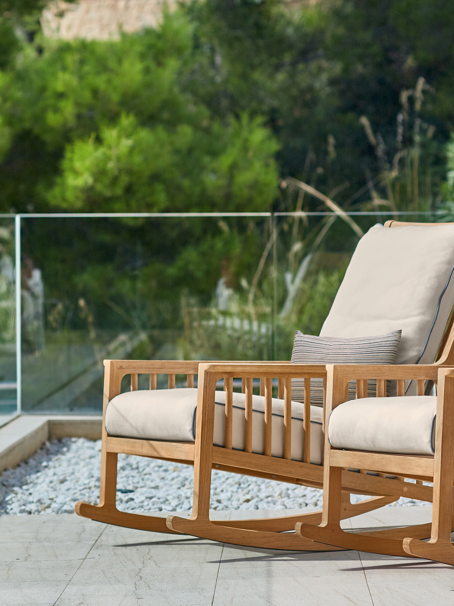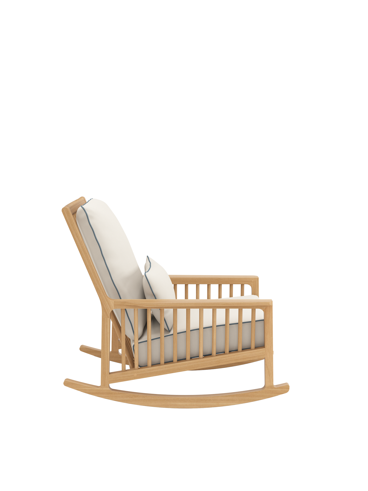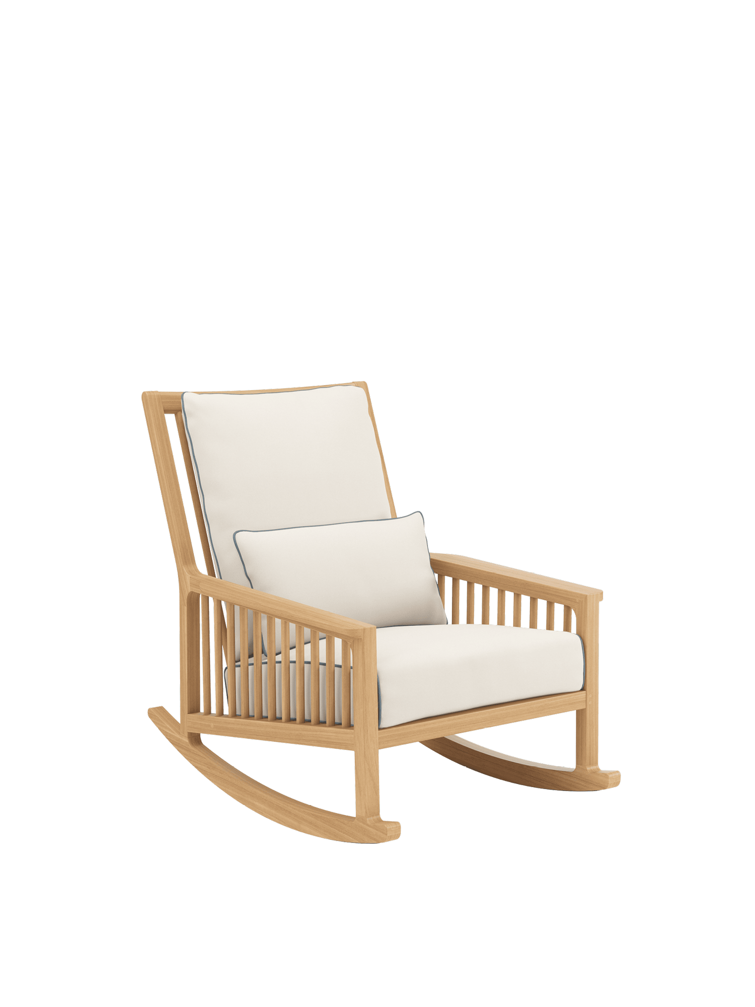 Mit schulterhohem Rücken ist er zum Anlehnen geschaffen, seine bequeme Tiefe ist besonders einladend. Kurz Schwung holen, die Beine anziehen und sich auf eleganten Teakkufen wiegen – in den traumhaft weichen Polstern des Schaukelstuhls versinkt man gern. Eine unter seinen Kufen angebrachte schmale Kunststoffschiene schützt empfindliche Böden.