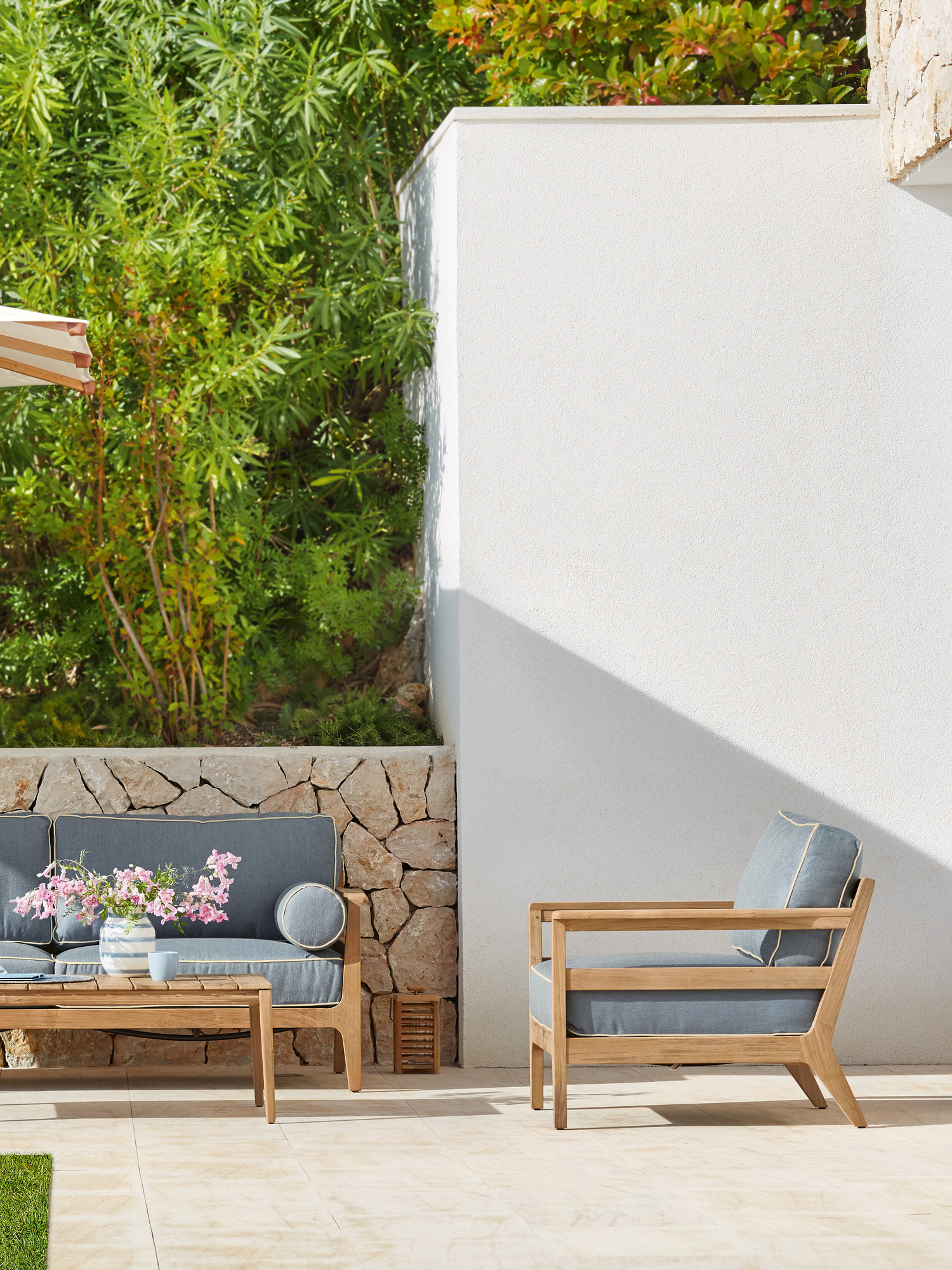 In die großzügigen Polstermöbel im Loungeformat zieht man sich gerne zurück. Ihre Rahmen sind aus hochwertigem Plantagenteakholz gefertigt, die Sitzflächen mit einem Gewebe bespannt, das die komfortablen Polster sicher trägt. Als markantes Merkmal verleihen aufwendig verarbeitete Keder dem klassischen Refugium seine maritime Anmutung. Alle Kissen sind farbig umrandet.