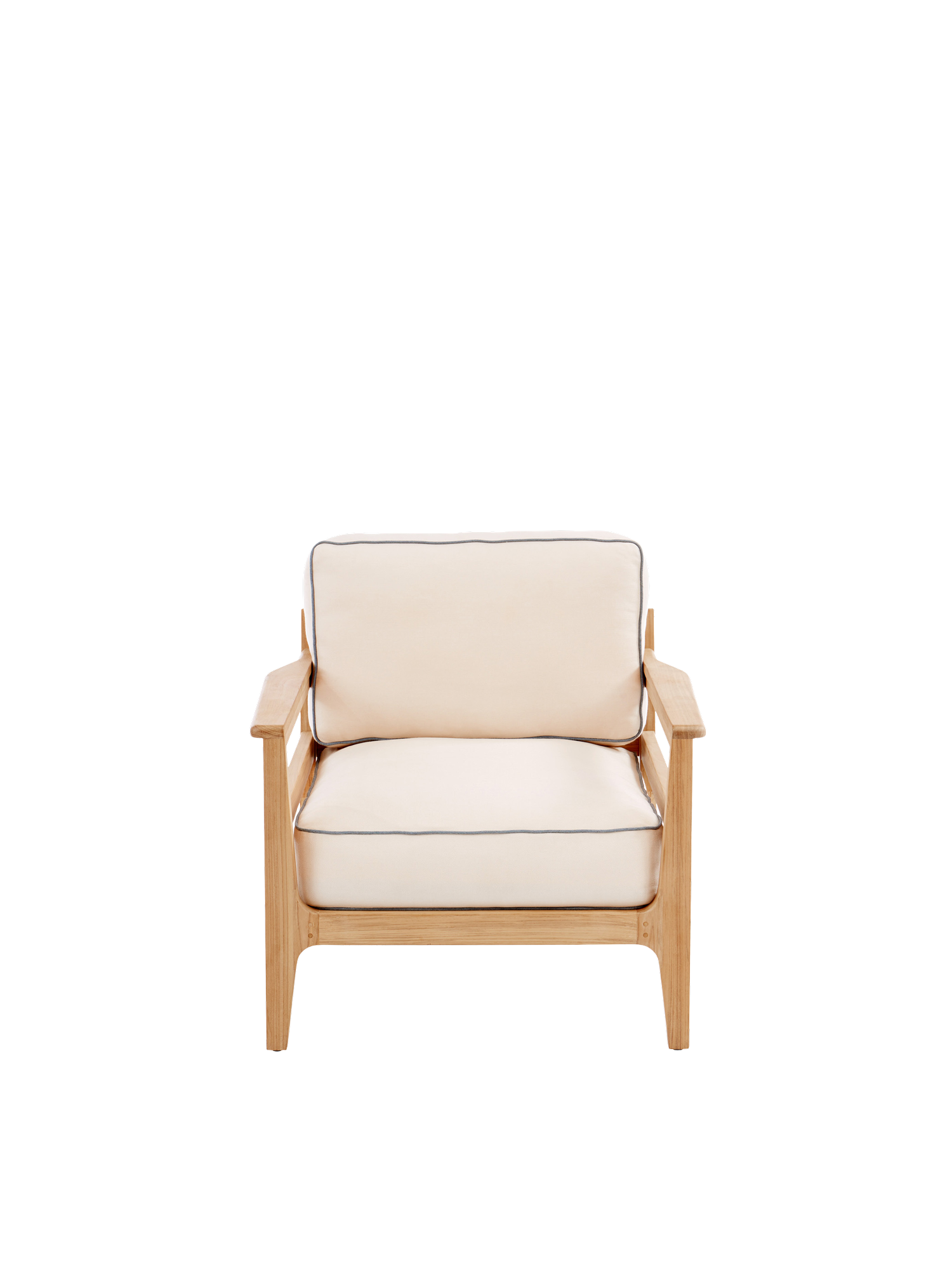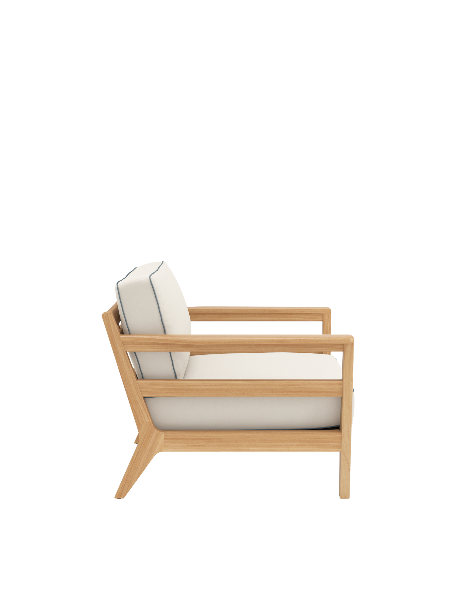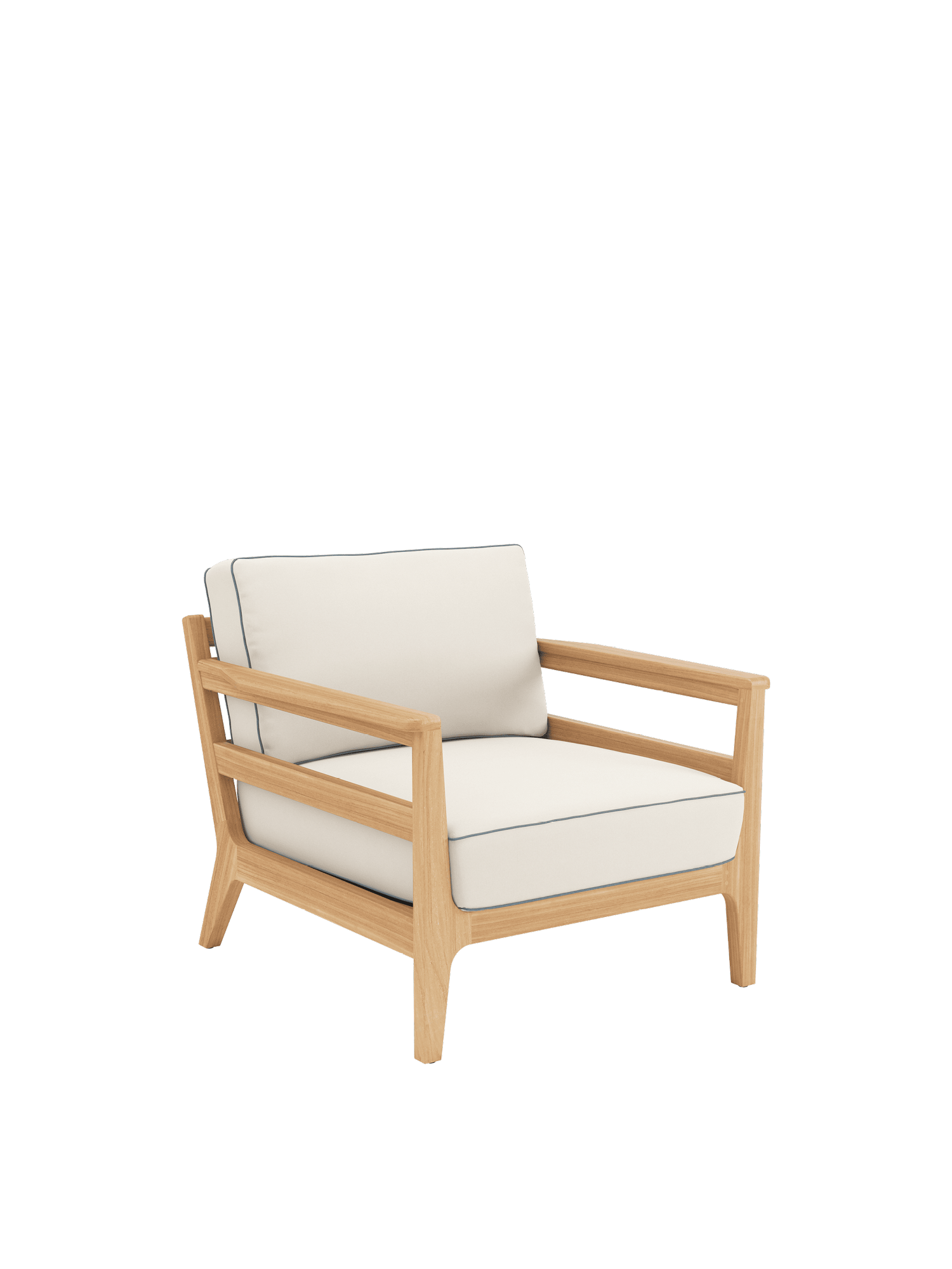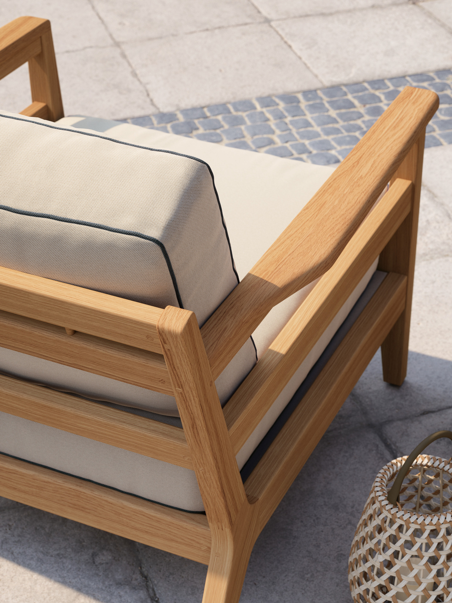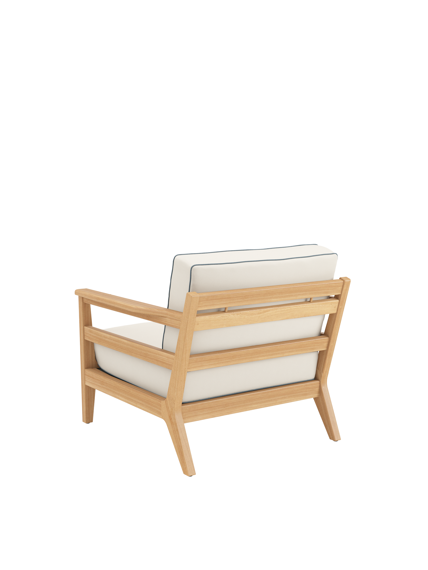 In die großzügigen Polstermöbel im Loungeformat zieht man sich gerne zurück. Ihre Rahmen sind aus hochwertigem Plantagenteakholz gefertigt, die Sitzflächen mit einem Gewebe bespannt, das die komfortablen Polster sicher trägt. Als markantes Merkmal verleihen aufwendig verarbeitete Keder dem klassischen Refugium seine maritime Anmutung. Alle Kissen sind farbig umrandet.