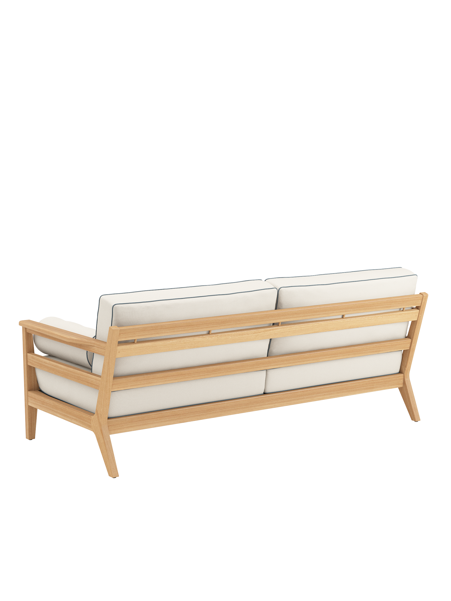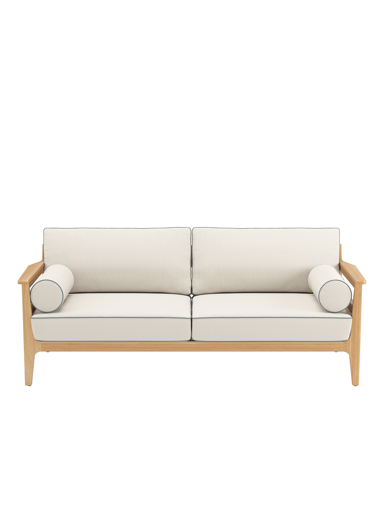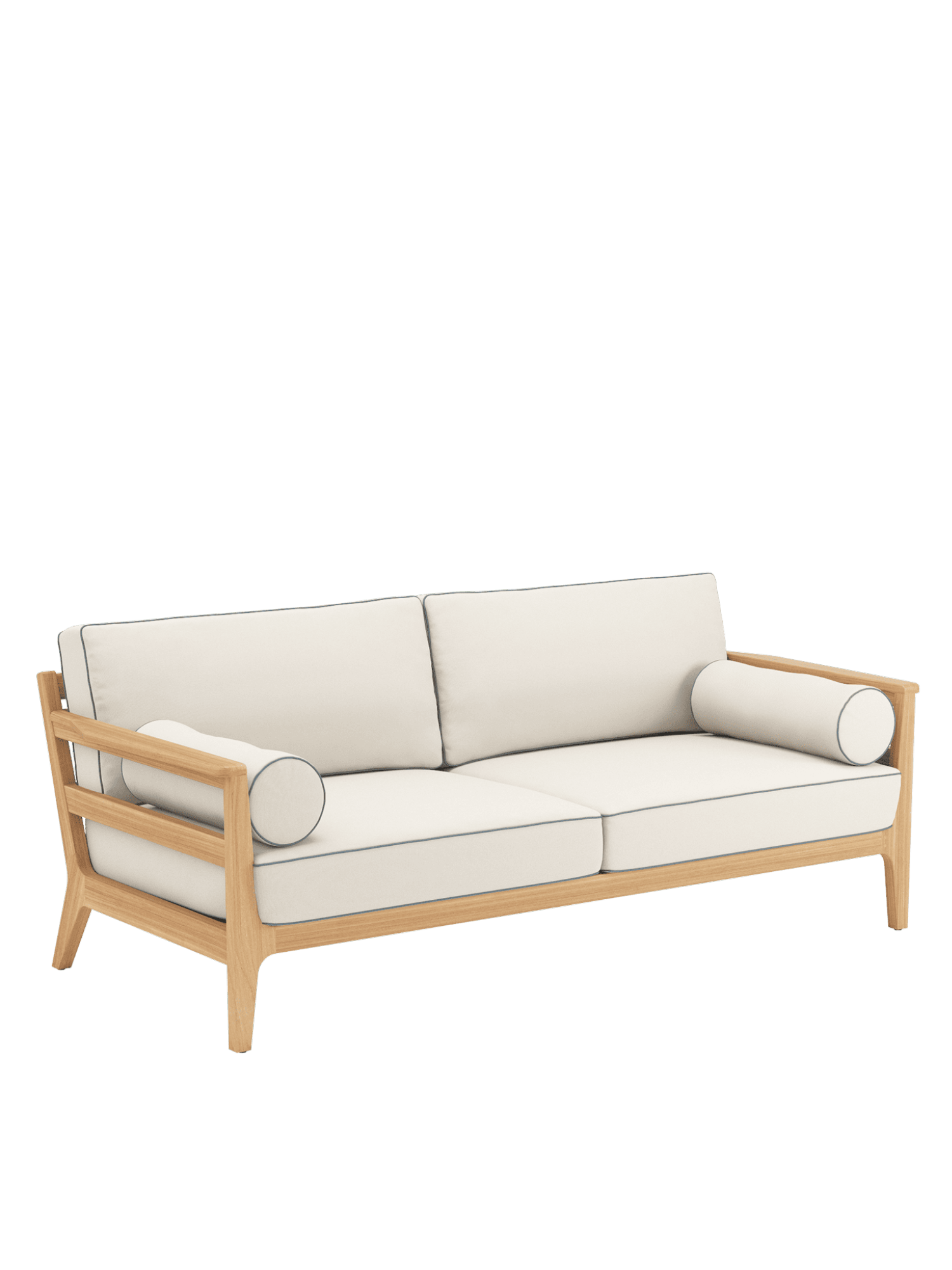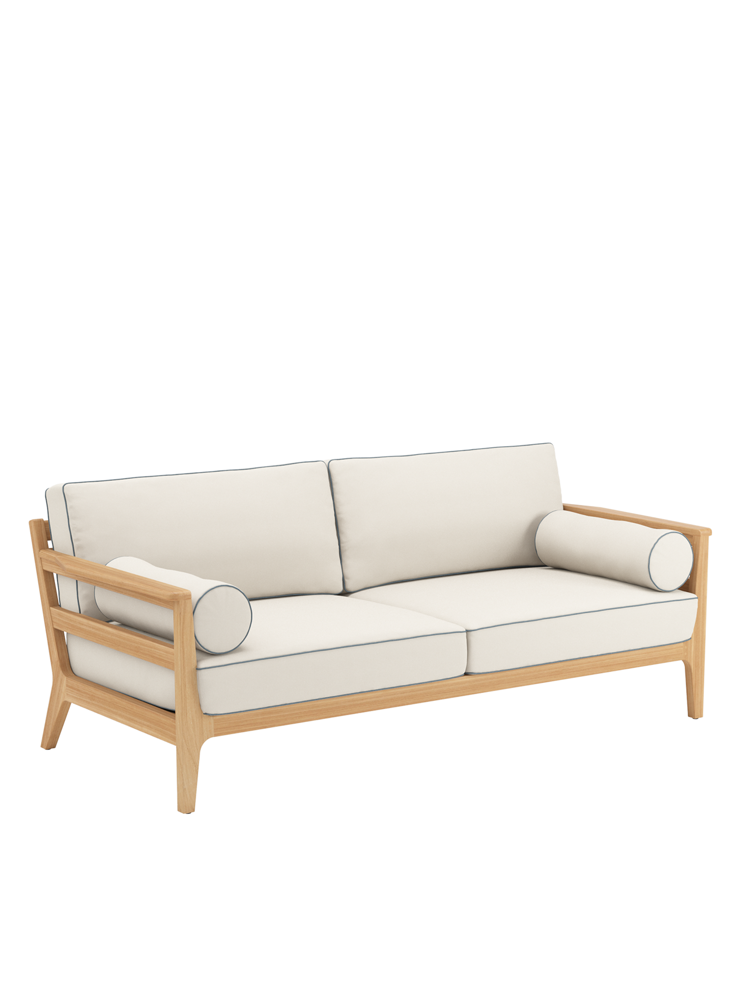 In die großzügigen Polstermöbel im Loungeformat zieht man sich gerne zurück. Ihre Rahmen sind aus hochwertigem Plantagenteakholz gefertigt, die Sitzflächen mit einem Gewebe bespannt, das die komfortablen Polster sicher trägt. Als markantes Merkmal verleihen aufwendig verarbeitete Keder dem klassischen Refugium seine maritime Anmutung. Alle Kissen sind farbig umrandet, auch die Polsterrollen, die den Sofas als Armlehnen dienen.