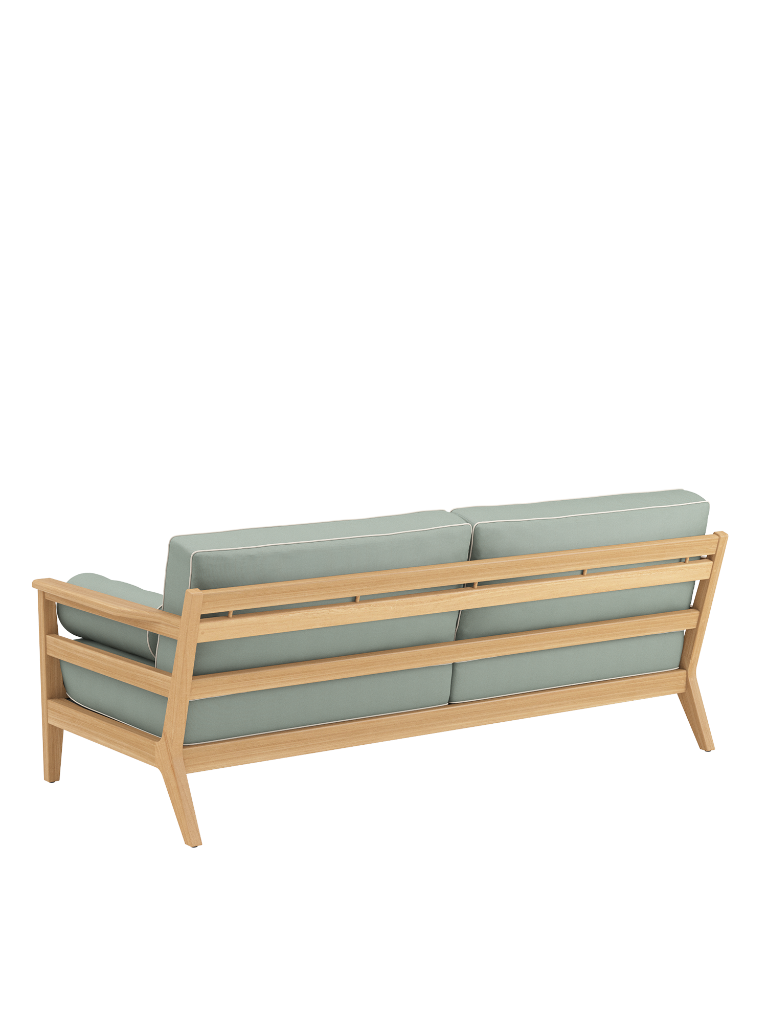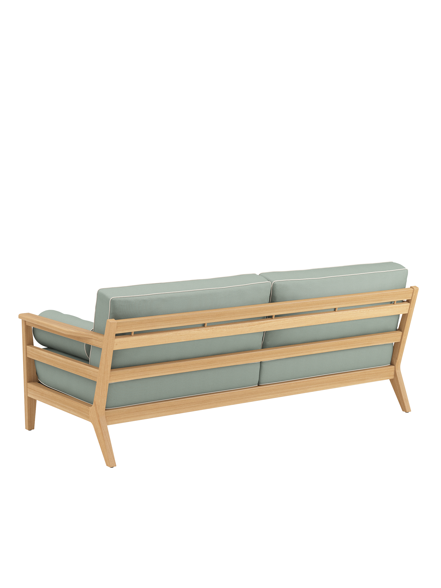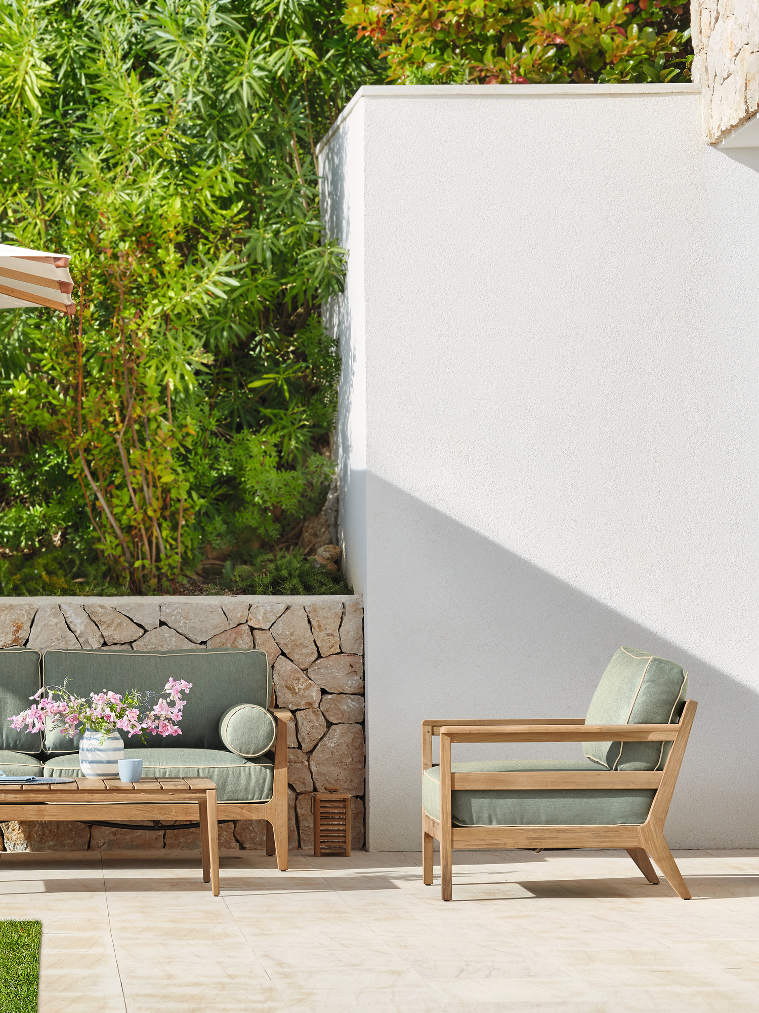 In die großzügigen Polstermöbel im Loungeformat zieht man sich gerne zurück. Ihre Rahmen sind aus hochwertigem Plantagenteakholz gefertigt, die Sitzflächen mit einem Gewebe bespannt, das die komfortablen Polster sicher trägt. Als markantes Merkmal verleihen aufwendig verarbeitete Keder dem klassischen Refugium seine maritime Anmutung. Alle Kissen sind farbig umrandet, auch die Polsterrollen, die den Sofas als Armlehnen dienen.