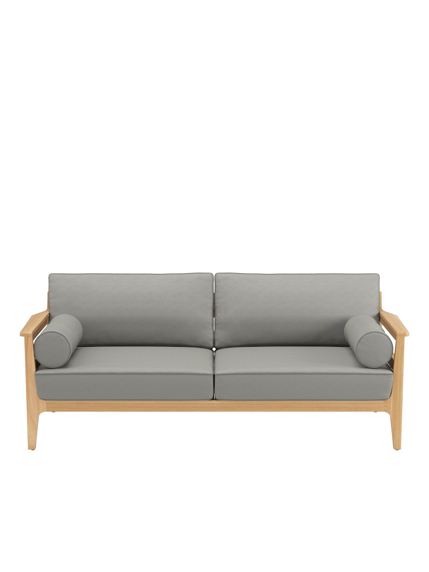 In die großzügigen Polstermöbel im Loungeformat zieht man sich gerne zurück. Ihre Rahmen sind aus hochwertigem Plantagenteakholz gefertigt, die Sitzflächen mit einem Gewebe bespannt, das die komfortablen Polster sicher trägt. Als markantes Merkmal verleihen aufwendig verarbeitete Keder dem klassischen Refugium seine maritime Anmutung. Alle Kissen sind farbig umrandet, auch die Polsterrollen, die den Sofas als Armlehnen dienen.