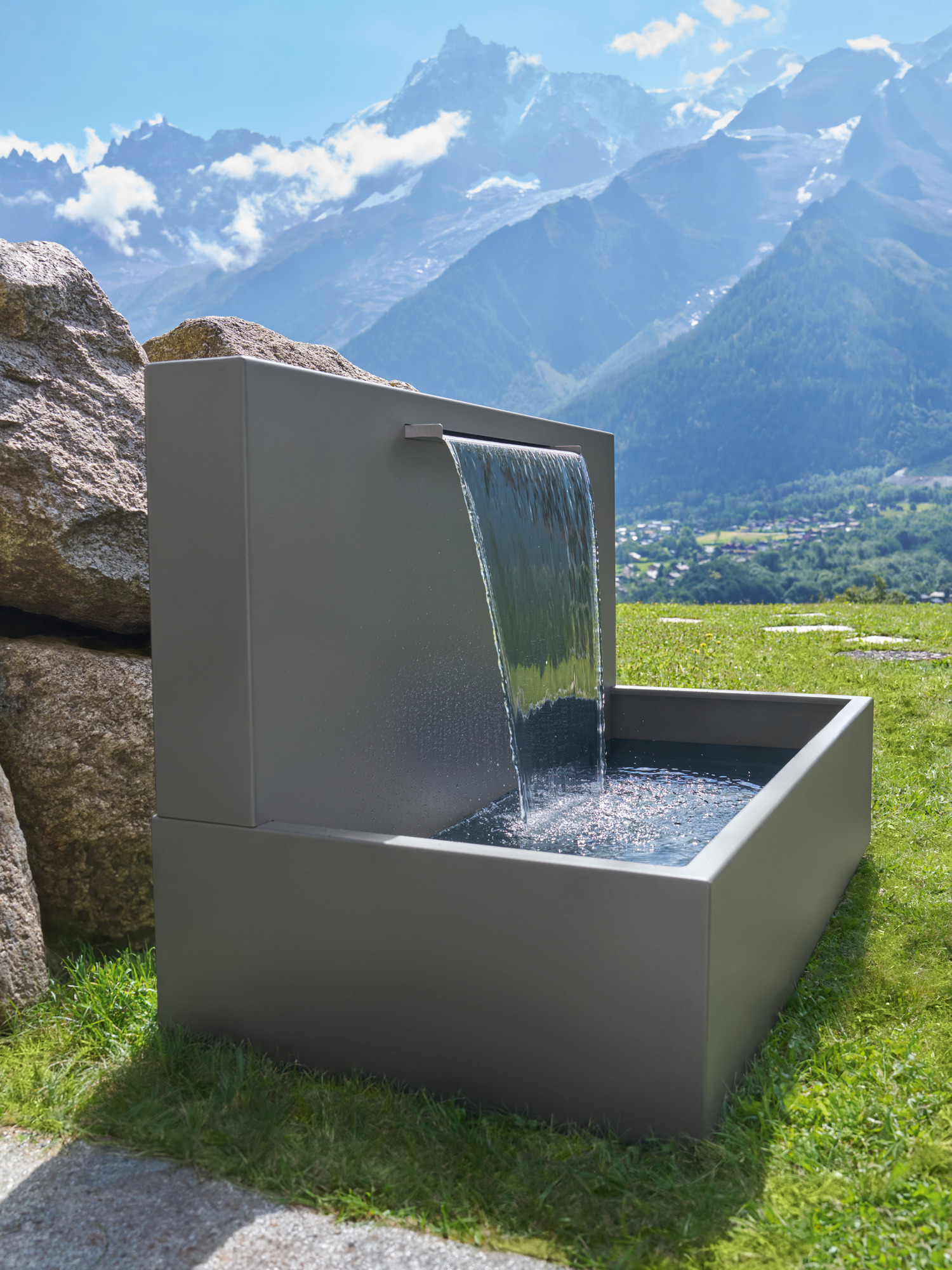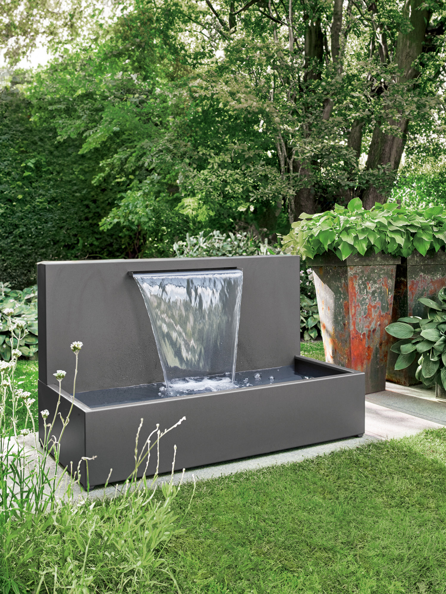 Die klaren Formen des hochwertigen Brunnens aus wetterfesten Materialien bilden einen großzügigen Rahmen für den natürlichen Lauf des Wassers.