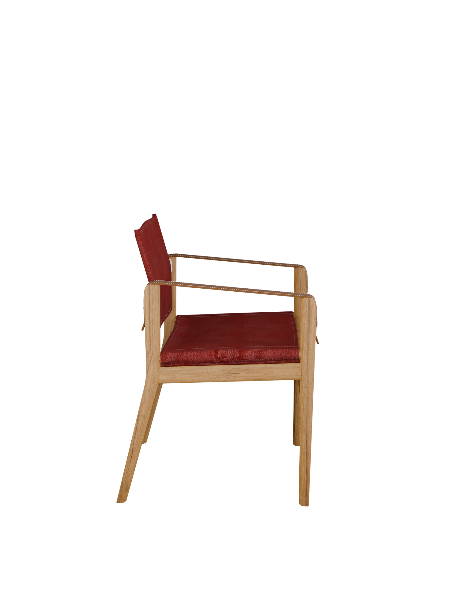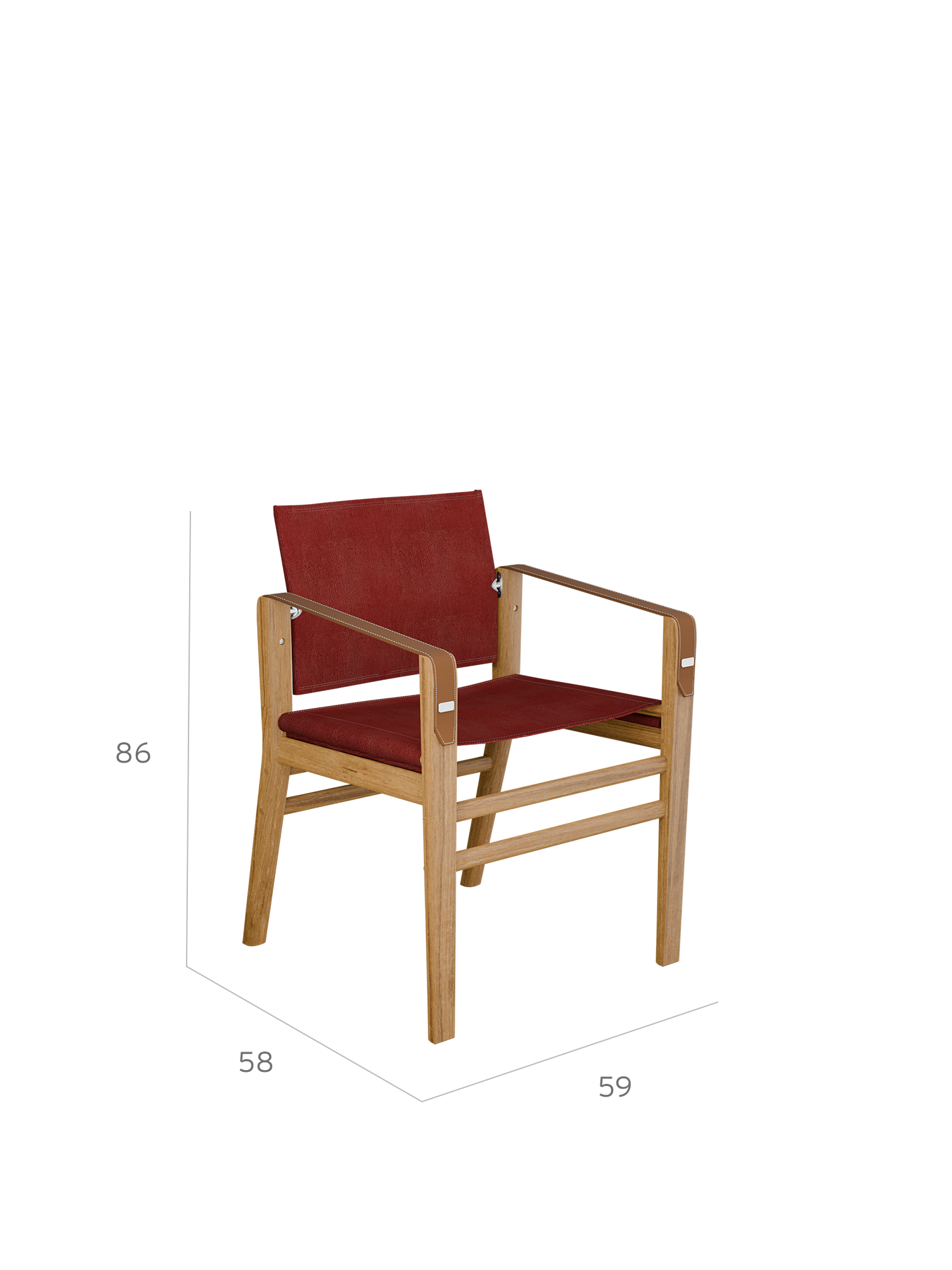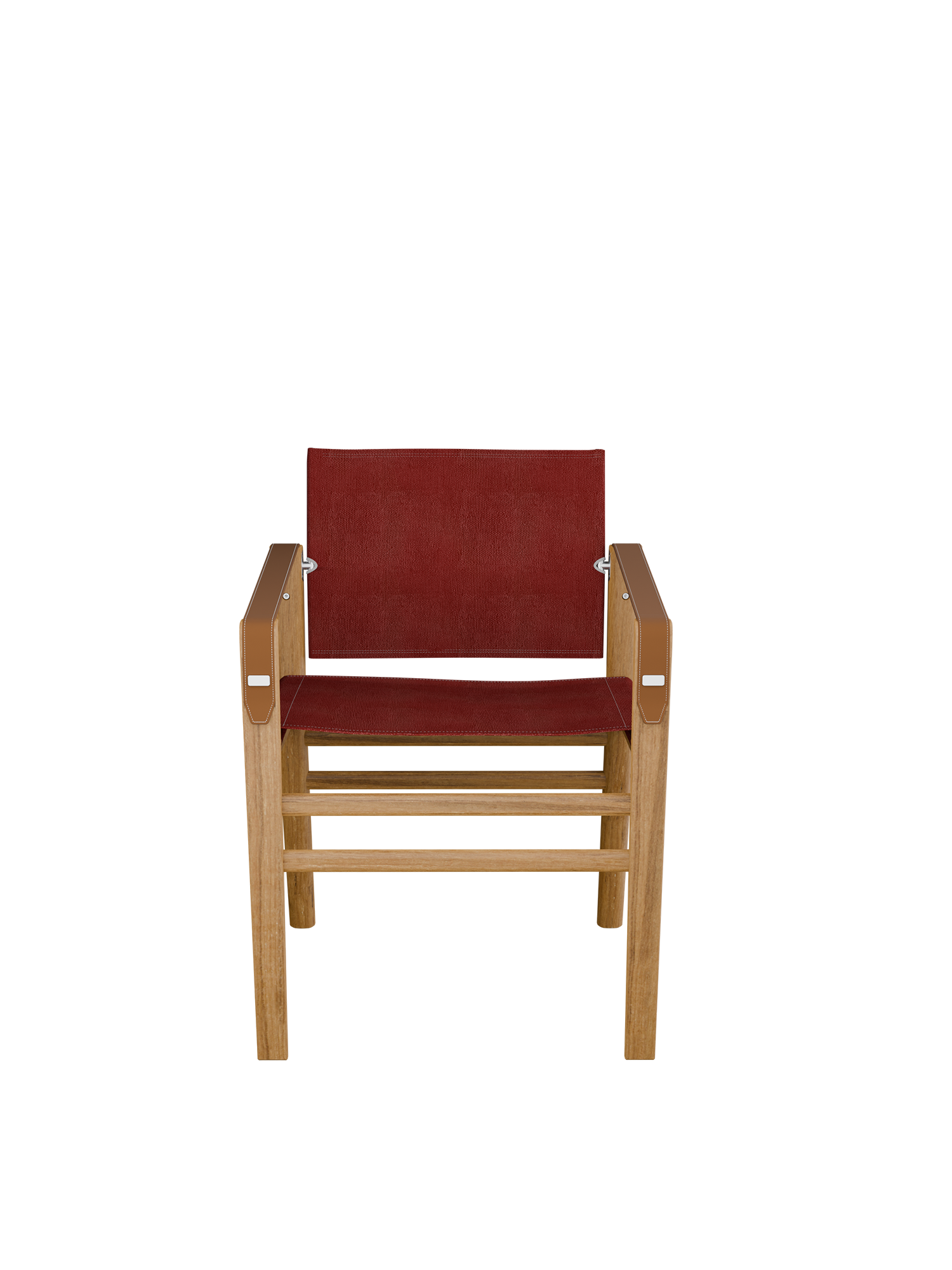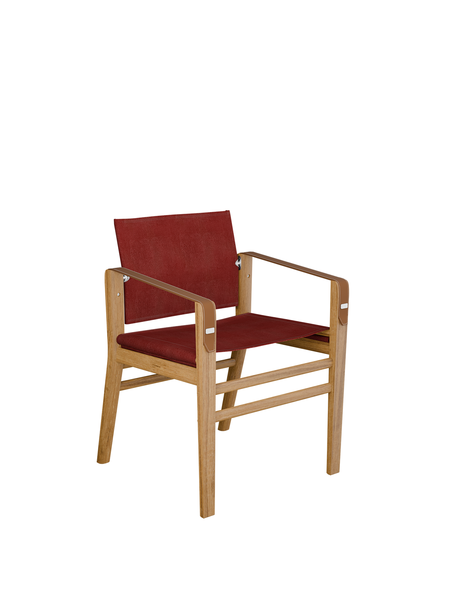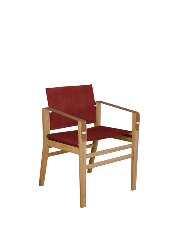 Der Stuhl besteht aus FSC-zertifiziertem Plantagenteak und hat funktionale Details aus Edelstahl. Seine Armlehnen aus gestepptem Echtleder entwickeln im Laufe der Zeit eine Patina. Wir empfehlen, den Stuhl in überdachten Außenräumen zu nutzen oder ihn unter freiem Himmel mit einer separat erhältlichen Abdeckhaube vor Witterungseinflüssen zu schützen.