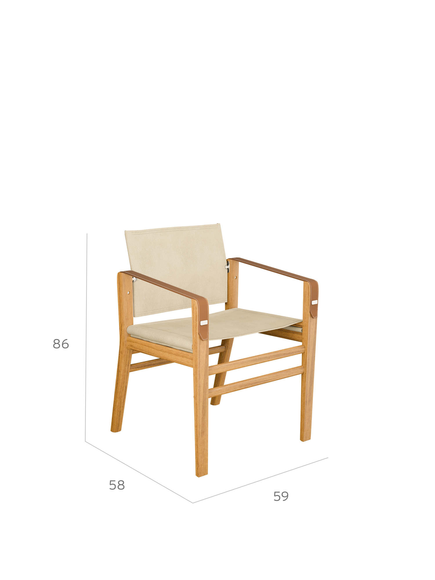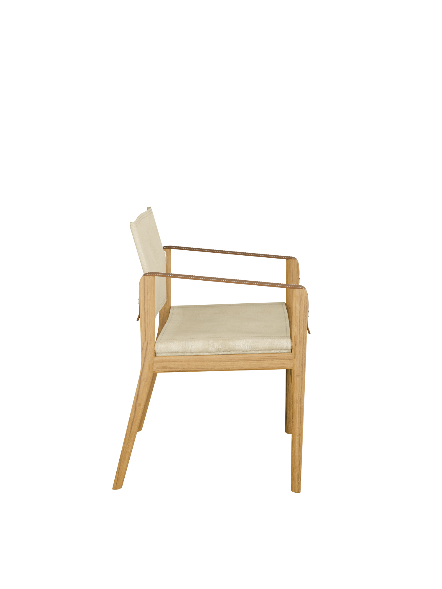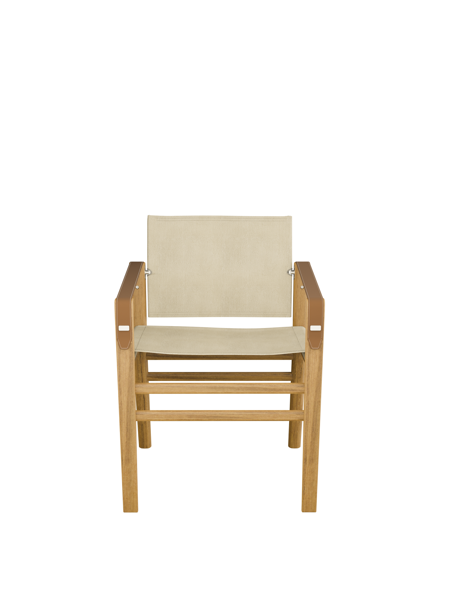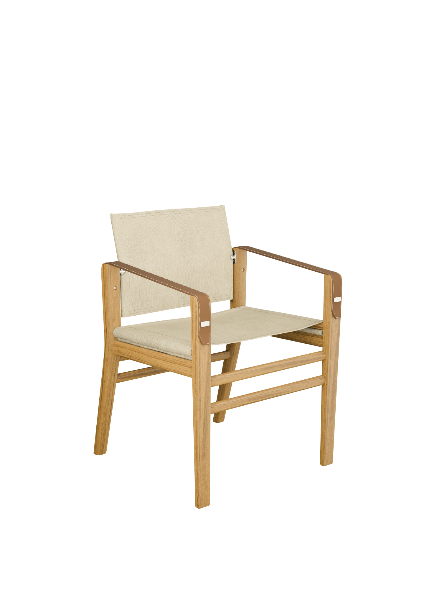 Der Stuhl besteht aus FSC-zertifiziertem Plantagenteak und hat funktionale Details aus Edelstahl. Seine Armlehnen aus gestepptem Echtleder entwickeln im Laufe der Zeit eine Patina. Wir empfehlen, den Stuhl in überdachten Außenräumen zu nutzen oder ihn unter freiem Himmel mit einer separat erhältlichen Abdeckhaube vor Witterungseinflüssen zu schützen.