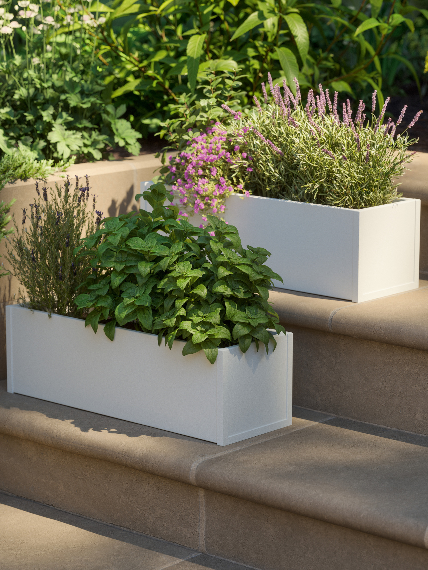 Die Pflanzkästen mit einer samtigen Oberfläche aus weiß pulverbeschichtetem Aluminium sind als 2er-Set zu bestellen. Sie sind jeweils mit vier Löchern versehen, durch die Gieß- oder Regenwasser ablaufen kann. Für die Fensterbank liefern wir passende Verschlüsse für die vorhandenen Abzugslöcher mit.
