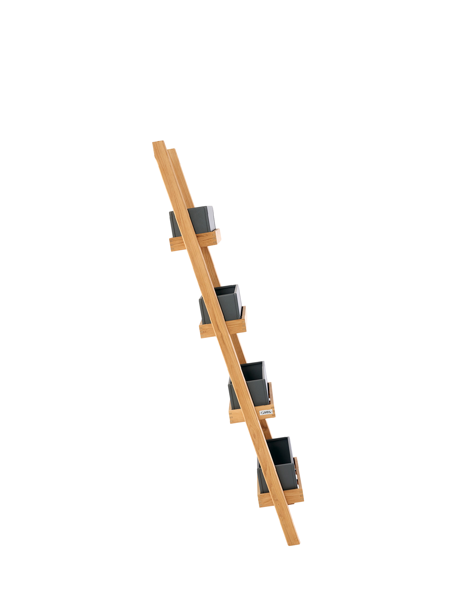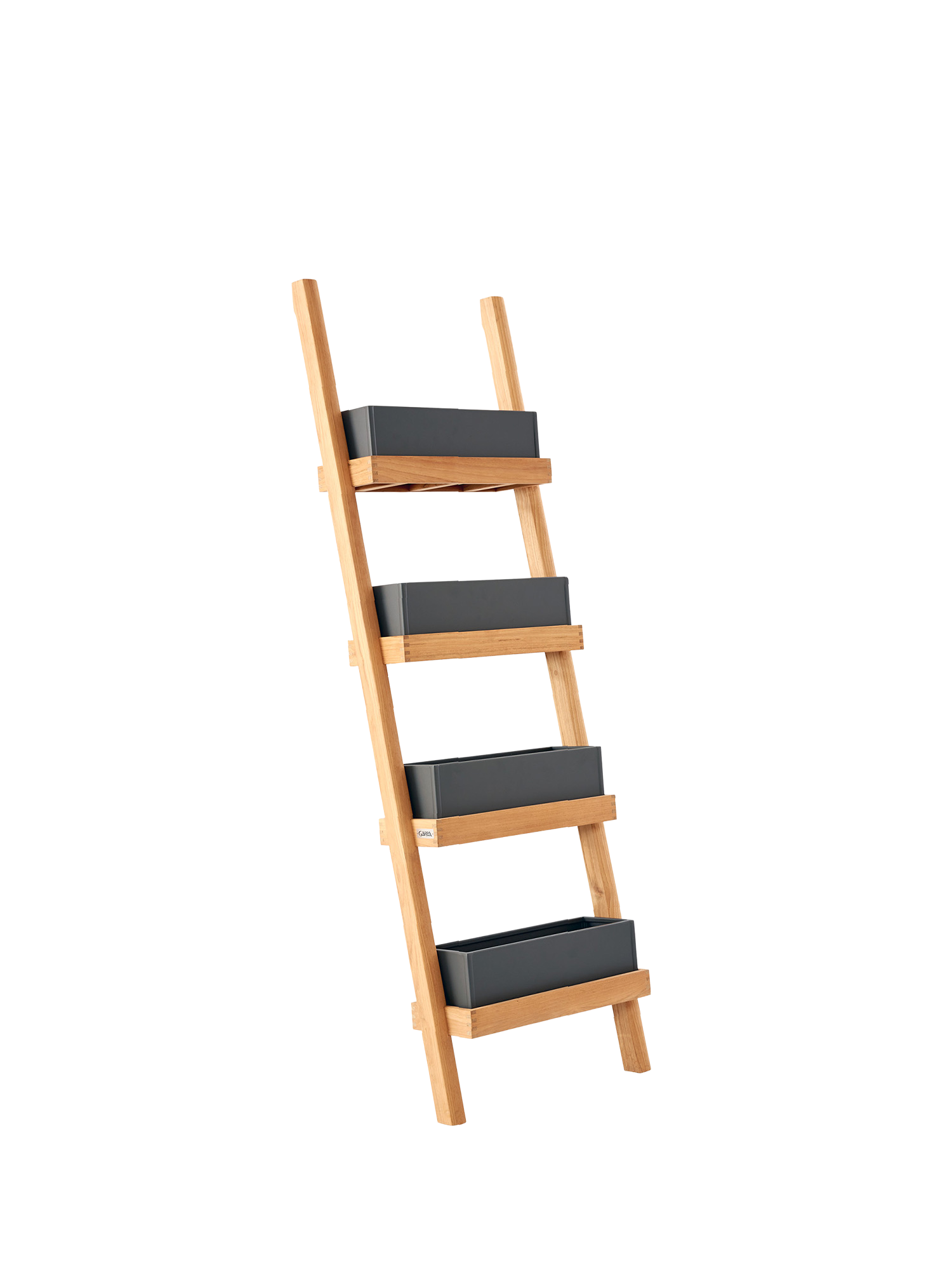 Auf der Pflanzleiter aus Teak, die an die Wand gelehnt oder mit einem zusätzlichen Set frei aufgestellt wird, wächst der Stolz des Stadt- und Balkongärtners geradezu über sich hinaus. In vier Pflanzkästen aus Aluminium, wahlweise in Weiß oder Graphit, lassen sich auf vier Ebenen kleinere Stauden und Blumen ziehen oder Küchenkräuter pflückfrisch ernten. Die Kästen sind mit jeweils vier Löchern versehen, durch die das Wasser nach dem Gießen oder einem Regenschauer ablaufen kann. Passende Verschlüsse für die Abzugslöcher liefern wir mit.