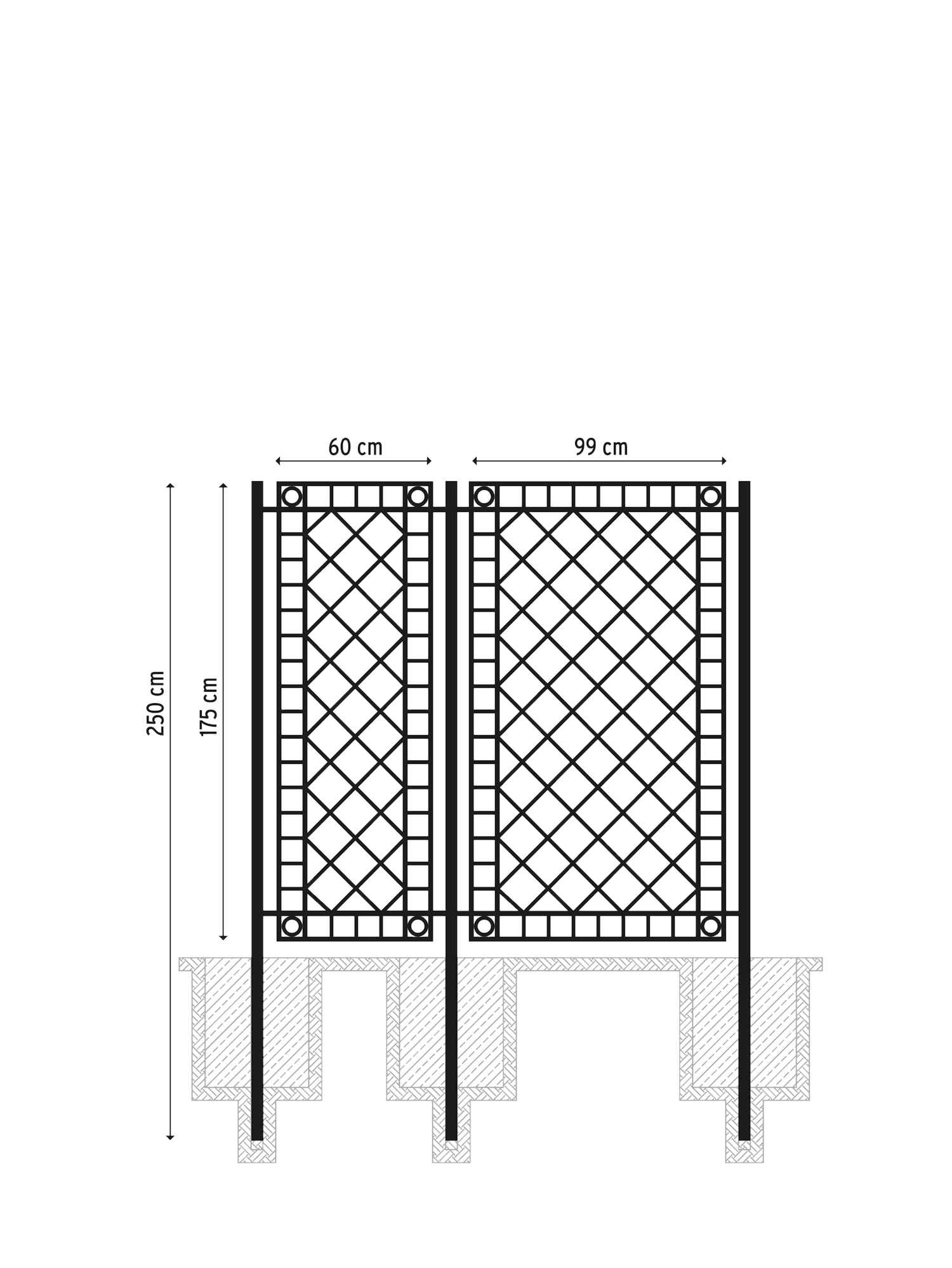 Die Pfosten dienen zur Verbindung der einzelnen Elemente und können in dieser längeren Version zur Stabilisierung im Rasen oder auf anderen weichen Untergründen einbetoniert werden.