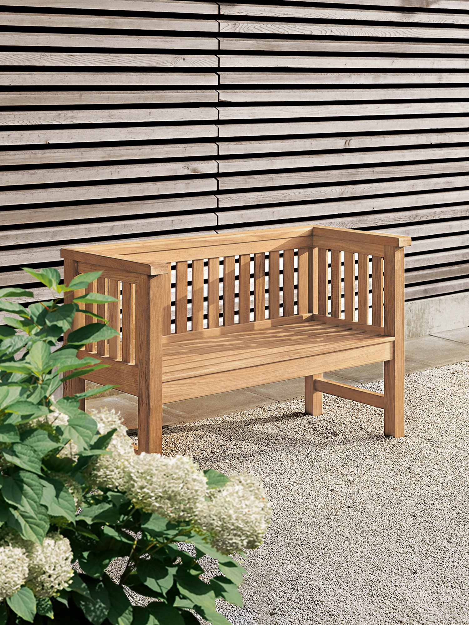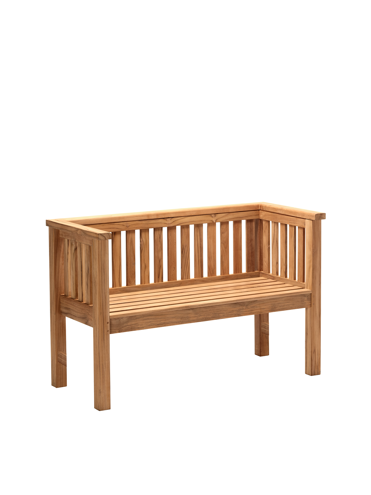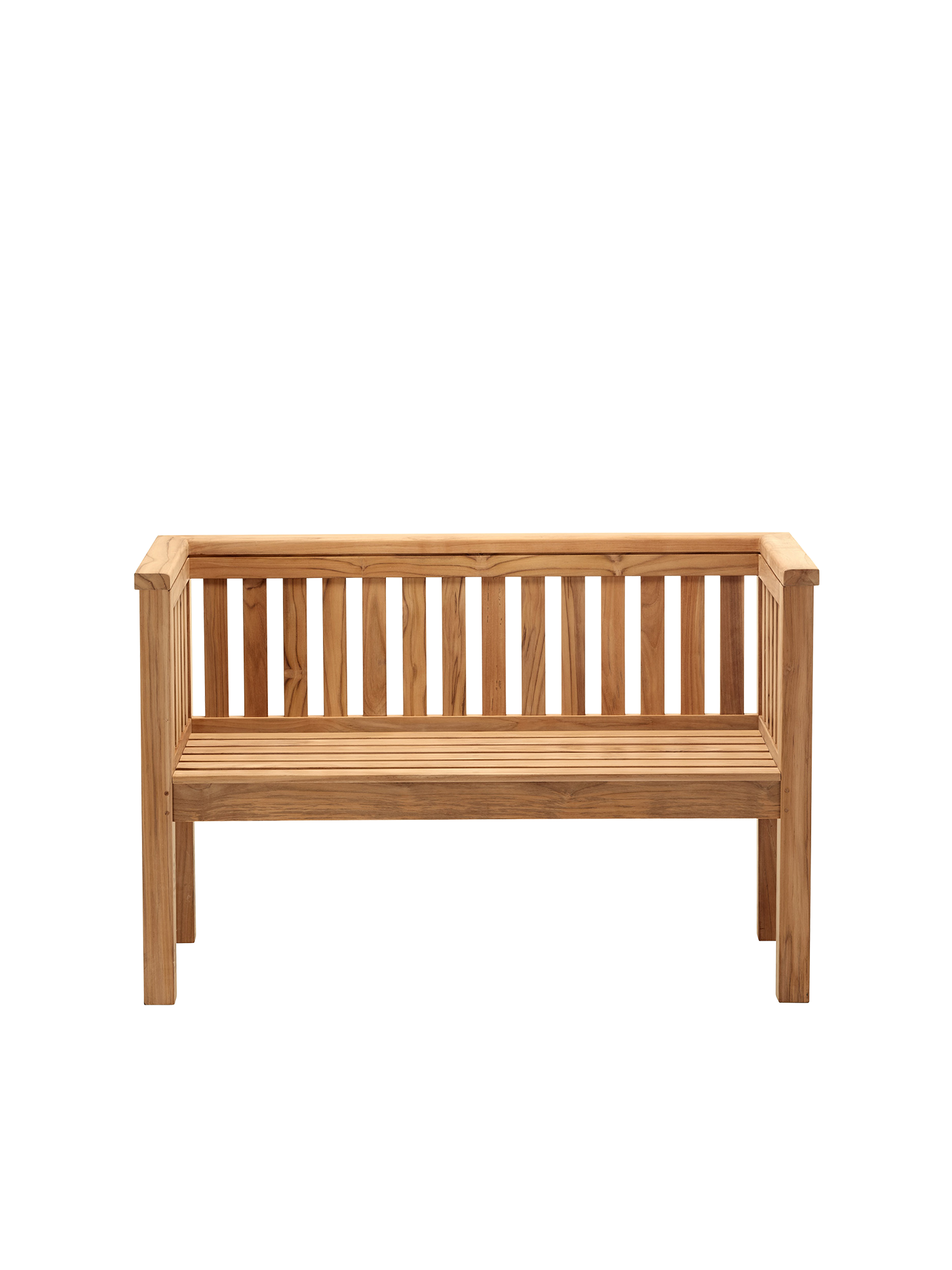 Sie schafft den perfekten Rückzugsort für ein gutes Buch oder ein anregendes Gespräch. Bei der geradlinigen Teakbank setzt sich die Rückenlehne auf gleicher Höhe in den Armlehnen fort und bietet so rundum Geborgenheit.