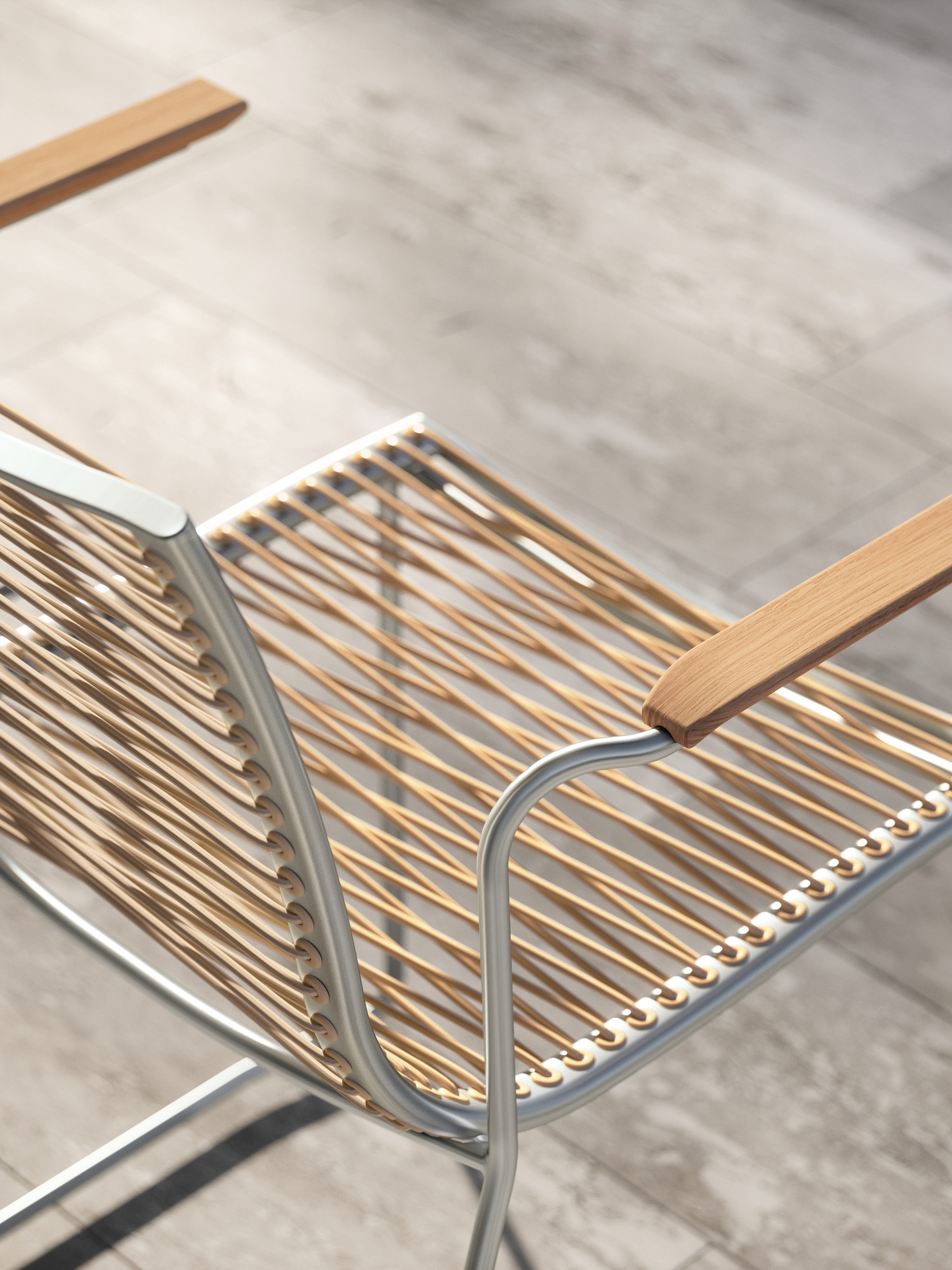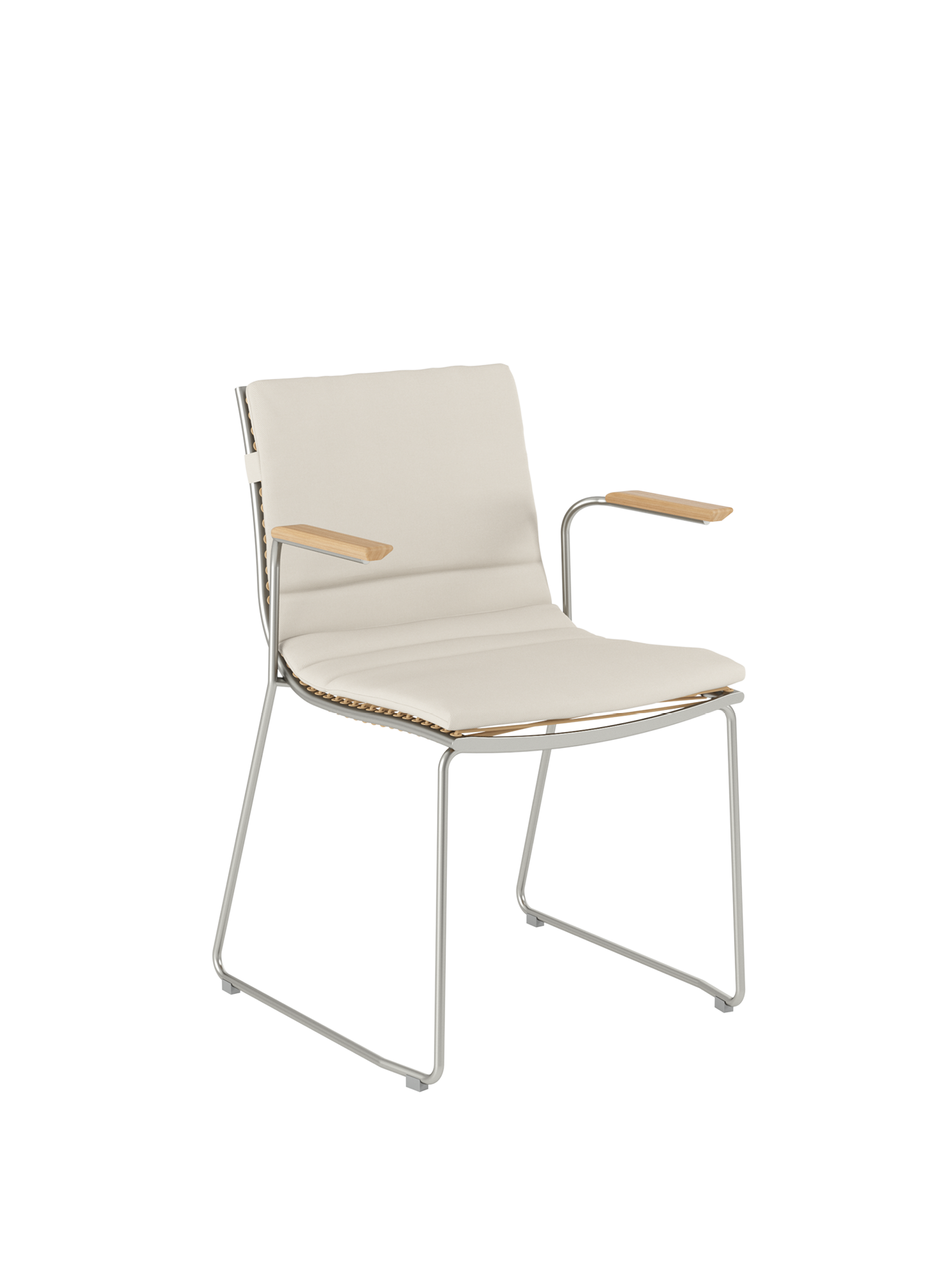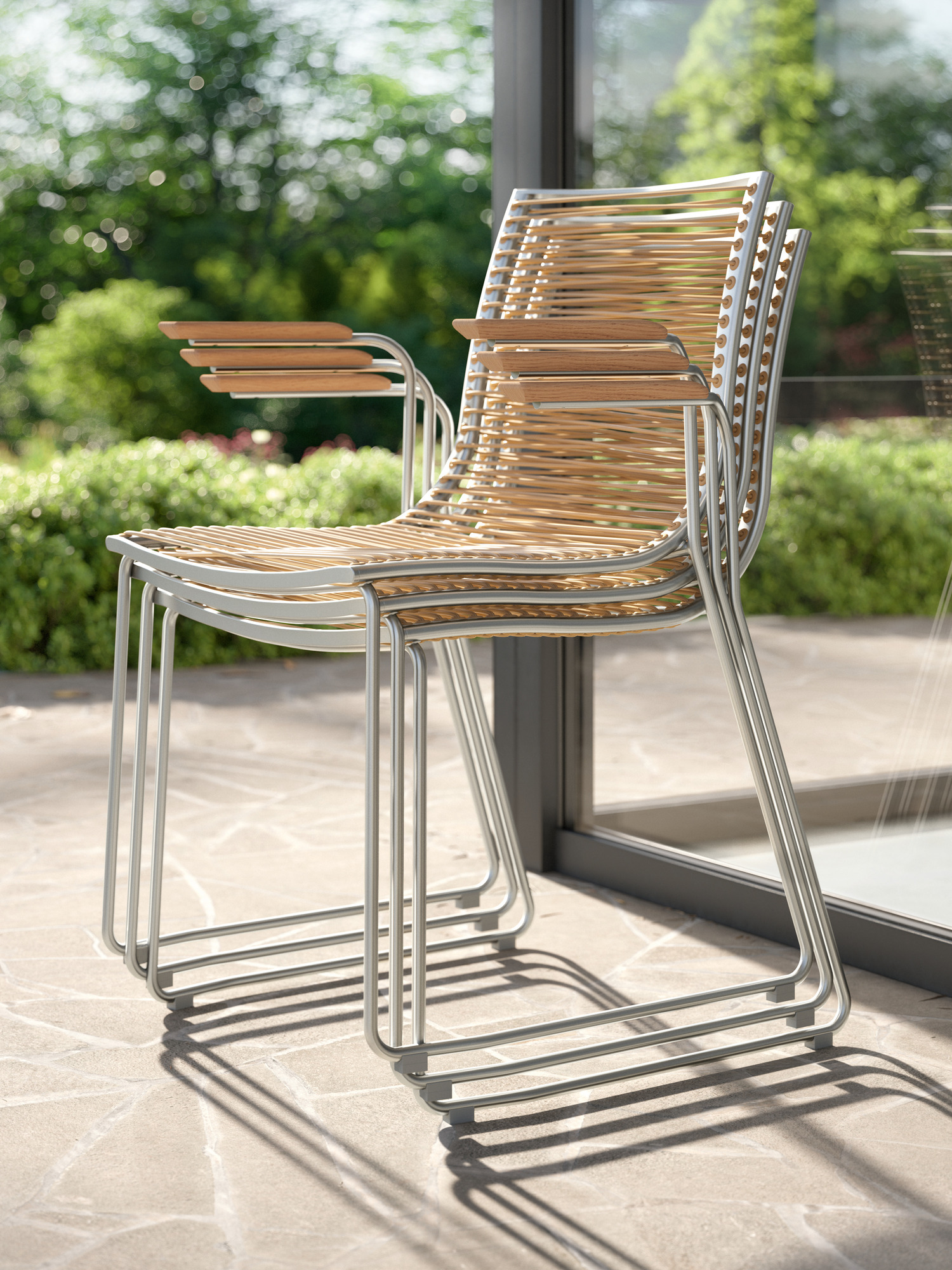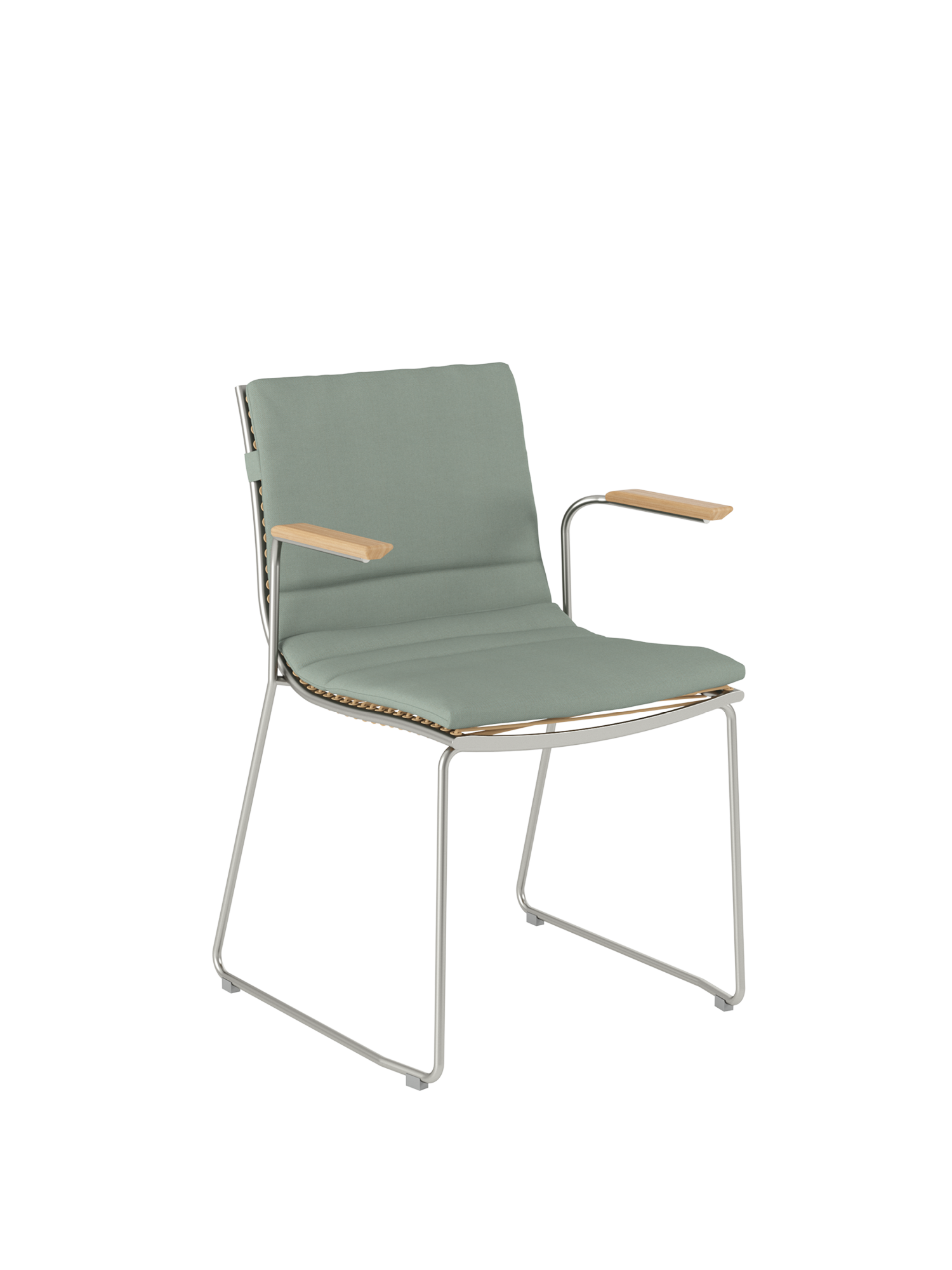 Pan wirkt luftig wie eine leichte Brise. Die eleganten, stapelbaren Stühle mit einem Edelstahlgestell sind mit einer dauerelastischen Faser bespannt, die sich bequem der Körperkontur anpasst.